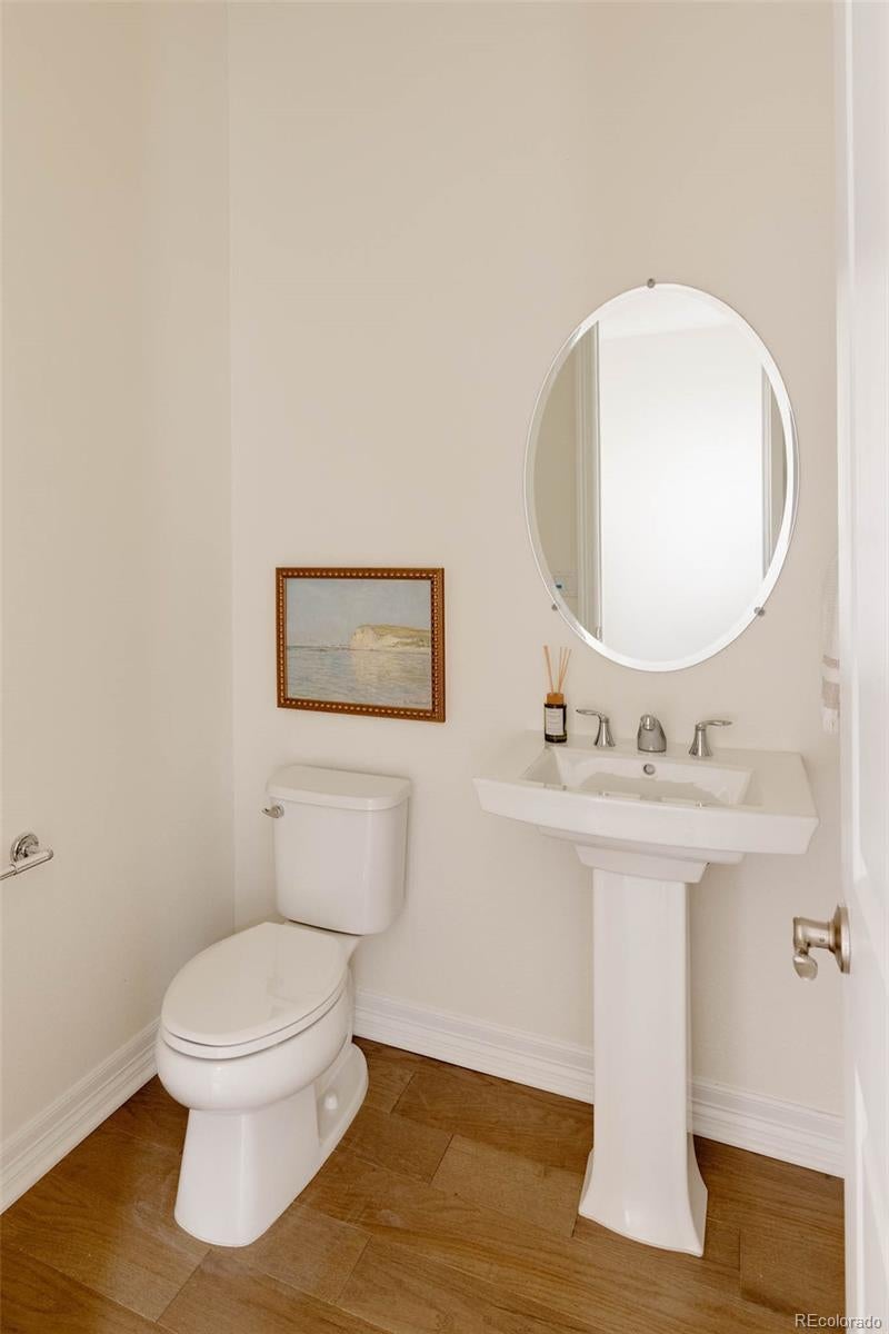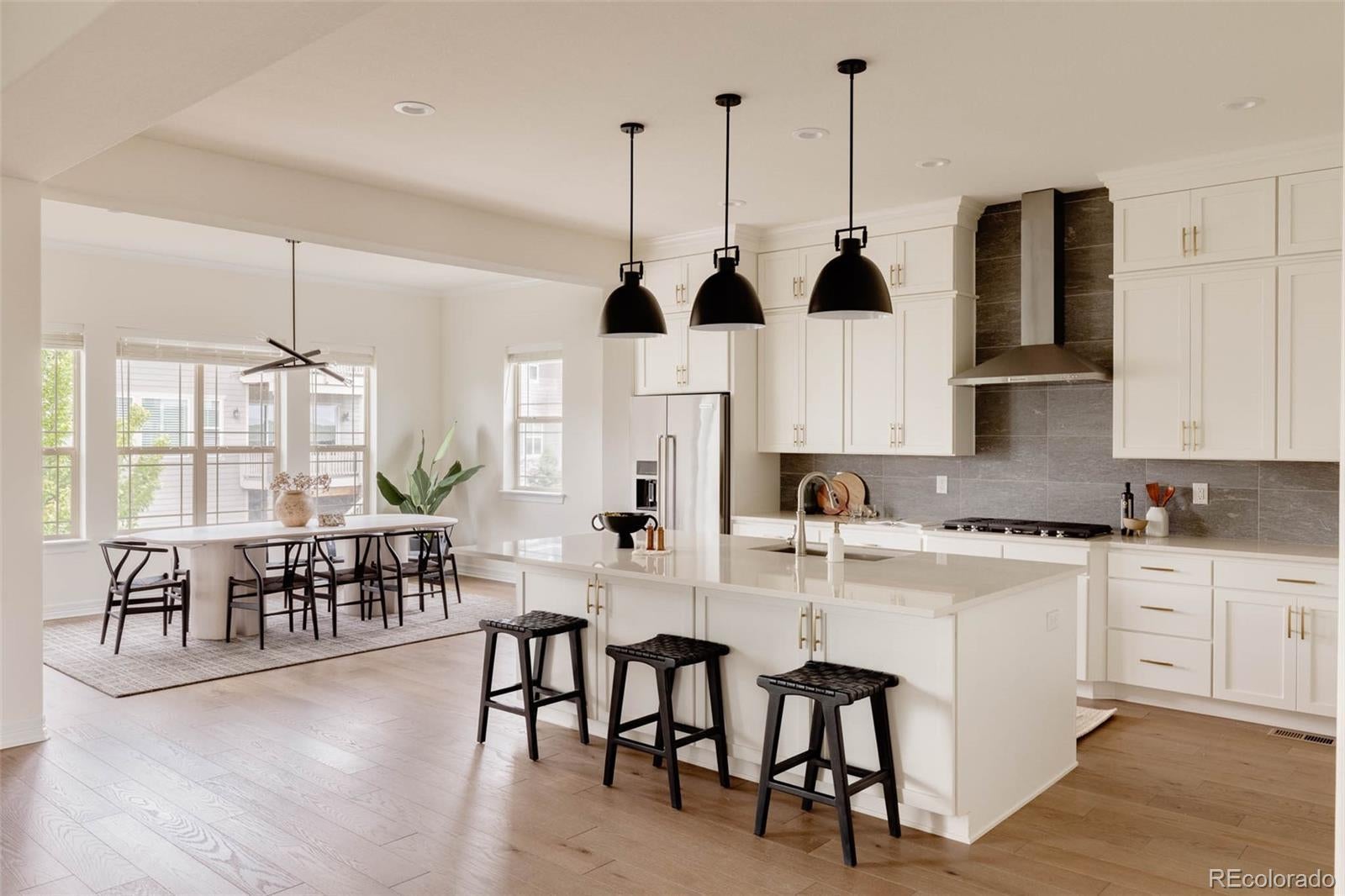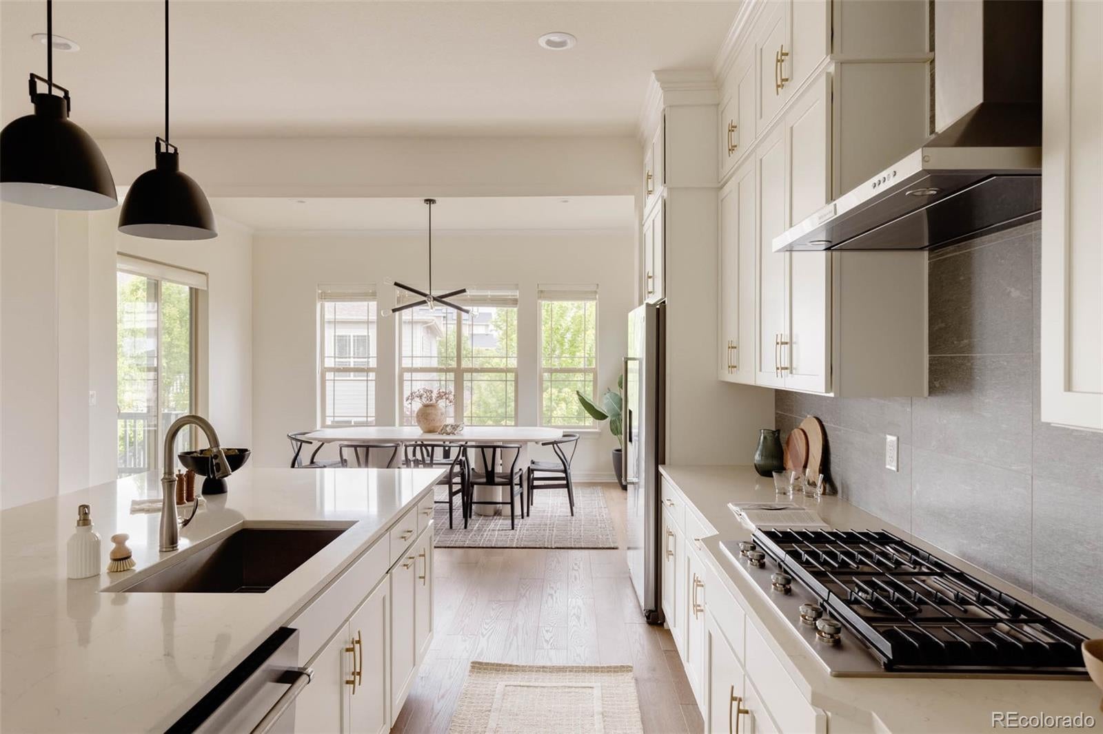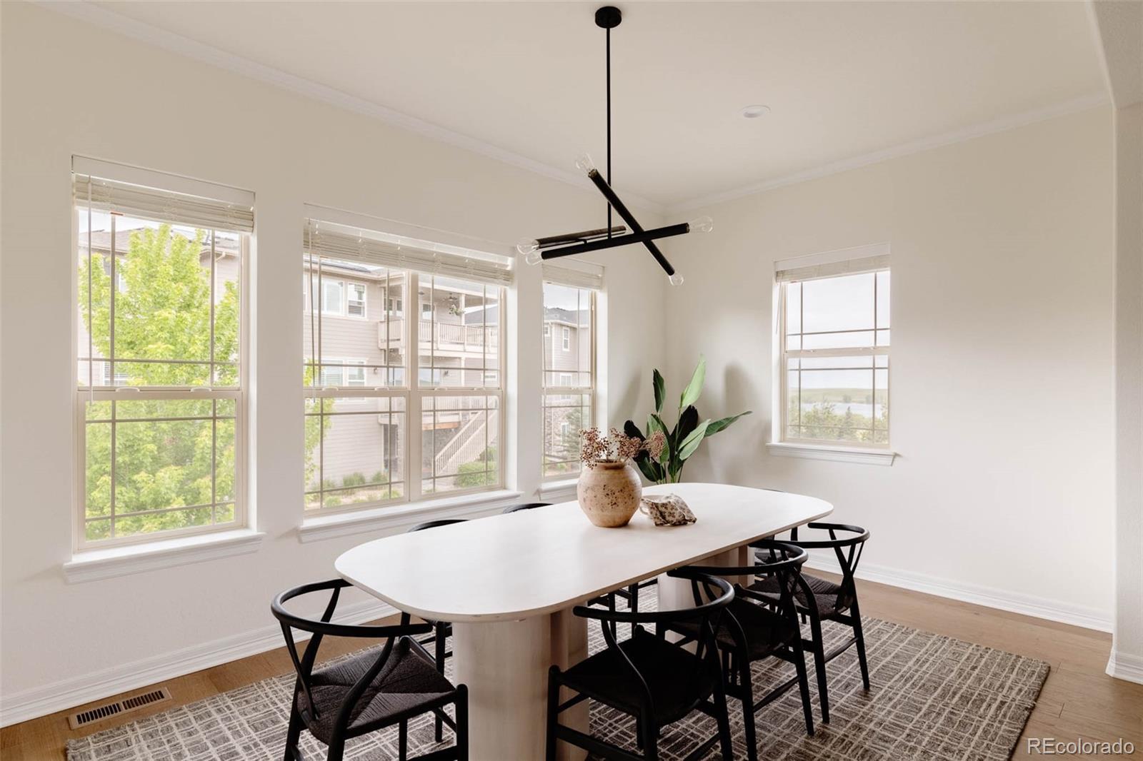Nestled between two resort-style clubhouses & pools, & part of the award-winning Cherry Creek School District, this home offers the best of Colorado living with scenic trails, vibrant parks, state-of-the-art fitness centers, & the Aurora Reservoir just steps away. Inside, the great room impresses with soaring 12-ft ceilings and a stunning 15-ft stacked slider framing reservoir views. A gas fireplace with tile surround anchors the space, complemented by engineered wide-plank oak floors & recessed LED lighting throughout. The kitchen shines with stacked white cabinetry to the ceiling, quartz countertops, designer lighting, an extended island perfect for entertaining, & upgraded stainless steel appliances including a gas range. A large pantry completes this space. The main level features a secondary bedroom with its own en-suite bath, providing comfort & privacy for guests or family. An additional bedroom with French doors can be used as a study, showcasing water views for an ideal work-from-home retreat. The primary suite is a sanctuary with a luxurious en-suite bath boasting double vanities, upgraded countertops, a large walk-in shower with floor-to-ceiling tile, a soaking tub & a large walk-in closet. The convenient mud/laundry room enhances daily organization. The garden-level unfinished basement is bright with six large windows & ready for your custom vision, including plumbing rough-in. Upgrades include custom blinds, enhanced sound & garage insulation, gas fireplace fan, in-line humidifier, & radon detection system. The three-car garage is pre-wired for an EV charger; the backyard is wired for a swim spa or hot tub. Outdoors, enjoy a beautifully landscaped yard with dual retaining walls & a custom water runoff channel. Relax on an expanded rear deck w/ water views. The deck includes a gas line is perfect for grilling & entertaining, while a hot/cold hose bib in the front yard adds extra convenience. A south-facing driveway ensures easy snowmelt in winter.