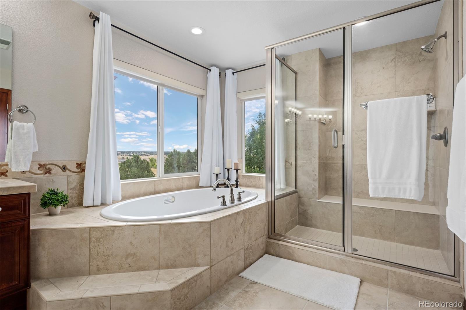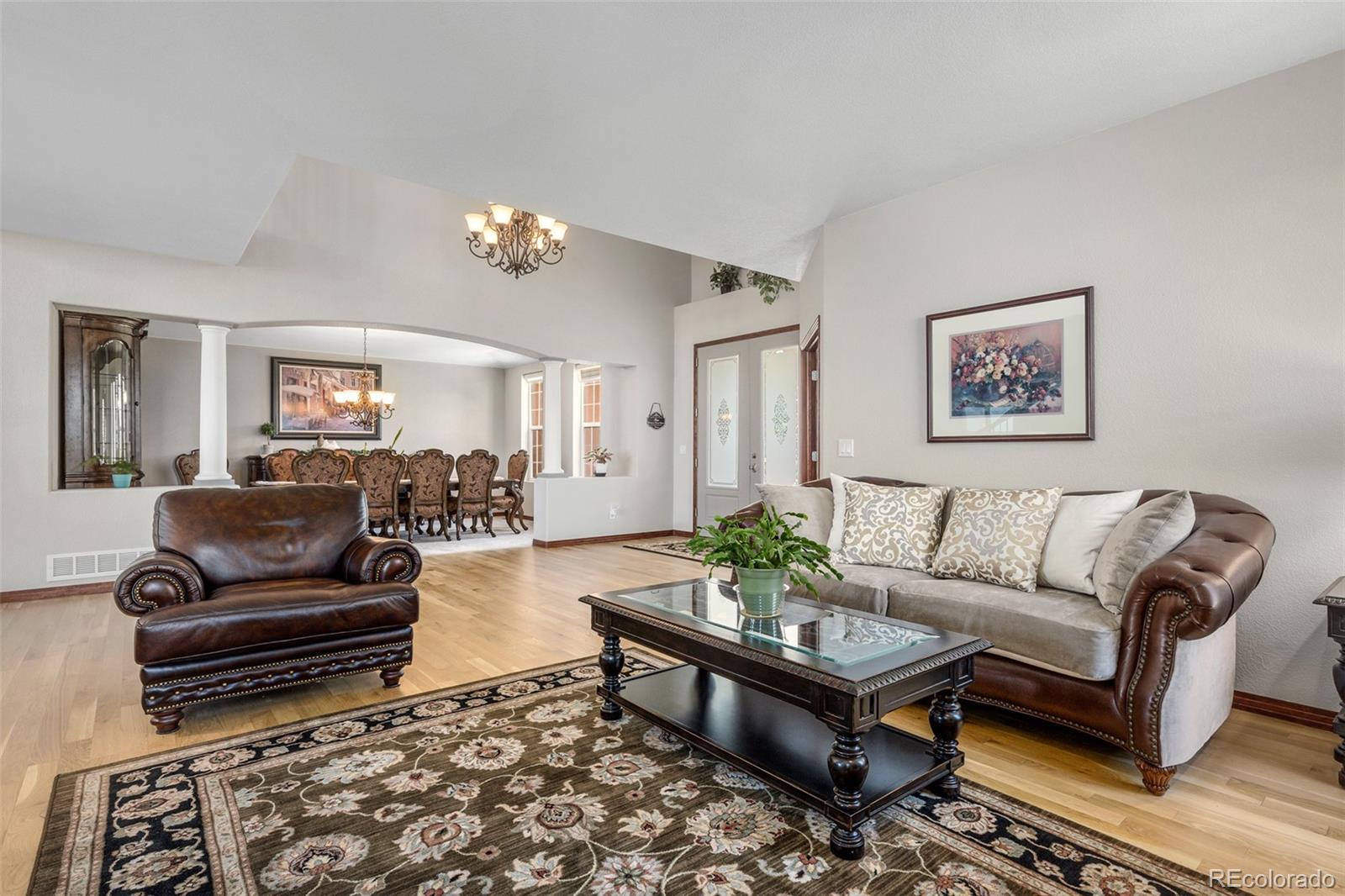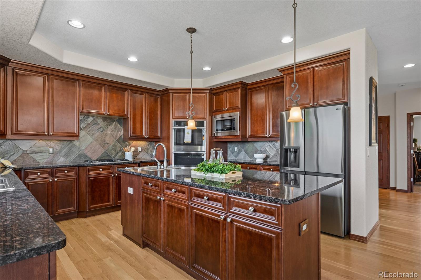 Back on market after buyers got cold feet. Exceptional Luxury Living in a Gated Douglas County Community. Prepare to be amazed by this stunning home with 7,000 finished sq ft set on over half an acre of beautifully landscaped grounds. With six spacious bedrooms, five bathrooms, and elegant touches throughout, this home offers the perfect blend of beauty and comfort. Step into a formal living room with a cozy fireplace and soaring ceilings, ideal for entertaining or relaxing in style. The large formal dining room sets the stage for memorable gatherings, while the expansive family room and gourmet kitchen — featuring beautiful cabinetry, granite countertops, gas range, stainless steel appliances, double oven, and a walk-in pantry — also make this a great gathering place for family and friends. A main floor office provides a quiet and functional space for work or study. The primary suite is a true retreat, complete with its own fireplace, a private sitting area with wet bar, and a luxurious 5-piece bath. Secondary bedrooms are generously sized with oversized closets and scenic views. The finished walkout basement adds incredible versatility, offering two additional bedrooms along with a two bathrooms, a full kitchen, and a massive great room — perfect for multi-generational living or guest accommodations. Outdoor living shines with a raised deck overlooking open space and twinkling Parker city lights, a spacious patio, fire pit area, and mature trees that provide privacy and serenity. A four-car tandem garage and main-floor laundry add convenience, while this gated community offers peace of mind and easy access to top-rated Douglas County schools. Located minutes from retail, dining, and entertainment in both Parker and Castle Rock, and the Club at Pradera golf course and country club, this home is a rare gem that truly has it all.