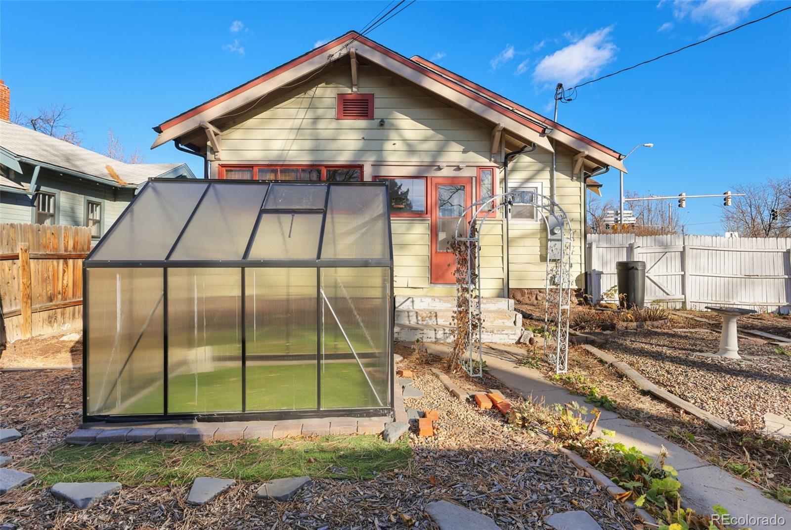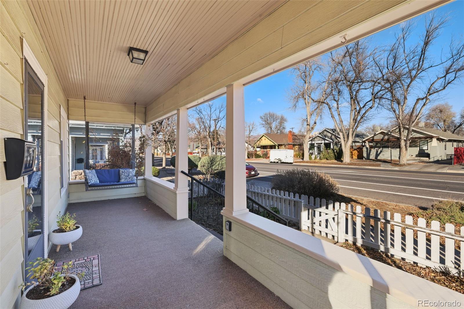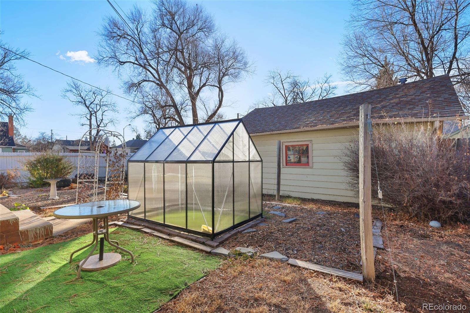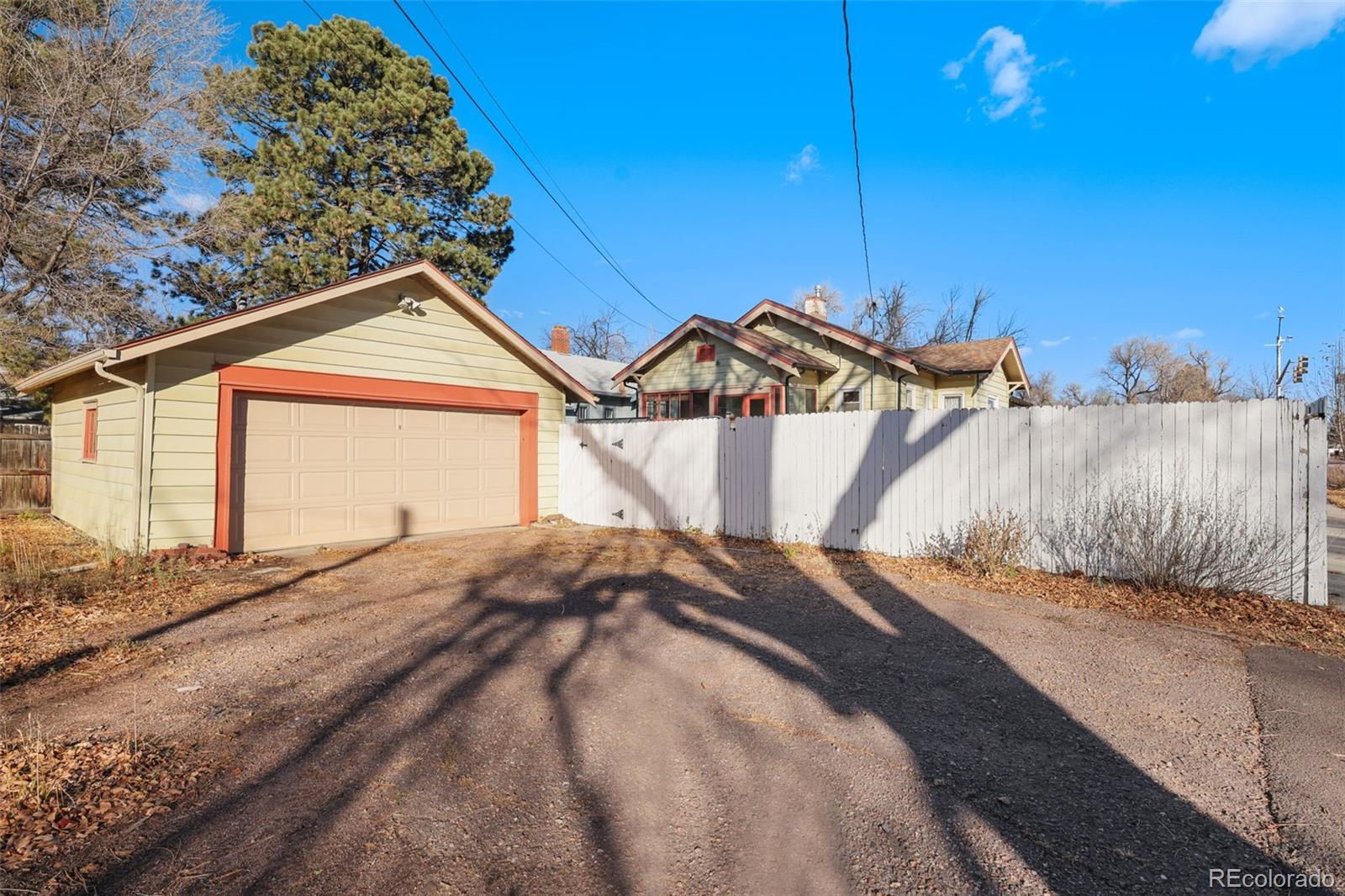 Welcome to this charming home bursting with curb appeal, set on a huge corner lot in a desirable neighborhood. A classic white picket fence, beautiful landscaping, and an established yard create a warm, inviting first impression. Enjoy relaxing on the covered front porch, or tending to your plants in the greenhouse tucked away in the fully fenced backyard. A detached 2-car garage offers plenty of storage and convenience. Step inside to find beautiful natural wood floors and the timeless character of unpainted wood trim and built-ins throughout much of the home. The bright and airy living and dining rooms are filled with natural light, creating perfect spaces for everyday living and entertaining. The chic, updated kitchen features stainless steel appliances, stylish functional shelving, and a seamless walk-out to the backyard—ideal for outdoor dining or gatherings. The primary bedroom includes two closets for abundant storage. The basement offers additional versatility with a bedroom space and a convenient laundry area. Ceiling fans in nearly every room help keep the home cool and comfortable all summer long. Located just one block from Steele Elementary and near Patty Jewett Golf Course, Safeway, Bonforte and Nancy Lewis Parks, the Pikes Peak Greenway Trail, and an array of restaurants, coffee shops, and breweries, this home truly blends charm, comfort, and convenience. Don’t miss the opportunity to make this delightful property yours!