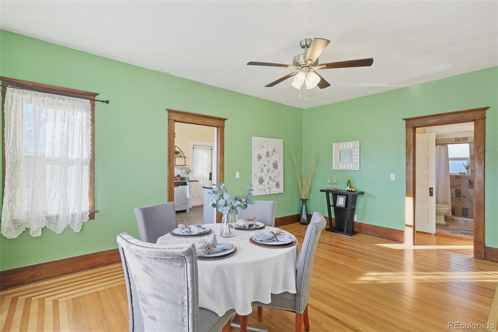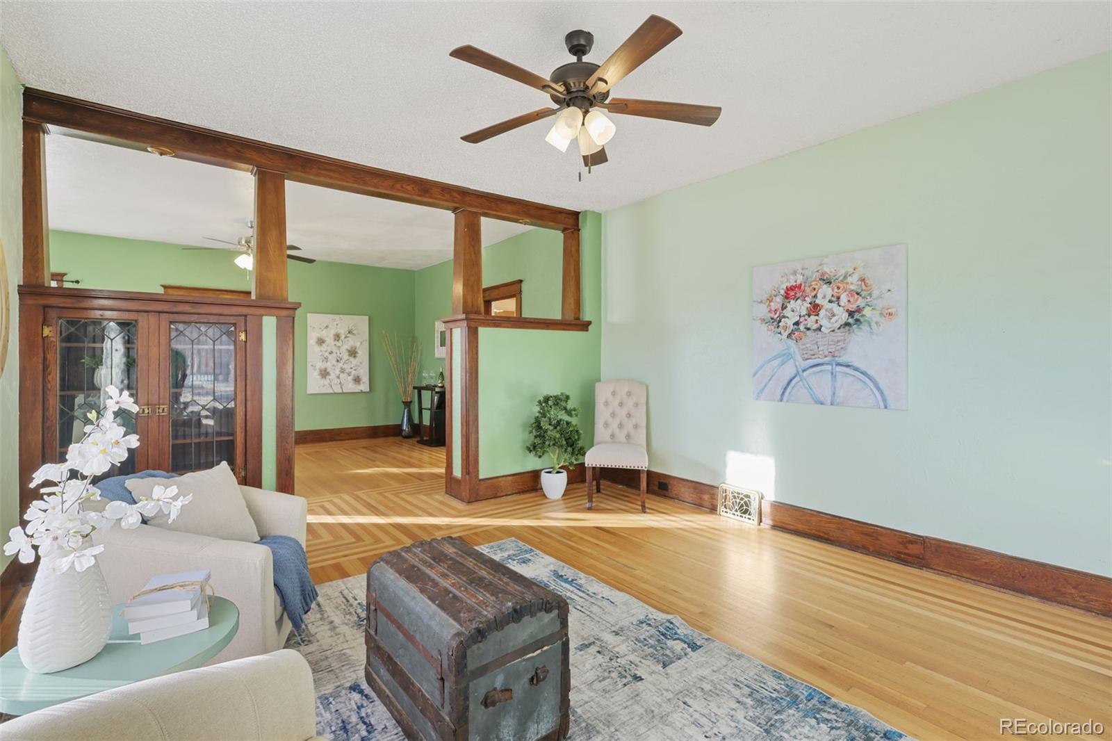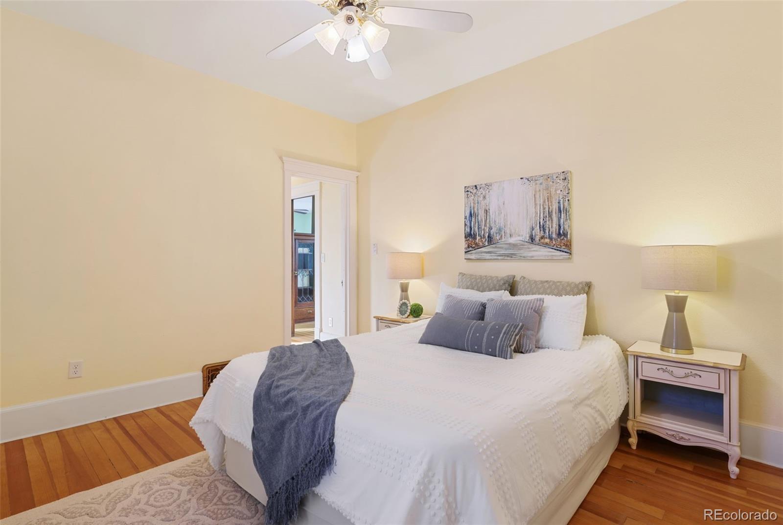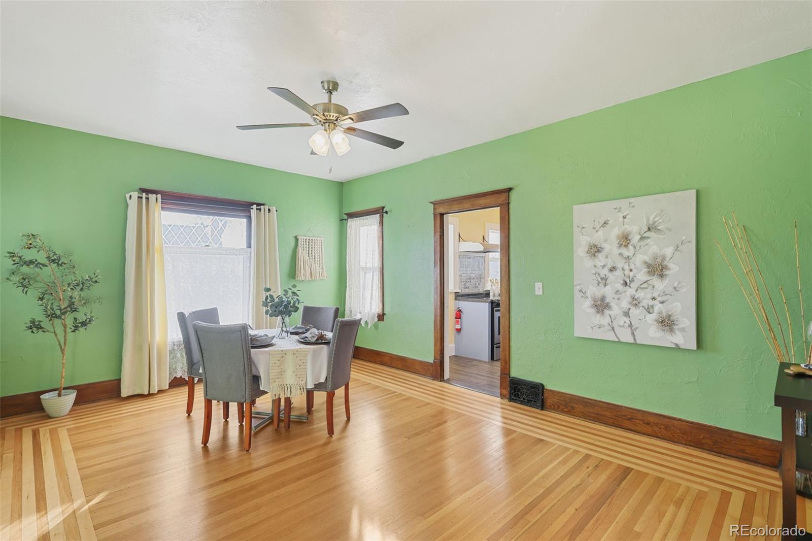 Welcome to this charming home bursting with curb appeal, set on a huge corner lot in a desirable neighborhood. A classic white picket fence, beautiful landscaping, and an established yard create a warm, inviting first impression. Enjoy relaxing on the covered front porch, or tending to your plants in the greenhouse tucked away in the fully fenced backyard. A detached 2-car garage offers plenty of storage and convenience. Step inside to find beautiful natural wood floors and the timeless character of unpainted wood trim and built-ins throughout much of the home. The bright and airy living and dining rooms are filled with natural light, creating perfect spaces for everyday living and entertaining. The chic, updated kitchen features stainless steel appliances, stylish functional shelving, and a seamless walk-out to the backyard—ideal for outdoor dining or gatherings. The primary bedroom includes two closets for abundant storage. The basement offers additional versatility with a bedroom space and a convenient laundry area. Ceiling fans in nearly every room help keep the home cool and comfortable all summer long. Located just one block from Steele Elementary and near Patty Jewett Golf Course, Safeway, Bonforte and Nancy Lewis Parks, the Pikes Peak Greenway Trail, and an array of restaurants, coffee shops, and breweries, this home truly blends charm, comfort, and convenience. Don’t miss the opportunity to make this delightful property yours!