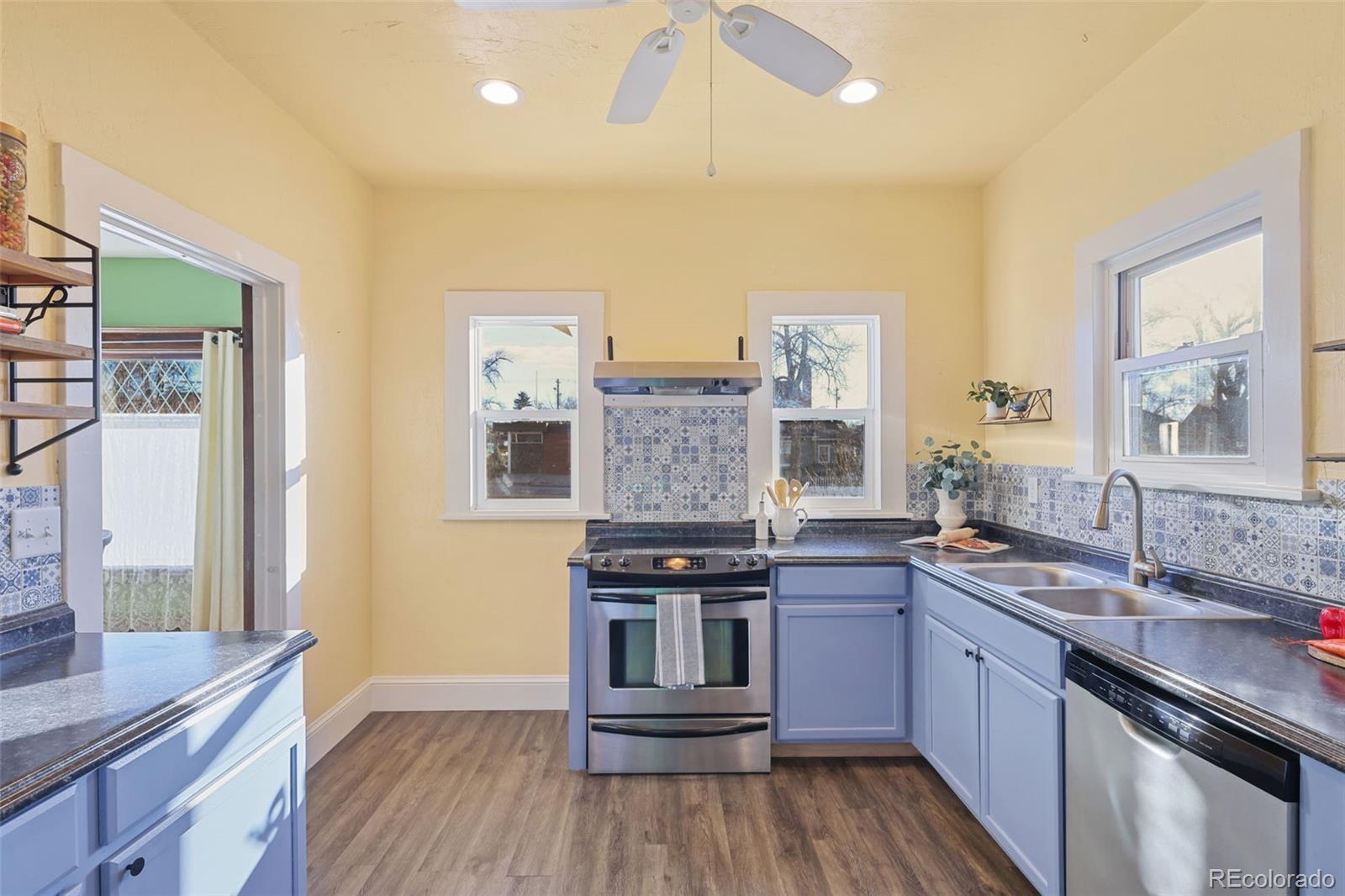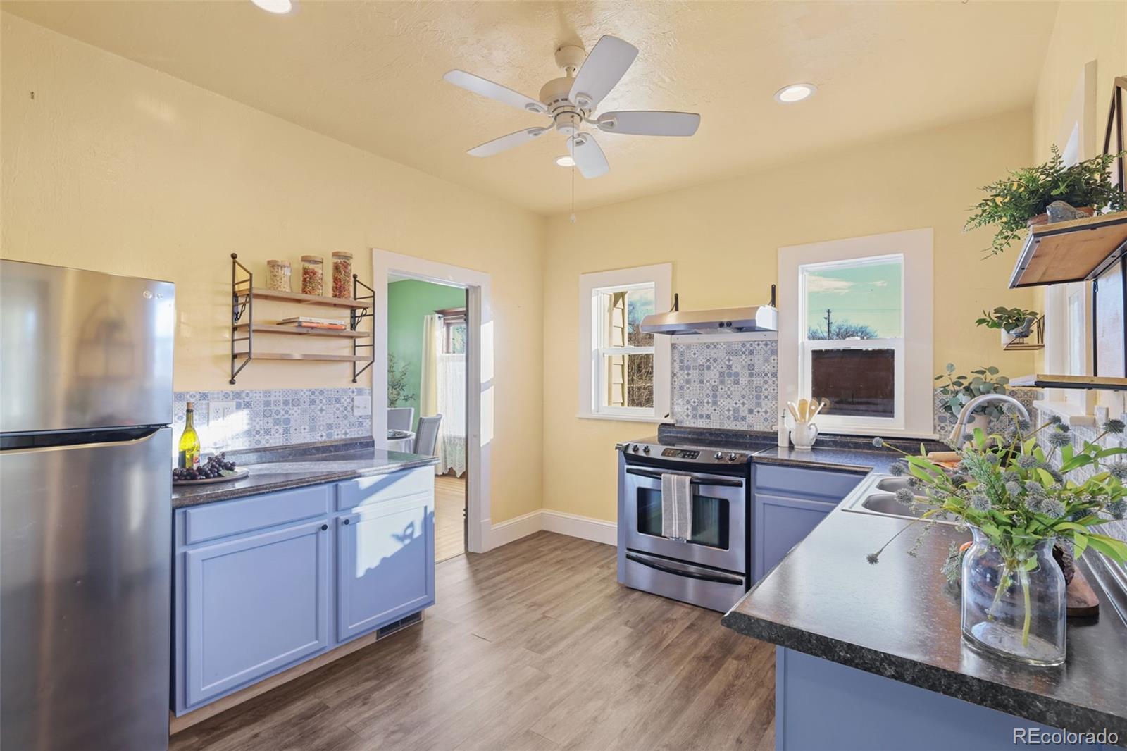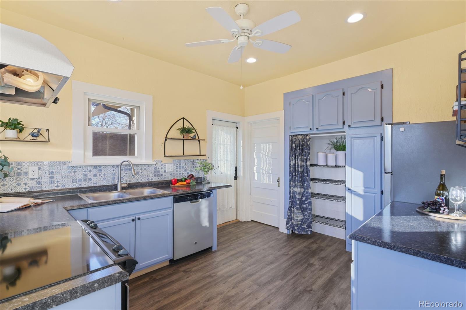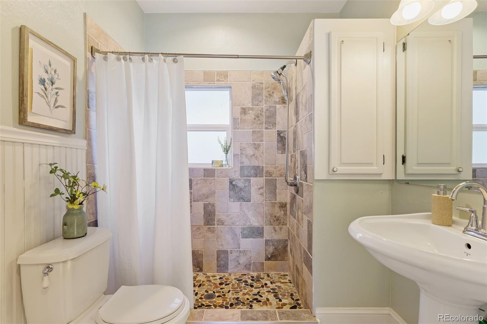 Welcome to this charming home bursting with curb appeal, set on a huge corner lot in a desirable neighborhood. A classic white picket fence, beautiful landscaping, and an established yard create a warm, inviting first impression. Enjoy relaxing on the covered front porch, or tending to your plants in the greenhouse tucked away in the fully fenced backyard. A detached 2-car garage offers plenty of storage and convenience. Step inside to find beautiful natural wood floors and the timeless character of unpainted wood trim and built-ins throughout much of the home. The bright and airy living and dining rooms are filled with natural light, creating perfect spaces for everyday living and entertaining. The chic, updated kitchen features stainless steel appliances, stylish functional shelving, and a seamless walk-out to the backyard—ideal for outdoor dining or gatherings. The primary bedroom includes two closets for abundant storage. The basement offers additional versatility with a bedroom space and a convenient laundry area. Ceiling fans in nearly every room help keep the home cool and comfortable all summer long. Located just one block from Steele Elementary and near Patty Jewett Golf Course, Safeway, Bonforte and Nancy Lewis Parks, the Pikes Peak Greenway Trail, and an array of restaurants, coffee shops, and breweries, this home truly blends charm, comfort, and convenience. Don’t miss the opportunity to make this delightful property yours!