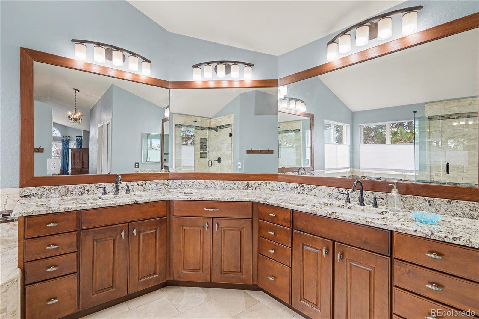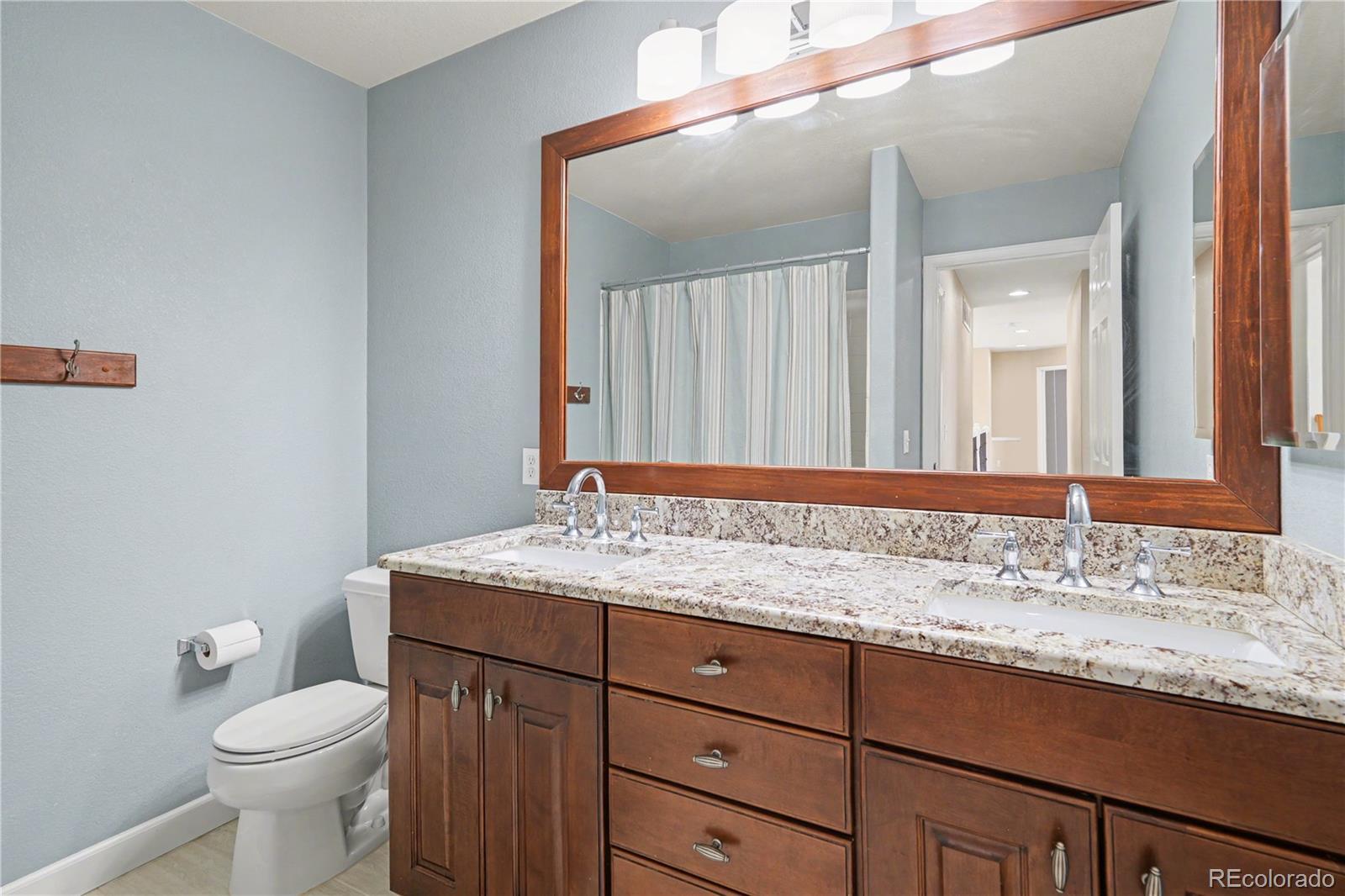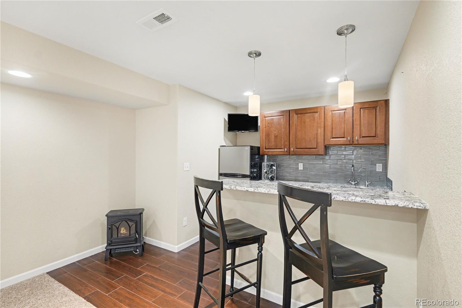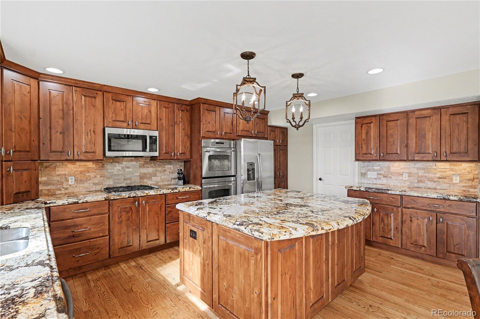 This stunning Clarke Farms home has been meticulously maintained and thoughtfully updated by its original owners, offering over 3,800 square feet of beautifully finished living space, including a finished basement and a 3-car garage. A dramatic brick arch and exceptional curb appeal create an unforgettable first impression.Designed with both everyday living and entertaining in mind, the highly functional floorplan offers seamless flow between formal and casual spaces. The spacious entry opens to soaring ceilings and a showpiece staircase with elegant iron railing. Formal living and dining rooms are perfectly positioned for gatherings, while the expansive great room connects effortlessly to the fully remodeled custom kitchen featuring high-end cabinetry, a massive island, stainless steel appliances, granite slab countertops, and hardwood flooring throughout the entry, hall, and kitchen. A main-floor bedroom adds flexibility for guests, multigenerational living, or a private office.Upstairs, a catwalk overlooks the entry and living room below, enhancing the home’s open architectural feel. Generously sized secondary bedrooms provide comfort and privacy. The luxurious primary suite is a private retreat with a spa-inspired bath showcasing marble finishes, upgraded cabinetry, granite countertops, and frameless glass shower doors. The finished basement expands the home’s versatility with a bar area, full bathroom, and abundant storage—ideal for entertaining,hobbies, or recreation. Step outside to a lighted custom deck, perfect for relaxing evenings or hosting under the Colorado sky. The backyard provides direct access to the scenic Cherry Creek Trail and is within walking distance to downtown Parker, local amenities, and highly rated schools—offering an exceptional blend of comfort, convenience, and lifestyle in one of Parker’s most desirable neighborhoods.