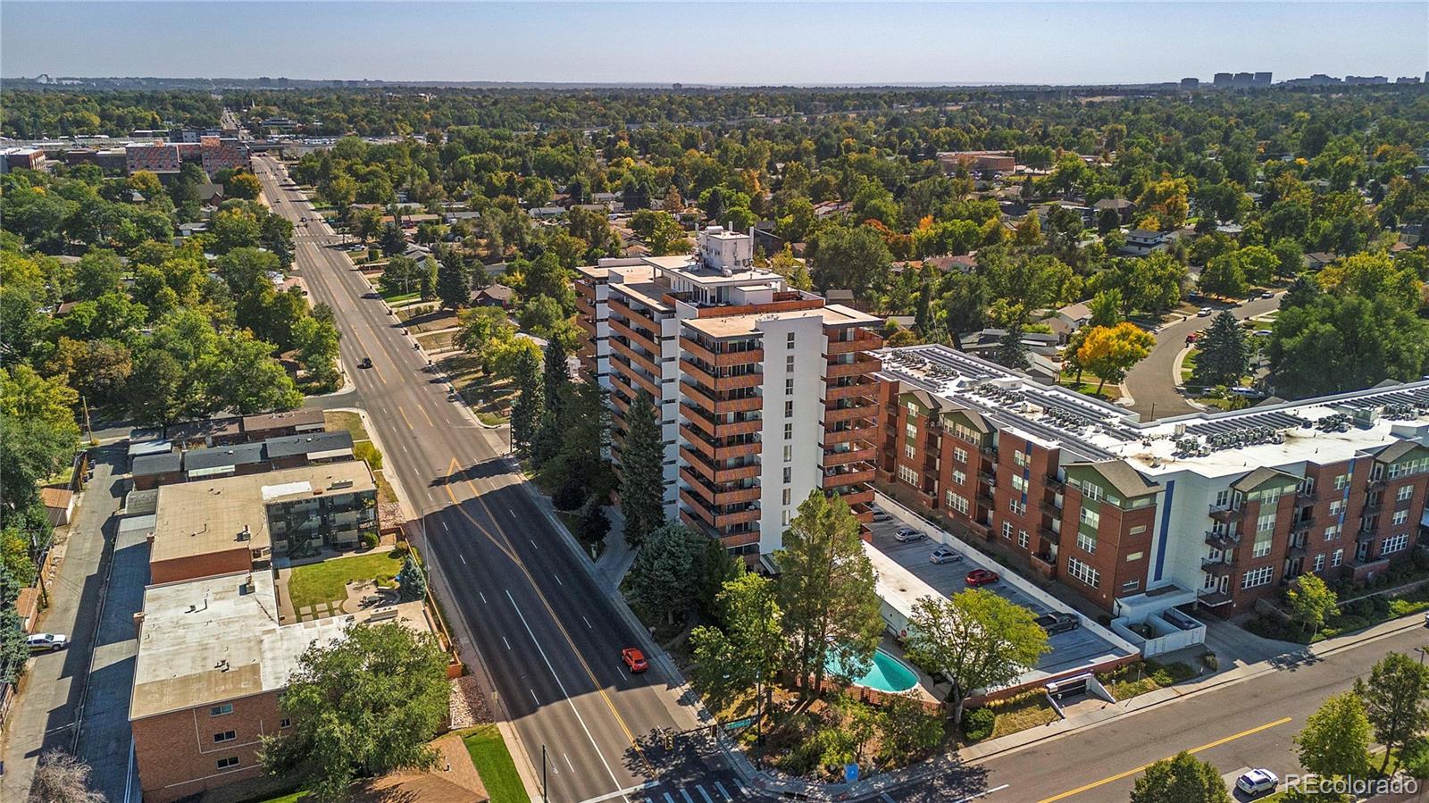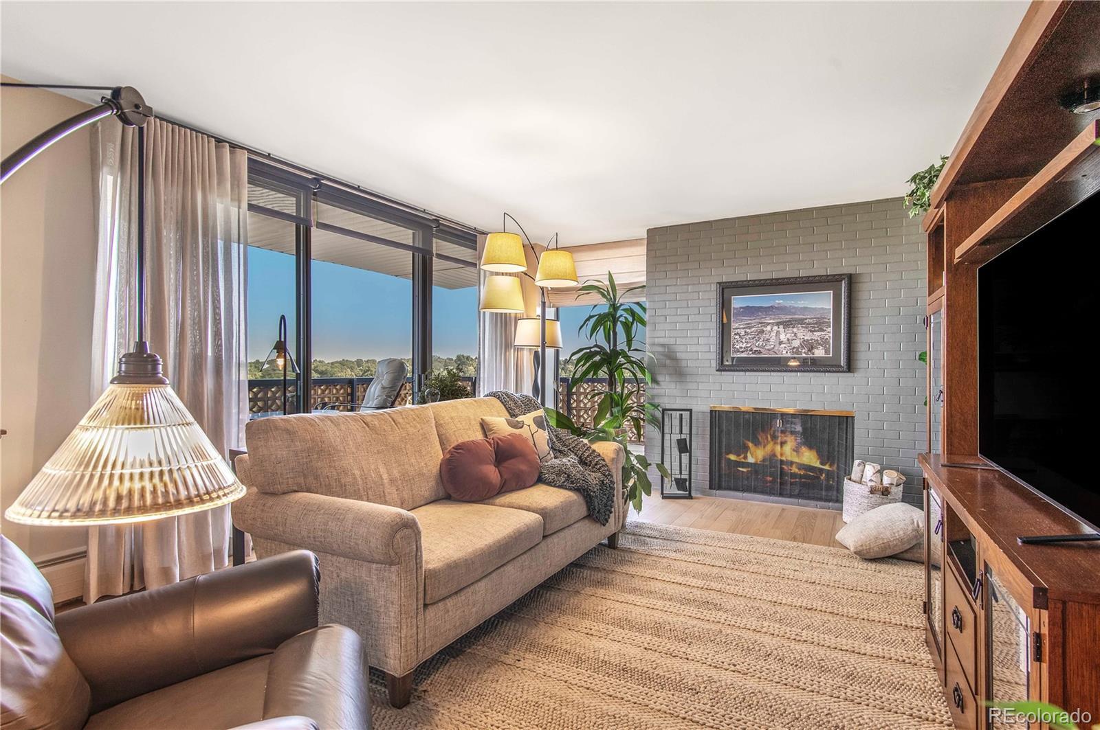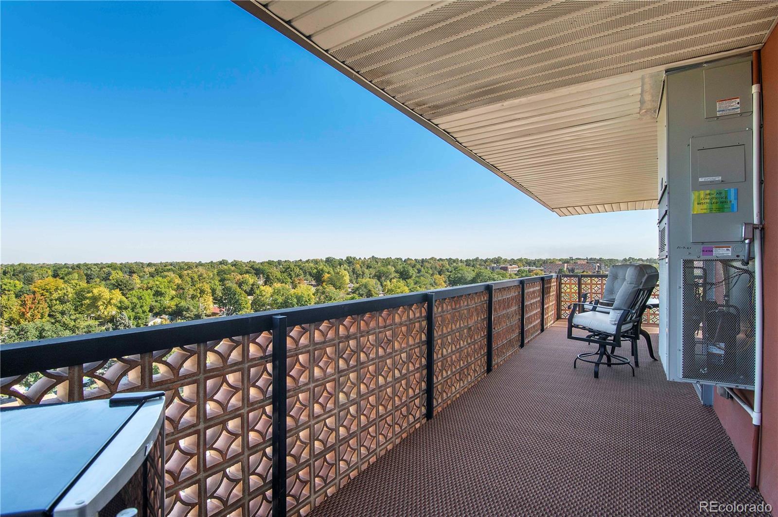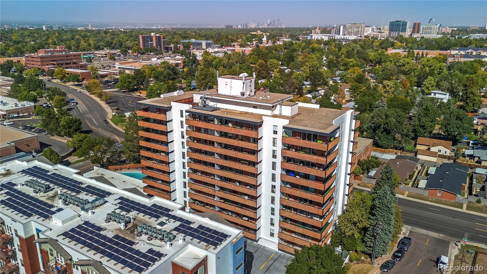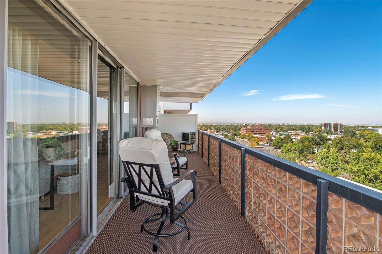 Views AND Location. This is the one. Welcome to this elevated turnkey corner unit, in the desirable LaFontana in University Hills! This Condo is in a high end mid century modern secure building. Tons of natural light, wrap around deck and spectacular views of Downtown and the front range. Two bedrooms and two upscale bathrooms anchor this unit, with light hardwood floors connecting all the living spaces. This unit boasts an open layout which joins the dining space with the living room and a custom granite center Island that seats 4 comfortably. A luxury kitchen with granite backsplash, custom cabinetry, soft close drawers, a pantry with Elfa shelving and Bosch appliances. The spacious primary bedroom has room for a king size bed and plenty of space to spare. The private ensuite with a space saving pocket door mirrors the kitchen counters with a gorgeous granite vanity, and a beautifully tiled tub and shower ensemble. A generous size walk in closet with an Elfa organization system to accomodate any neccesary storage demands. Secondary bedroom is light and bright with Elfa shelving to organize the space. Air conditioner was replaced in 2021. Custom blinds with pinpoint remote control accuracy, keep the cool in and the heat out. Two (2) parking spaces included,#65 in the parking garage (oversized), and #111 in the outdoor lot is reserved for your use. Laundry is conveniently located by the elevator on every floor. Walk to Sprouts, King Soopers, Starbucks, Einsteins, Chez Artiste and more. Convenient to Yale Light Rail Station. Building amenities include an outdoor pool, a Sauna and a gym. Invite your friends over to enjoy the Community room and the ROOFTOP TERRACE with views of Downtown and the Front Range. Take advantage of this opportunity to live a low maintenance lifestyle in University Hills.