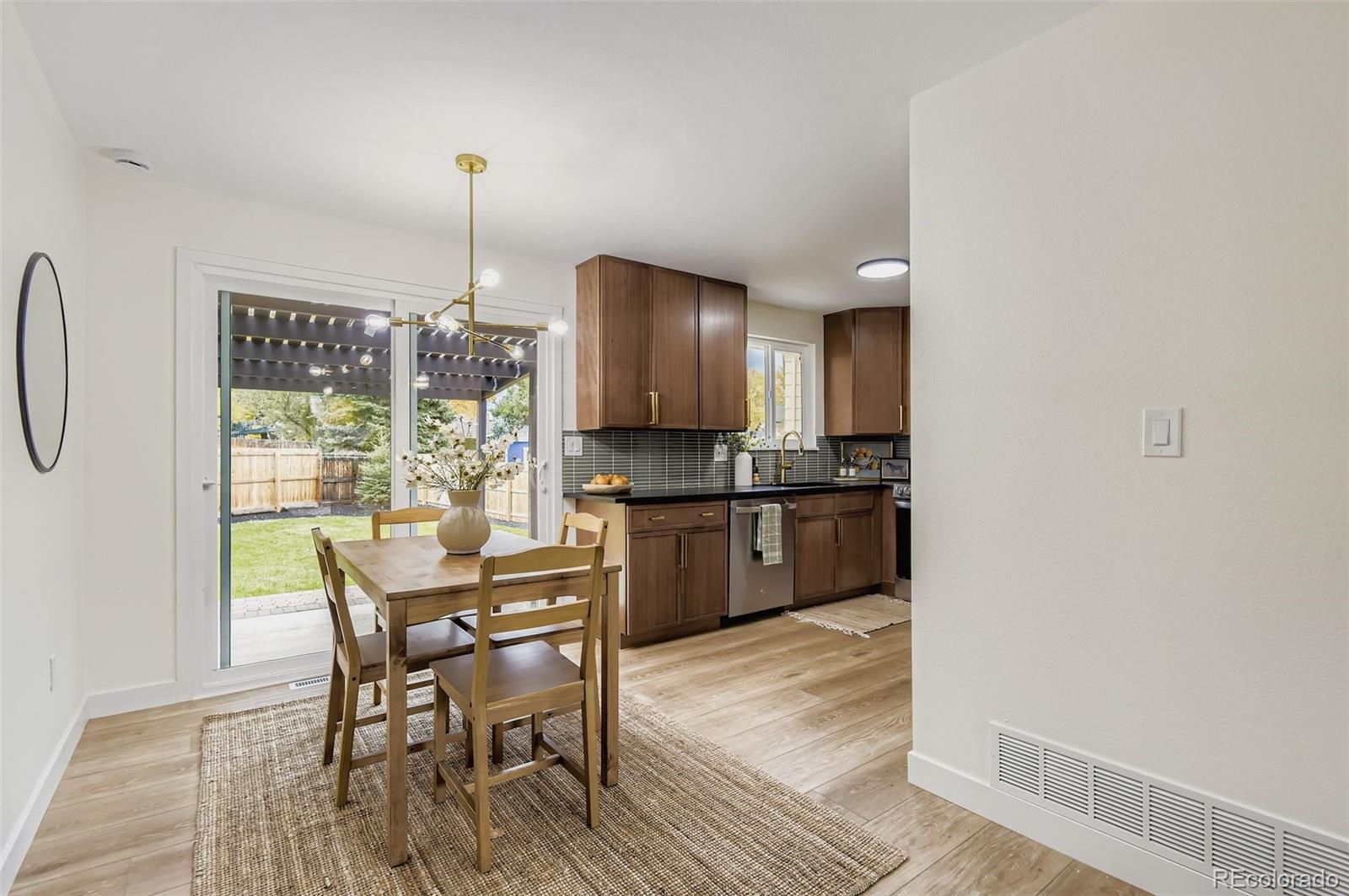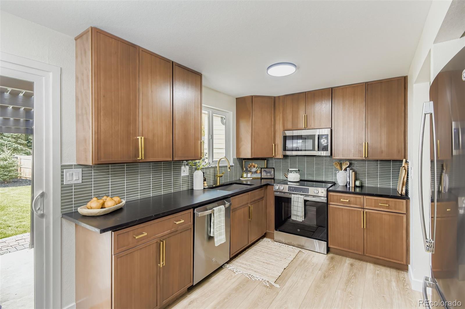 Ideally situated in one of Centennial's most family-friendly communities, 7385 S Elm Court offers contemporary living in a reimagined and fully renovated tri-level home. All-new exterior paint, fresh low-maintenance landscaping, and new windows greet you from the street with instant curb appeal. The main living spaces are defined by intentional design, seamless flow, and refined finishes throughout including beautiful vinyl plank flooring, designer lighting, modern hardware, and new interior paint. Enjoy preparing a meal in the show-stopping kitchen featuring brand-new cabinetry, granite counters, a stainless steel appliance package, and custom tile backsplash. Step out the large glass slider to the covered patio, ready for summer BBQs and effortless entertaining. The backyard is complete with a new fence, a lush lawn, and professional landscaping. Two generously sized secondary bedrooms and a spacious primary offer ample room for functional living and share two fully-renovated bathrooms. Family movie nights are ideal in the lower level family room, or cozy up by the wood burning fireplace on cool, Colorado evenings. Ridgeview Hills Park is ideally located within walking distance to award-winning Ford Elementary and neighborhood parks. Lifetime Fitness, Tony’s Market, and endless shopping and dining at the Streets at Southglenn are only moments away. This stunning residence is ready for its next chapter, all it needs now is you!