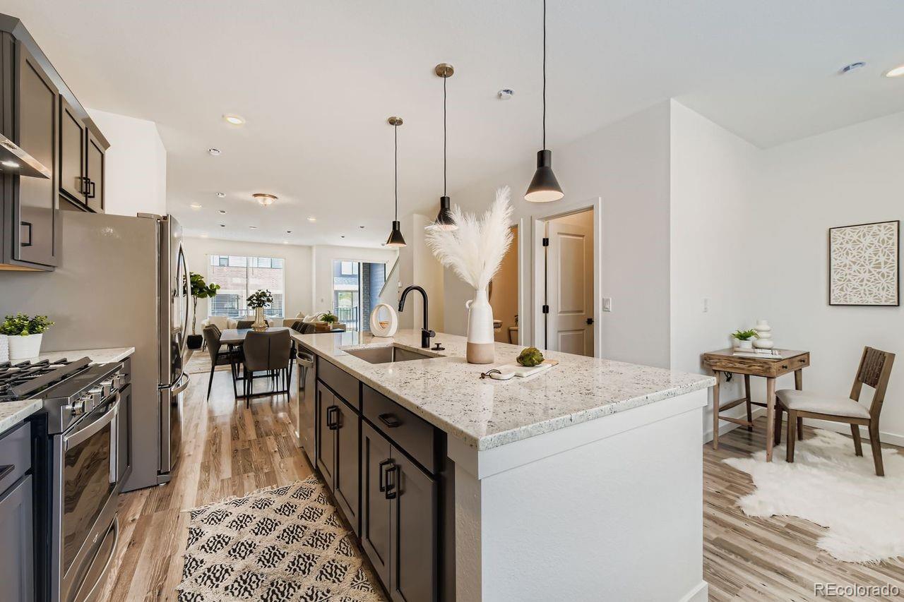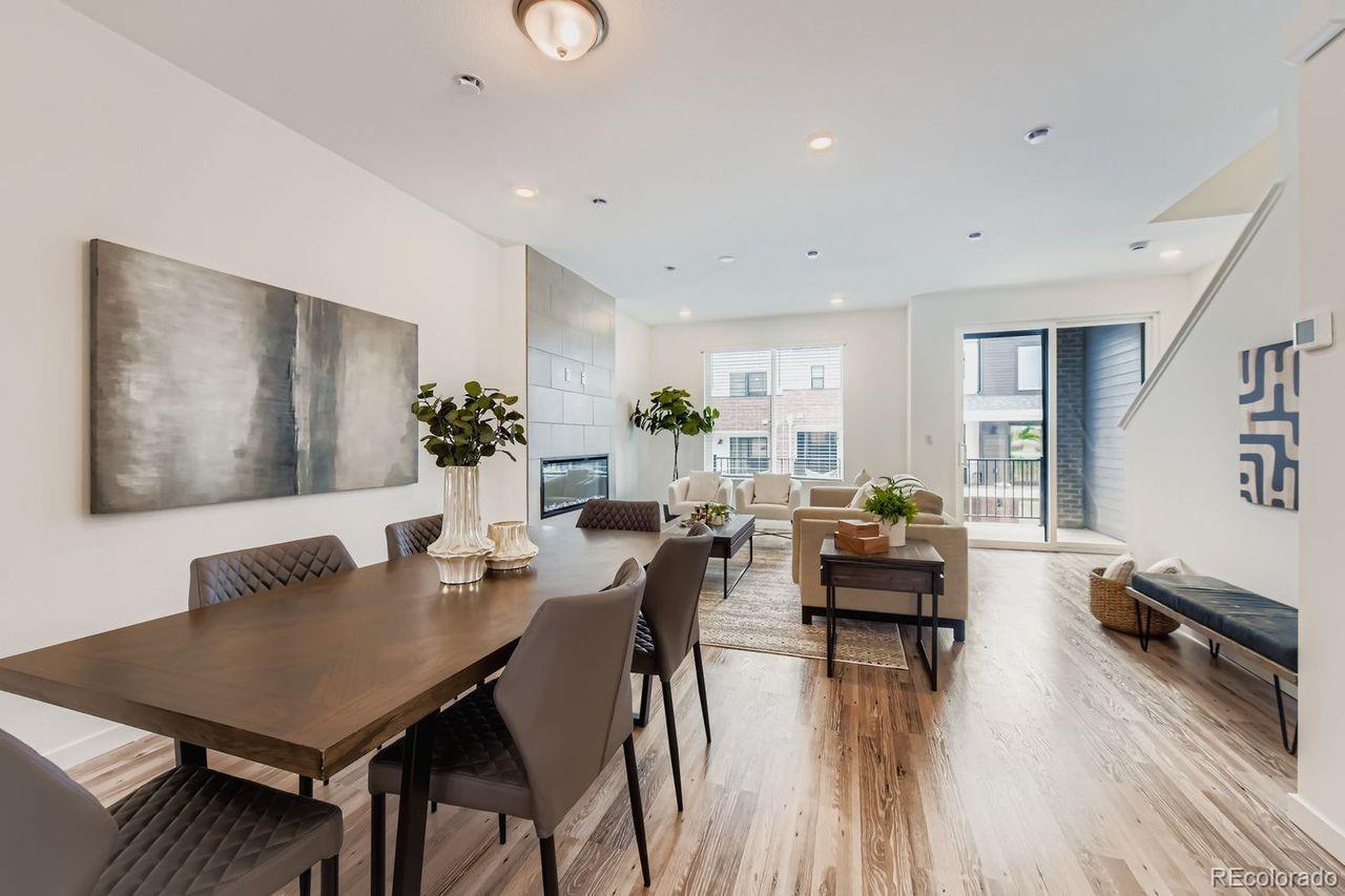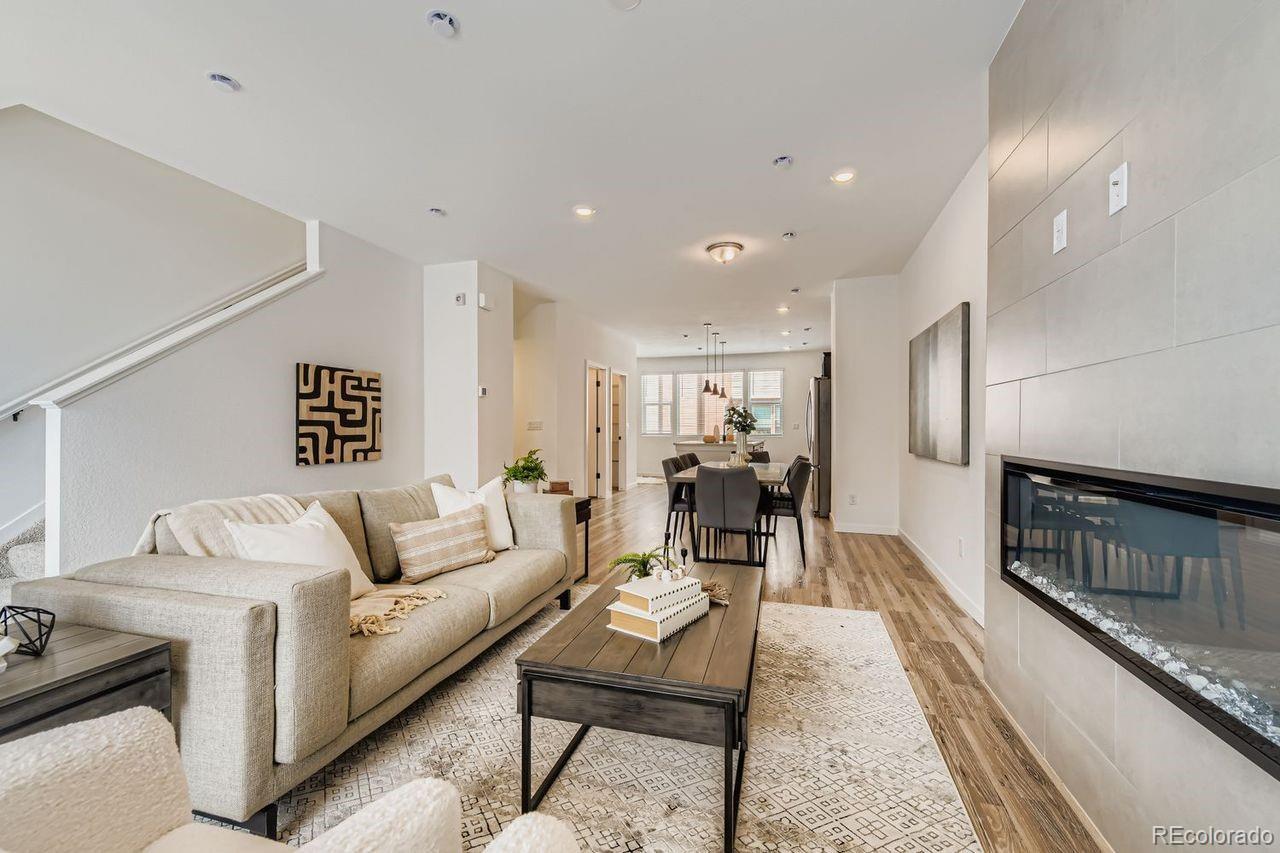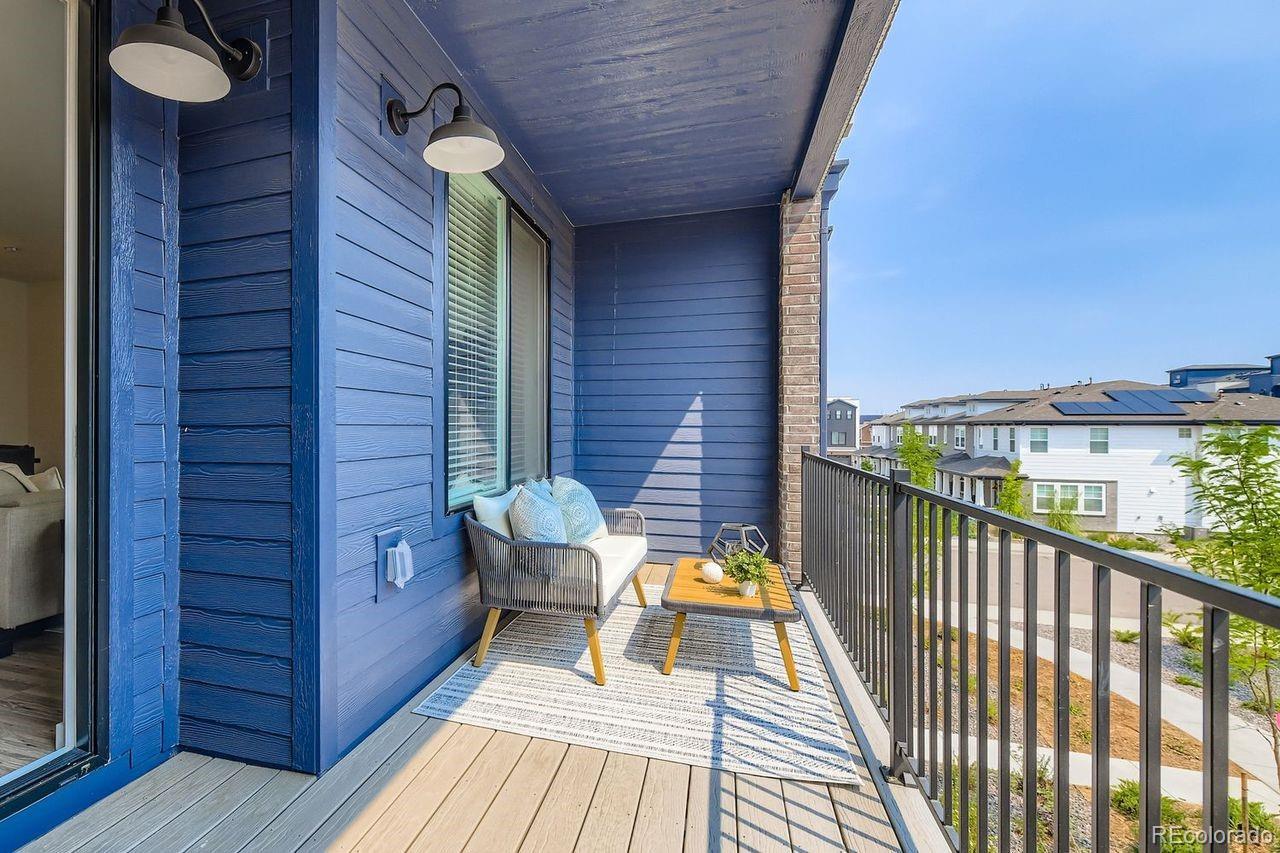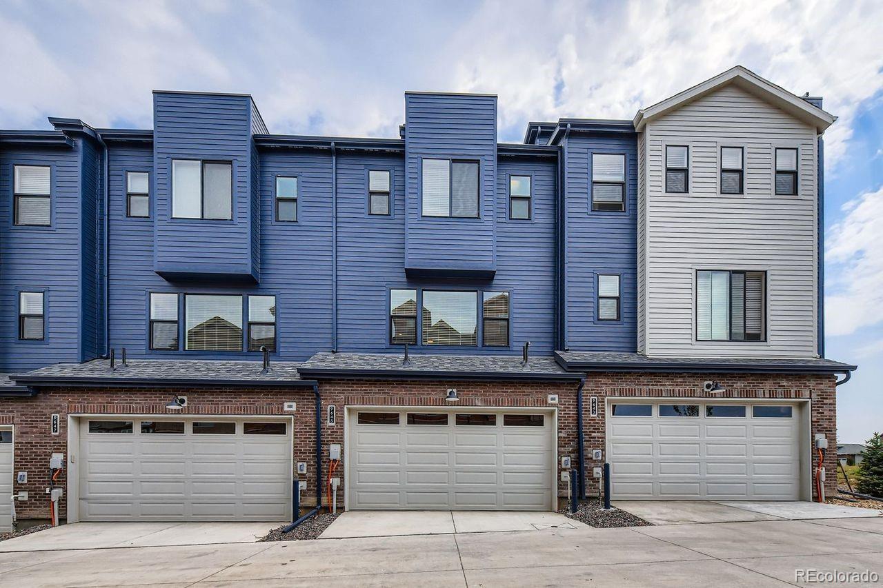 MOVE-IN READY 3-story townhome offers luxurious living in Prospect Village at Sterling Ranch! Enjoy the expansive great room with contemporary electric fireplace and soaring 9’ ceilings on both the main and upper levels creating a bright and airy living space. The stylish chef kitchen features 42" charcoal gray cabinets, granite countertops, tile backsplash, and premium stainless Whirlpool® appliances including 5-burner gas range, hood, and built-in microwave. Relax in the luxurious owner's suite featuring an oversized walk-in shower with a bench and a spacious walk-in closet with access to the upper level laundry room. Separate bedroom and full bath on the entry level provide privacy and flexibility for guests or a home office. High-quality finishes and attention to detail are evident throughout the home offering both elegance and functionality. Located in the vibrant Prospect Village at Sterling Ranch, this townhome offers easy access to community amenities, parks, and trails. Experience the best of luxury living in a prime location. Schedule your showing today and make this stunning townhome your own!
