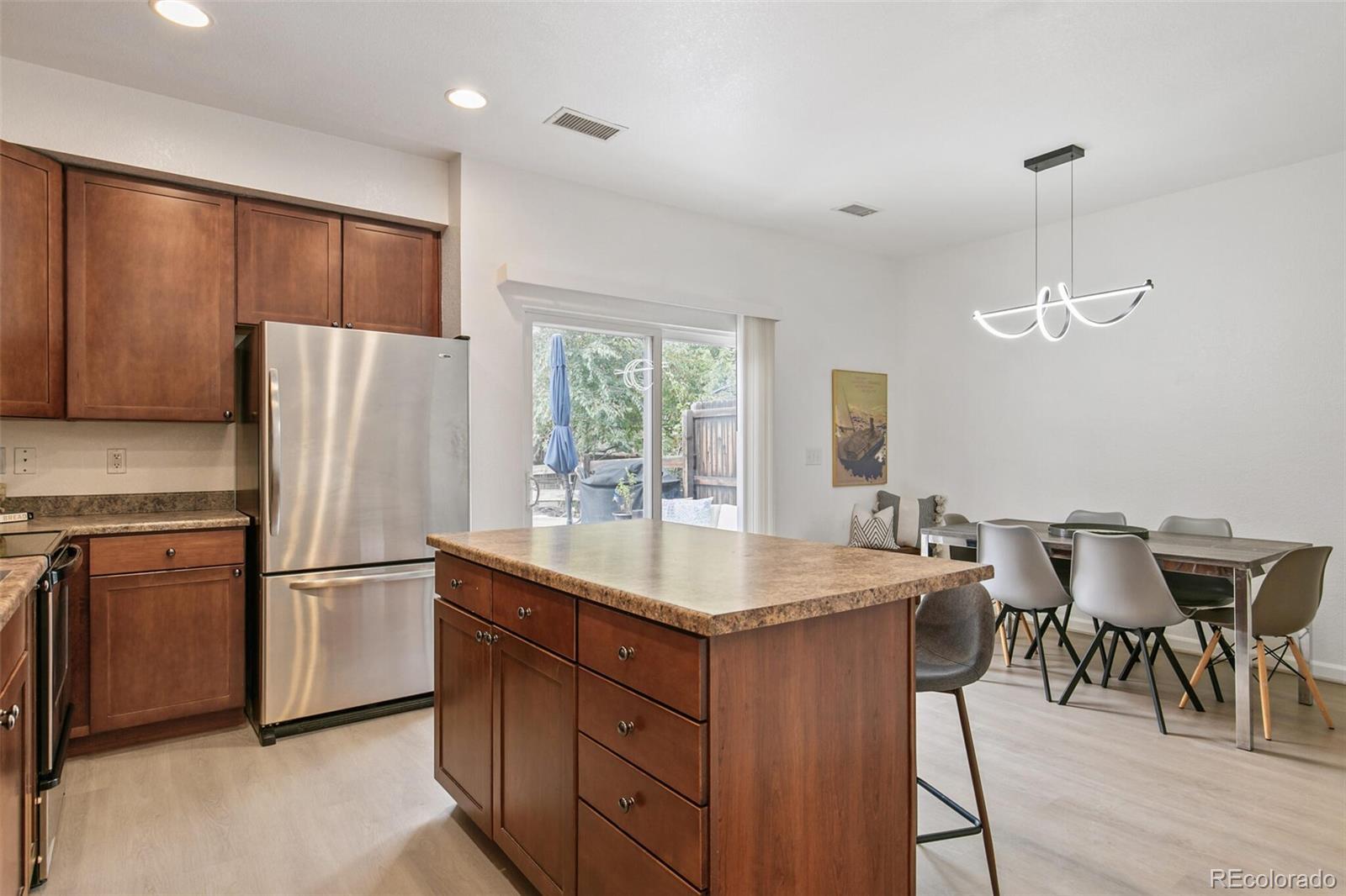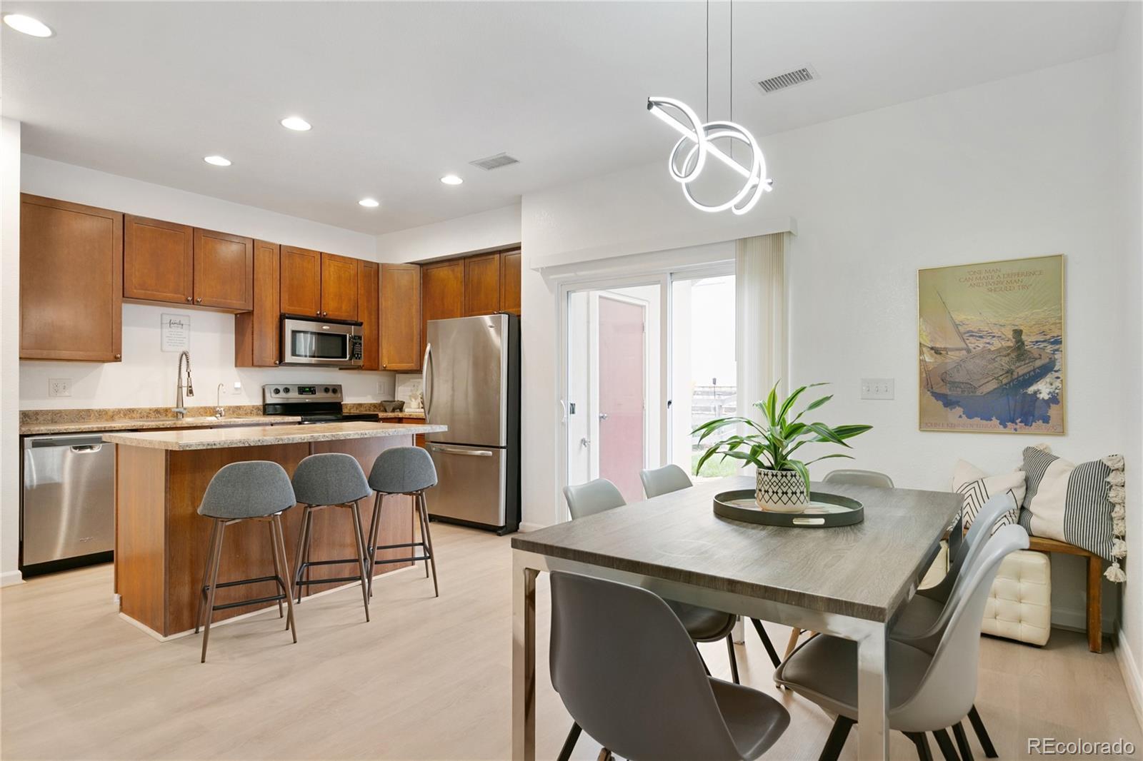 If you are looking for a RECENTLY REMODELED townhome that feels like new and lives like a single family home- with a private yard IDEAL FOR PETS, and ALL 3 BEDROOMS ON ONE FLOOR- you found it! This inviting 3-bedroom, 2.5-bath residence offers 1,458 sq ft of thoughtfully designed living space, blending modern comforts with an open floorplan. The main level features a spacious living room with high ceilings. OPEN FLOORPLAN connects the formal dining room with a spacious eat-in kitchen—a true centerpiece and a perfect gathering place: entertain in style or have a dinner at home. You'll also enjoy pantry, sizeable island with bar seating, stainless steel appliances, oversized sink, and custom water purifying system. Large sliding doors invite you out to the PATIO AND PRIVATE BACKYARD, creating a perfect flow for an indoor-outdoor living. Sip your morning coffee here or play with your furry friend...this space is designed to be your own personal oasis! Stylish powder room with an elegant pedestal sink completes the main floor. FULL SIZE LAUNDRY ROOM with 2023 washer/dryer set included. Upstairs, all 3 bedrooms provide a quiet retreat. The primary suite feels luxurious and serene, tucked away on the east side and featuring elegant French doors, a walk-in closet, vaulted ceilings, and an ensuite bath with a soaking tub. West-facing 2nd and 3rd bedrooms offer sizeable closets and ceiling fans. A full bathroom with a tub finishes the space. ABUNDANT STORAGE awaits: kitchen pantry, laundry room, a large storage room under the stairs, and a sizeable PRIVATE SHED in the backyard. Assigned parking out front for 2 vehicles with plenty guest parking around. Great & well-maintained community includes landscaped grounds, walking trails, a playground, and a large COMMUNITY POOL. All buildings are freshly painted, with roof and south-facing windows replaced by the HOA less than a year ago. HOA is only $245/mo.
