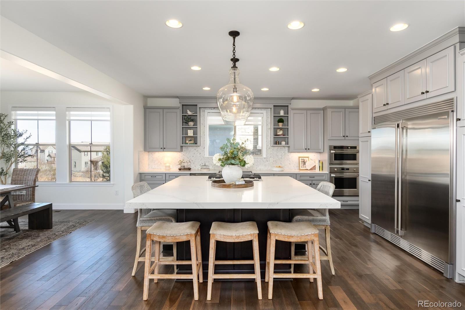 Striking 5-bed, 6-bath luxury home with finished walk-out basement • Backs to open space & mountain views • Street access to trails and amenities. Welcome to this impeccably maintained five-bedroom, six-bath residence in the highly desirable Backcountry neighborhood. This beautiful home wows with a finished walk-out basement completed in 2022 featuring a full wet bar with dishwasher, beverage refrigerator and ice maker, an exercise room, an additional bedroom and 3/4 bathroom. A double sliding glass door leads from the great room to the private patio with fire pit and hot tub. The main level of the home includes a dedicated office, living room and eat-in kitchen with **oversized island, upgraded stainless steel appliances, two walk-in pantries and a butler’s pantry complete with sink, wine cooler and ice maker. Three fireplaces — outdoor on the covered porch, living room and primary bedroom — enhance interior and exterior comfort. The upstairs features 3 bedrooms each with ensuite bathrooms as well as a versatile loft for a multitude of uses. From the loft you also have access to a private covered balcony. The professionally landscaped, fenced backyard backs directly to open space with mountain views and boasts mature trees as well as a water feature. 9-foot ceilings on main and upper levels and 9-10-foot ceilings in basement create a bright, open feel throughout the house. The interior of the home is newly painted and a house humidifier was added in 2024. 0.6–0.7 mi to Backcountry Wilderness Area trail connections; 6.5–7.5 mi to Bluffs Regional Park & Trail system; ~3.2–3.7 mi to Stone Mountain Elementary; ~4.0–4.5 mi to Ranch View Middle School and ThunderRidge High School; ~1 mi to Lost Coffee – Backcountry Highlands Ranch ~0.8 mi to Sundial House and community pool. Easy access to parks, trails, shopping and dining. An opportunity like this is rare—experience the comfort, elegance, and lifestyle this home was designed to offer.