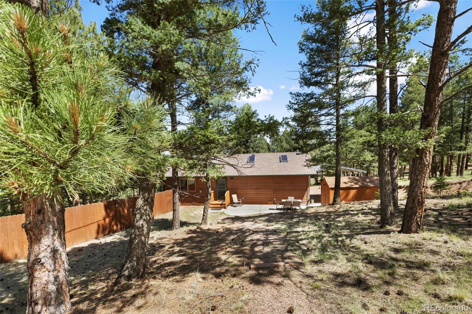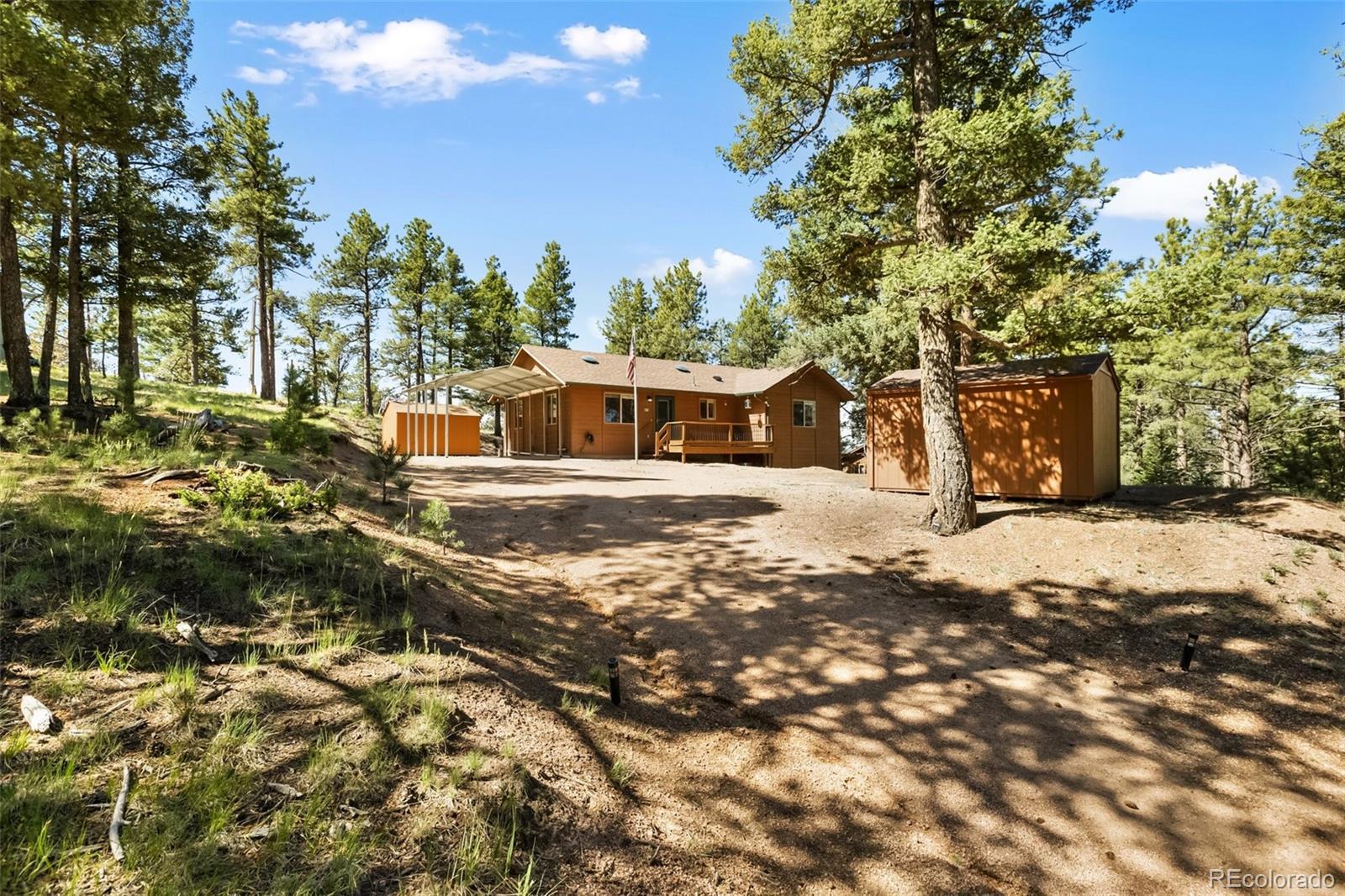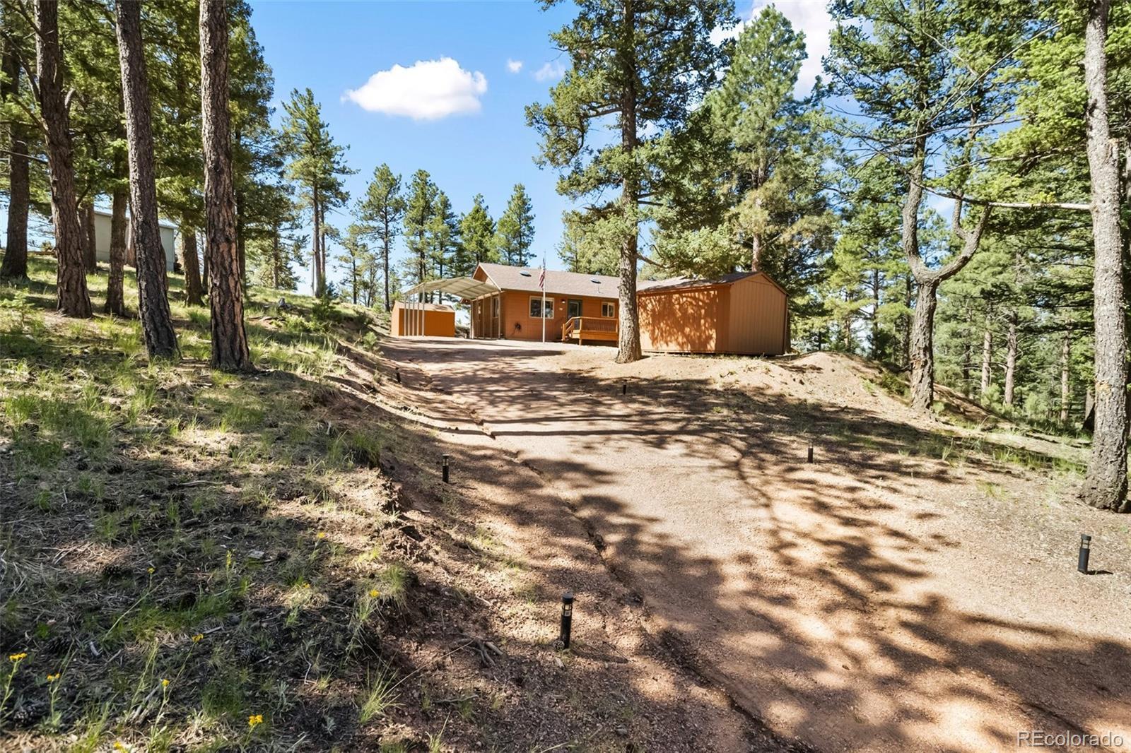 Cozy mountain ranch style home located on over a half an acre of land in a wooded private neighborhood! Upon entering the home, the open great room is accented by knotty pine tongue and groove ceilings, in addition to skylights and solar tubes to bring in extra sunlight! Upgrades within the home include new interior paint, light fixtures, new convection microwave oven, tiger wood laminate flooring, + 86" multicolor electric fireplace built-in wall unit. There are 2 bedrooms situated off the great room, and a full bathroom with a heated bidet! Laundry and pantry area lead out the rear patio, with access to the private yard. Home is constructed in rustic cedar sided exterior, 2022 composition shingle roof, w/ attached carport and 2 large storage sheds are on premises. Property is serviced by its own private well and septic system. Located just 25 minutes outside of Woodland Park, an hour to Colorado Springs, just 20 minutes to epic trout fishing, & 1.5 hrs. to snow skiing resorts and the Continental Divide. Outdoor amenities and nature abounds in this mountain community known as Colorado Mountain Estates!