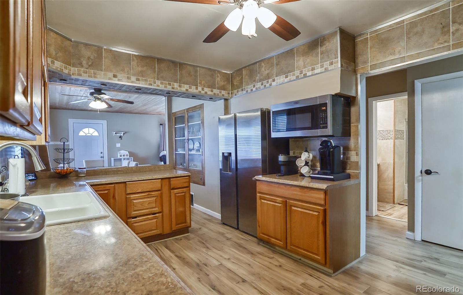 This family home is one of the largest above-grade homes available anywhere in Limon. The house has been freshly painted both inside and out. It sits on a large corner lot with four nicely oversized bedrooms and two bathrooms. It has been beautifully renovated with marble tiles in the kitchen and the main bathroom, while many of the original built-in features remain in excellent condition. The kitchen has stainless steel appliances, including a refrigerator, double oven with cooktop, hood, dishwasher, and a built-in microwave. The primary bedroom is large and features a massive walk-in closet. The primary bedroom also has a private walk-out to a cozy covered patio. A separate laundry room on the main level provides ample storage space. The furnace and hot water tanks are newer. There is also a water softener in the basement, with plenty of additional storage space. The backyard boasts a newer cedar six-foot privacy fence and a covered patio with new lighting. Find an attached workshop with electricity and an air compressor line off the patio. There is potential for RV parking with direct access to the home, requiring only a simple modification to the fencing. The house is only one short block from the school and two blocks from a brand-new public water park and swimming pool. This one will not last long!