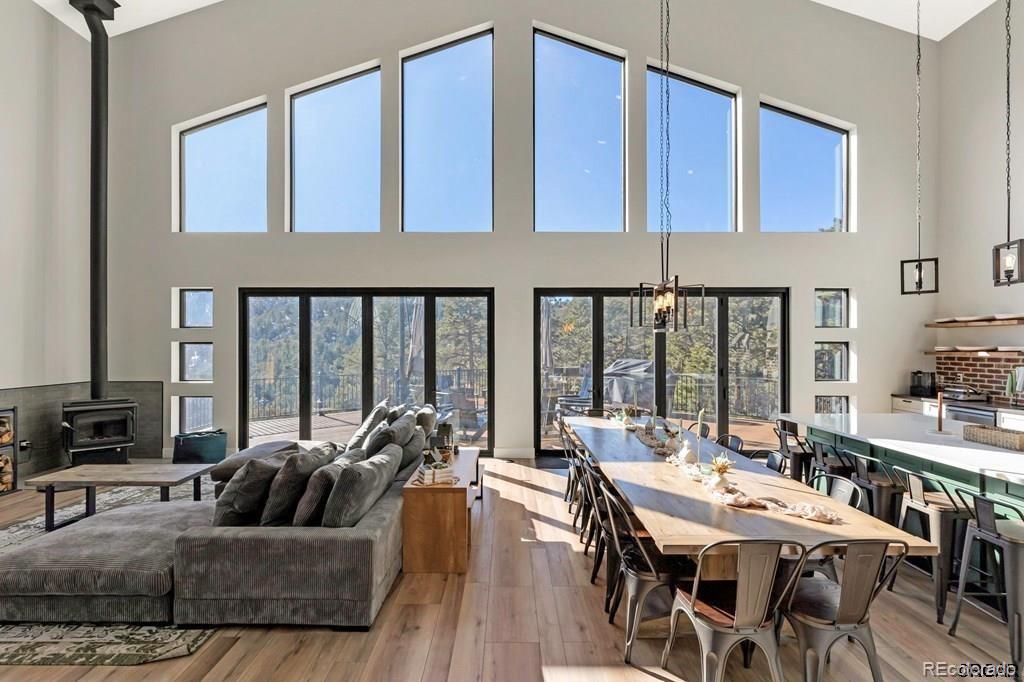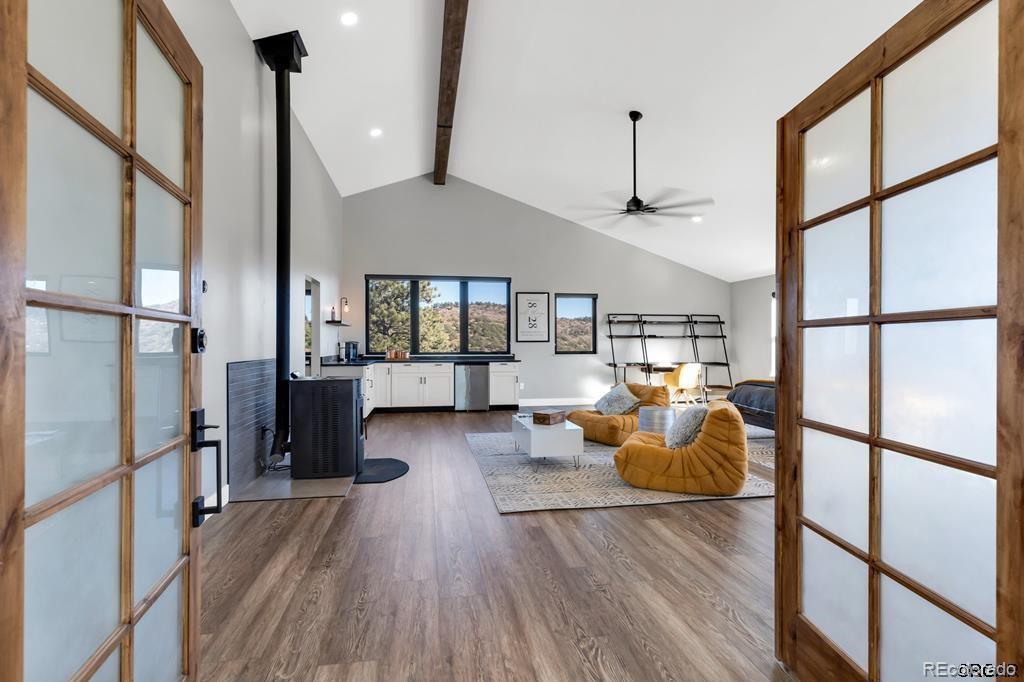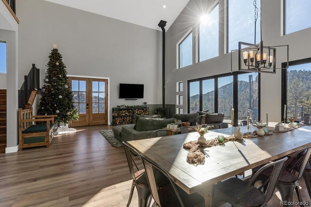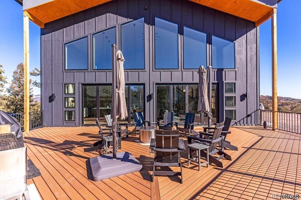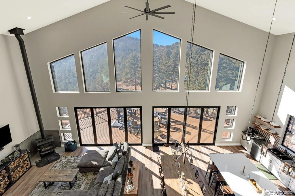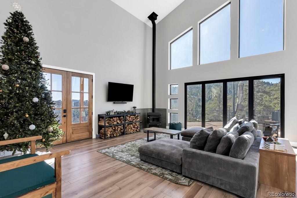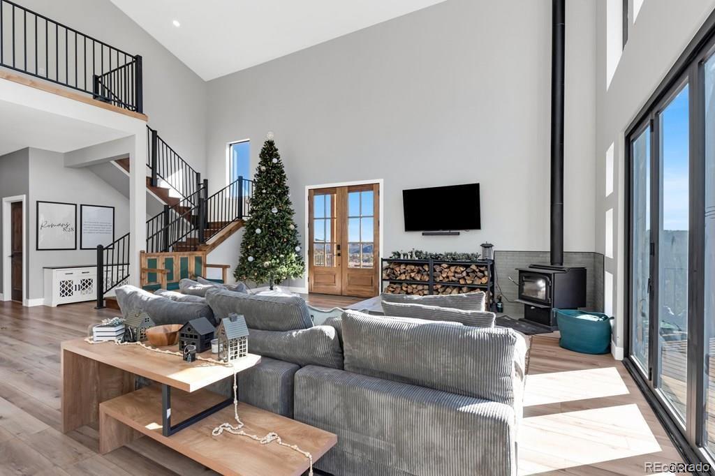 This stunning smart home built in 2024, set on 35 picturesque acres with views of Ponderosa Covered Mountains, offers luxury and convenience with remote control(from cell phone) over cameras, doors, and heating. The Great Room features 32-foot ceilings, a massive wall of south-facing windows, and commercial-grade folding glass doors that opens almost the entire south facing wall onto an 800 sq. ft. prow-shaped TREX deck which includes a fire pit, grills, and furniture. A Pergola with a Hot Tub lies just below, providing more serene views. The kitchen boasts a commercial 6-burner gas range, stainless appliances, a 9-foot island with custom cabinetry, and is sold fully stocked with cookware, glassware, and more. The home comfortably sleeps 19, with 4 bedrooms, 2 baths on the main level, and an ENORMOUS 1,152 sq. ft. MASTER SUITE upstairs featuring a kitchenette for your morning coffee and a spacious tiled shower & double vanity. The attached studio would make a perfect walk-in closet. Additional features include radiant in-floor heating, luxury vinyl plank flooring, a wood-burning stove,pellet stove and DELUXE FURNISHINGS, including bedding and towels. Perfect for a Corporate Retreat, VRBO, or a spacious family home, this property blends comfort, style, and breathtaking natural surroundings.