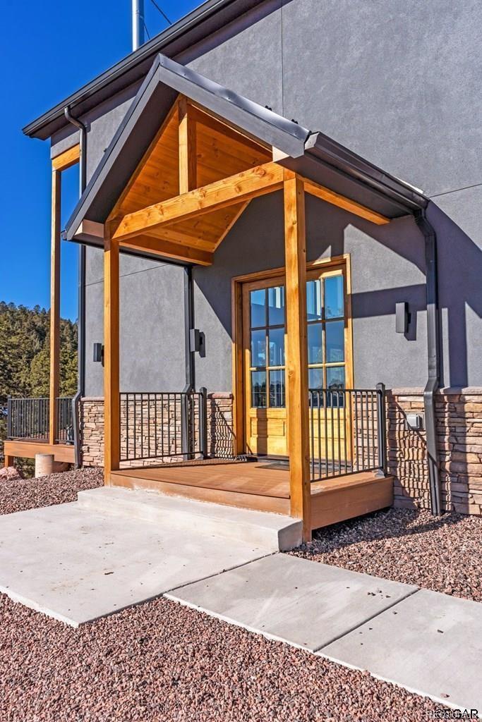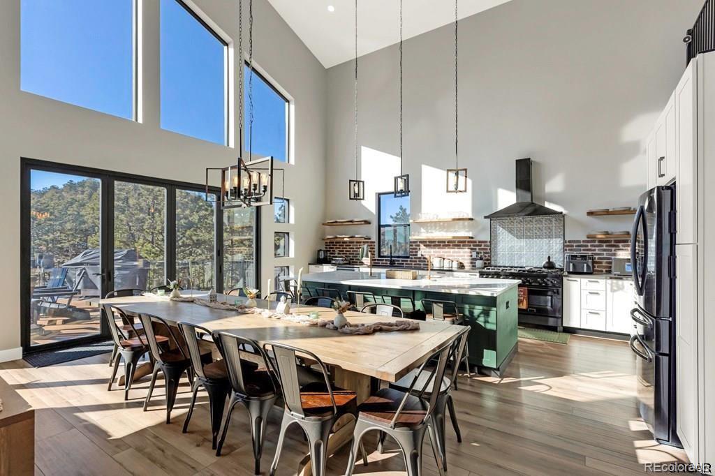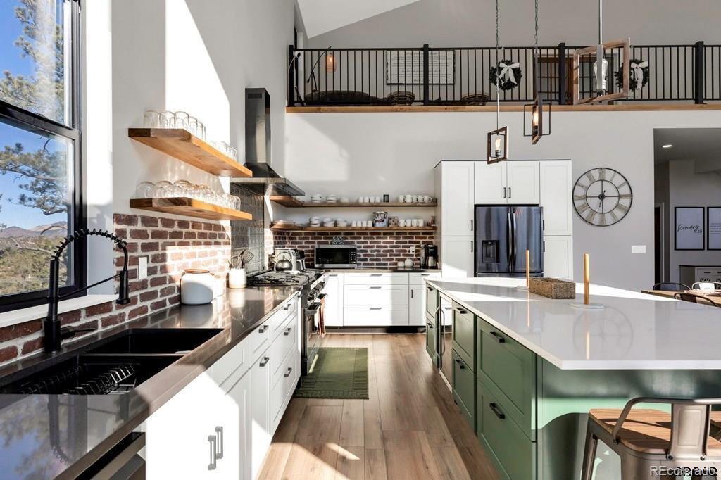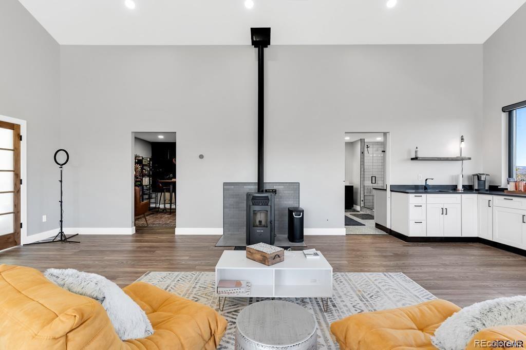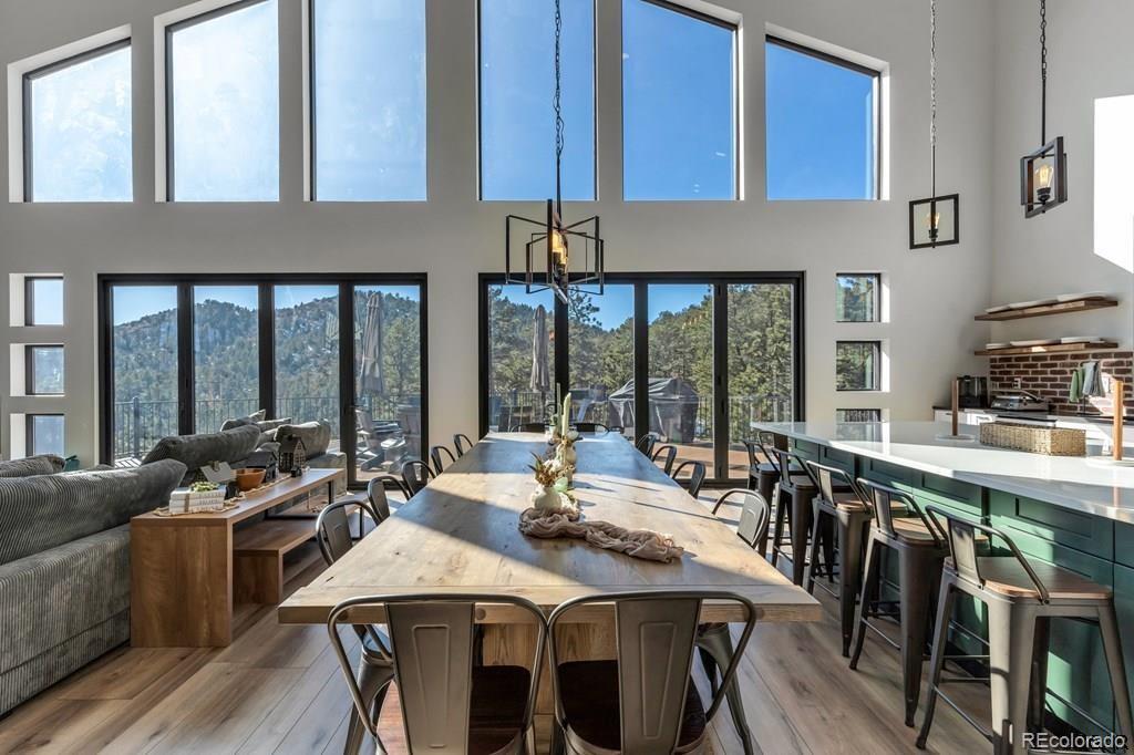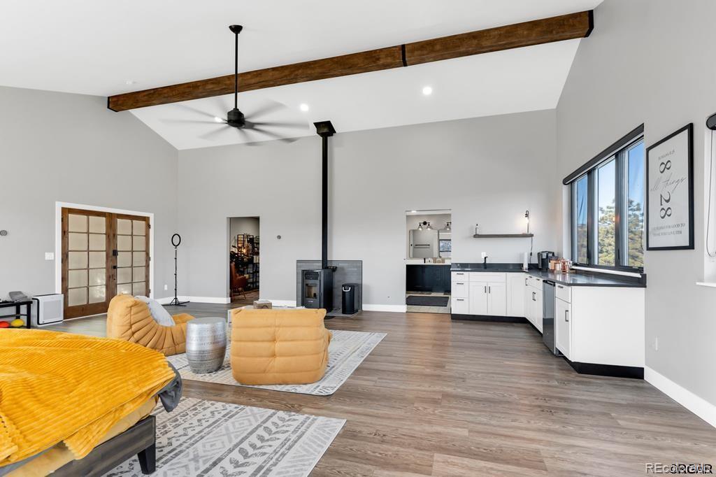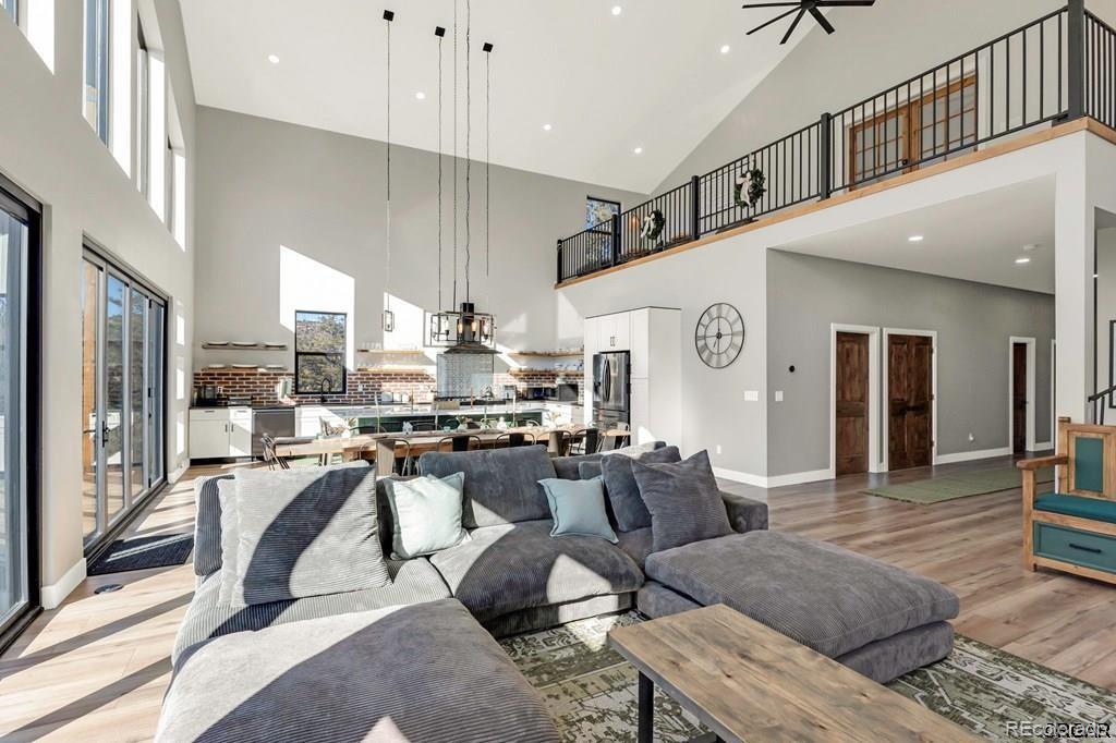 This stunning smart home built in 2024, set on 35 picturesque acres with views of Ponderosa Covered Mountains, offers luxury and convenience with remote control(from cell phone) over cameras, doors, and heating. The Great Room features 32-foot ceilings, a massive wall of south-facing windows, and commercial-grade folding glass doors that opens almost the entire south facing wall onto an 800 sq. ft. prow-shaped TREX deck which includes a fire pit, grills, and furniture. A Pergola with a Hot Tub lies just below, providing more serene views. The kitchen boasts a commercial 6-burner gas range, stainless appliances, a 9-foot island with custom cabinetry, and is sold fully stocked with cookware, glassware, and more. The home comfortably sleeps 19, with 4 bedrooms, 2 baths on the main level, and an ENORMOUS 1,152 sq. ft. MASTER SUITE upstairs featuring a kitchenette for your morning coffee and a spacious tiled shower & double vanity. The attached studio would make a perfect walk-in closet. Additional features include radiant in-floor heating, luxury vinyl plank flooring, a wood-burning stove,pellet stove and DELUXE FURNISHINGS, including bedding and towels. Perfect for a Corporate Retreat, VRBO, or a spacious family home, this property blends comfort, style, and breathtaking natural surroundings.