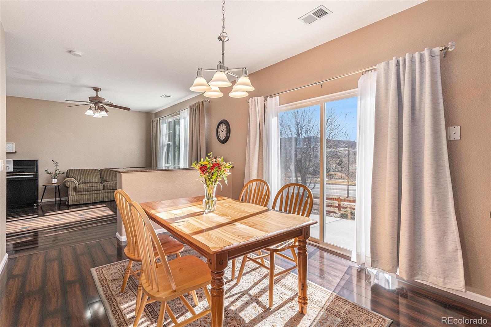 Great Opportunity in The Meadows! 4 Bedrooms! 3 Baths! Cul-de-Sac Location! Backs & Sides to Greenbelt! Views of The Bluffs! Walk to The Grange, and The Meadows Incredible Pool Complex & Neighborhood Amenities! Soaring Ceilings! Light, Bright & Open Floor Plan! 2 Story Living Room! Family Room with Tons of Light! Spacious Kitchen with Breakfast/Dining Room! Stainless Steel Appliances! Pantry! Main Floor Laundry! Low Maintenance Plank Flooring! Large Primary Suite with En Suite Bathroom! 2 Additional Spacious Bedrooms Share a Second Full Bathroom! Great Yard with Concrete Patio! Covered Front Porch! Finished Garage! Easy Access to I-25! Minutes from Shopping, Restaurants, Park, Trails & More!