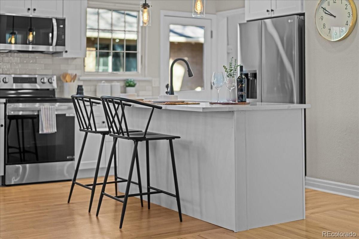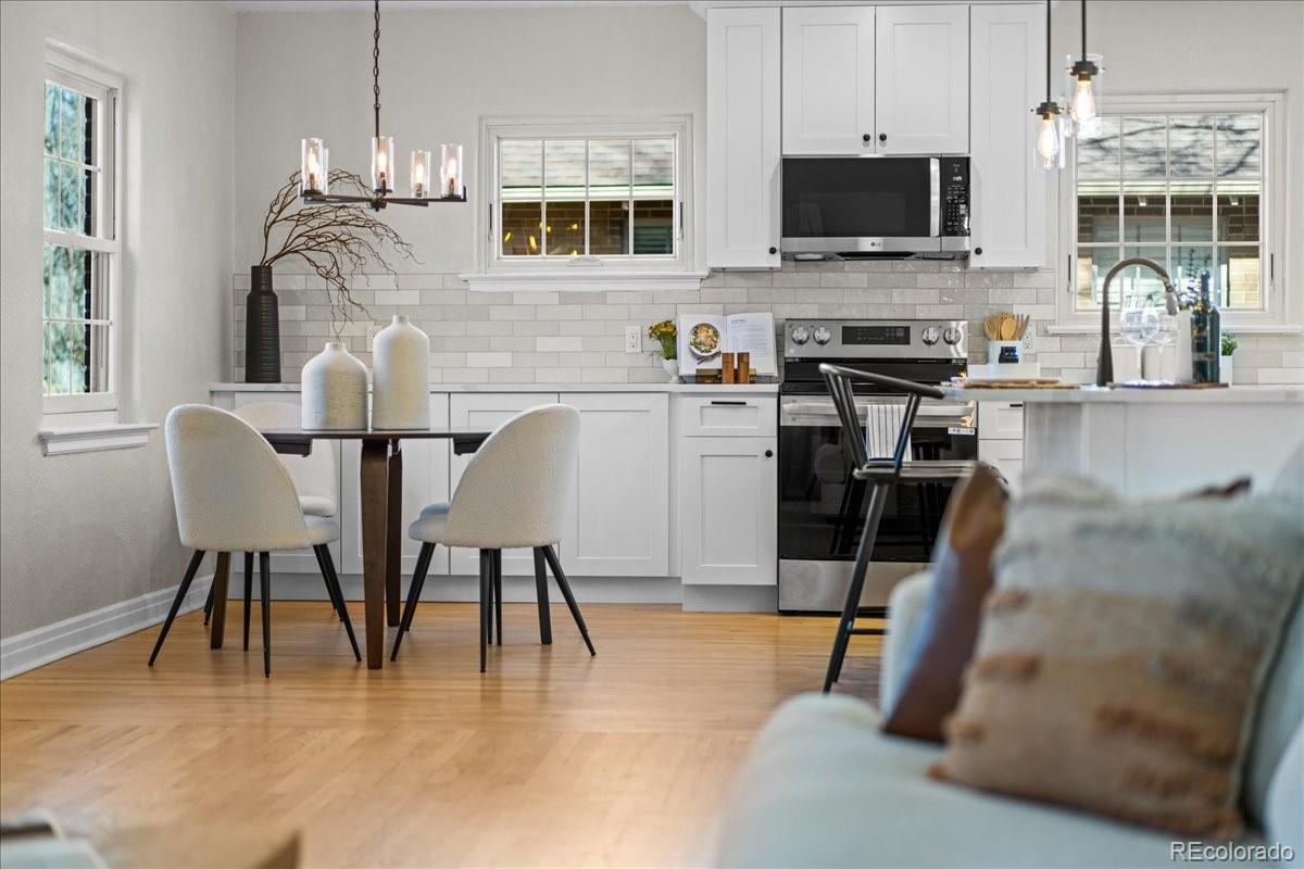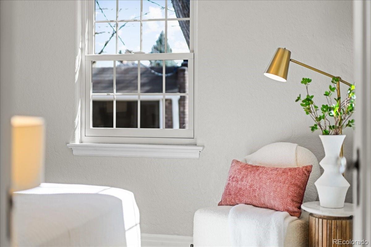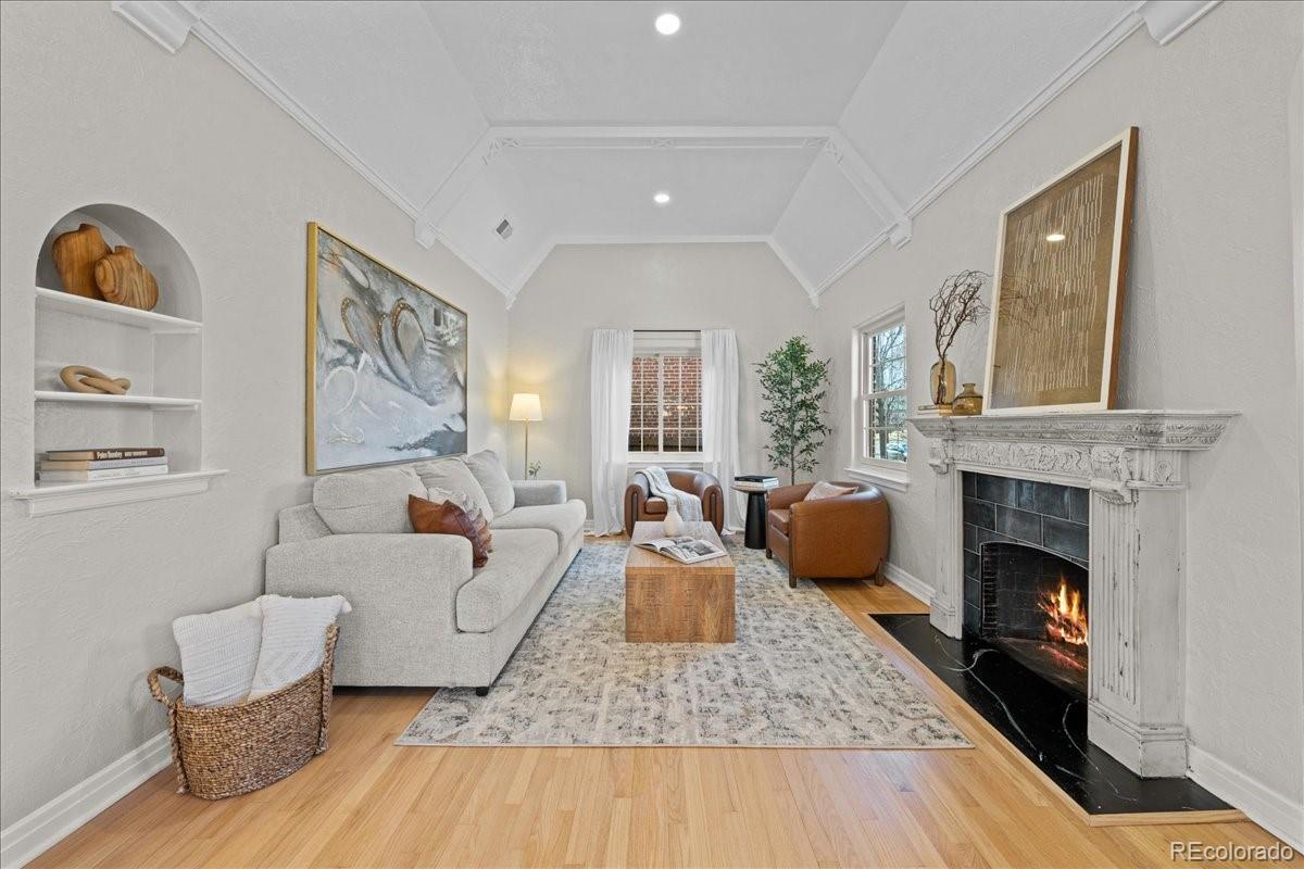 Nestled on a tree-lined street in Denver’s sought-after Hale / Mayfair corridor, this beautifully updated brick Tudor blends timeless architecture with thoughtful modern upgrades. Natural light fills the home, highlighting arched doorways, curved ceilings, designer paint, and striking 13-foot coved ceilings. The redesigned and expanded kitchen serves as the heart of the home, featuring quartz countertops, updated cabinetry, eat-in bar seating, and new appliances — perfectly balancing historic charm with modern style. The fully finished lower level lives like a private retreat with a separate entrance, spacious living area, conforming bedroom, spa-inspired bath, and kitchenette rough-in — ideal for guests, multigenerational living, or rental potential. Major system updates include new HVAC venting, new water heater, central air, plumbing, and electrical for added peace of mind. Outside, enjoy a professionally landscaped lot with mature American Elm trees, sprinklers, a flagstone patio, garden space, fenced yard, detached garage, and additional parking pad. Imagine mornings spent strolling to Marczyk Fine Foods or grabbing coffee at La Fillette Bakery, with effortless evenings meeting friends at Postino, Blanco, or Culinary Dropout. With Trader Joe’s and the vibrant 9th & Colorado district nearby — plus close proximity to Cherry Creek, Downtown, Rose, and Anschutz — this location offers a lifestyle that’s vibrant, walkable, and uniquely connected. Don’t miss your opportunity to own a standout home in one of East Denver’s most beloved neighborhoods.