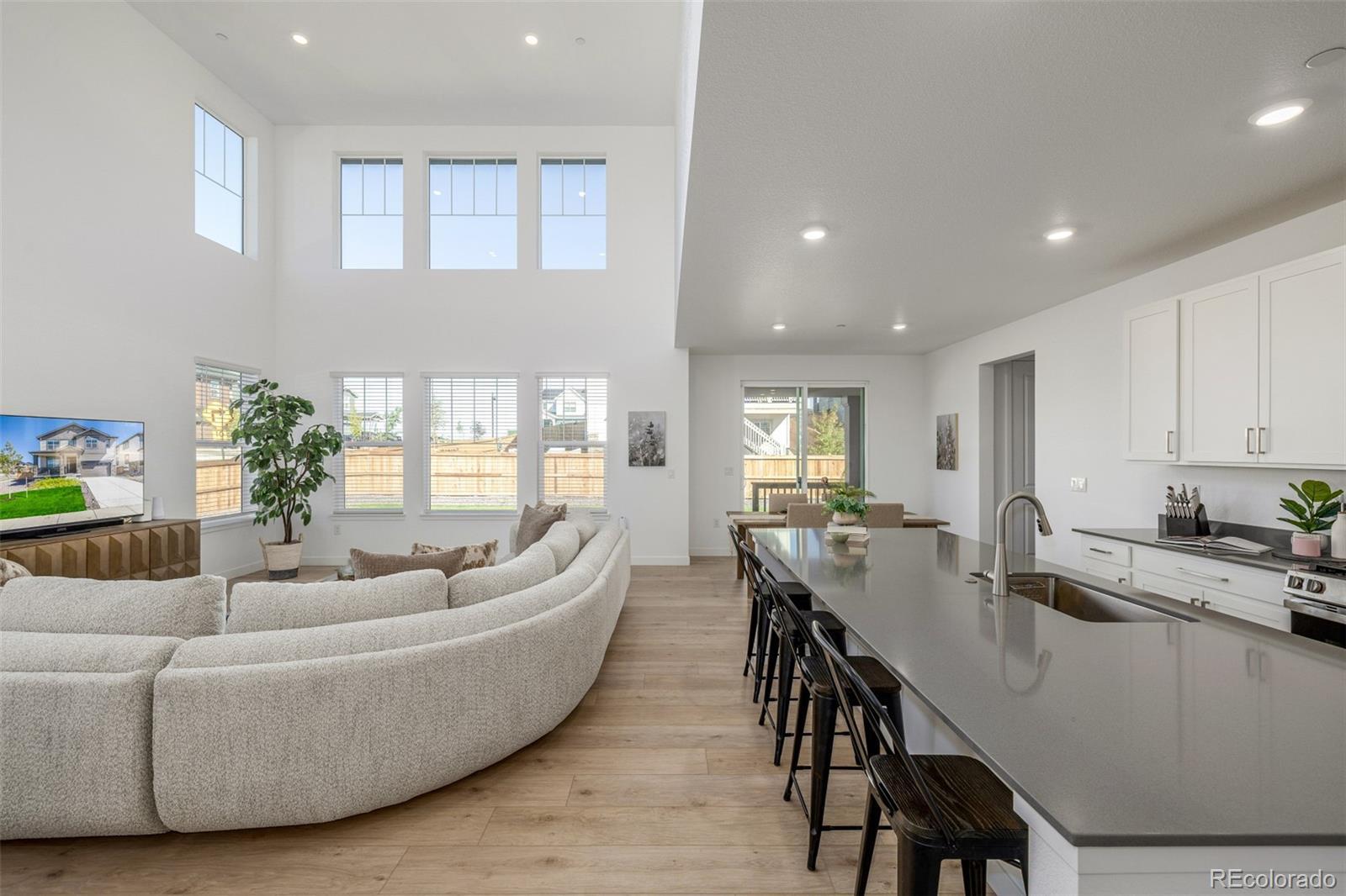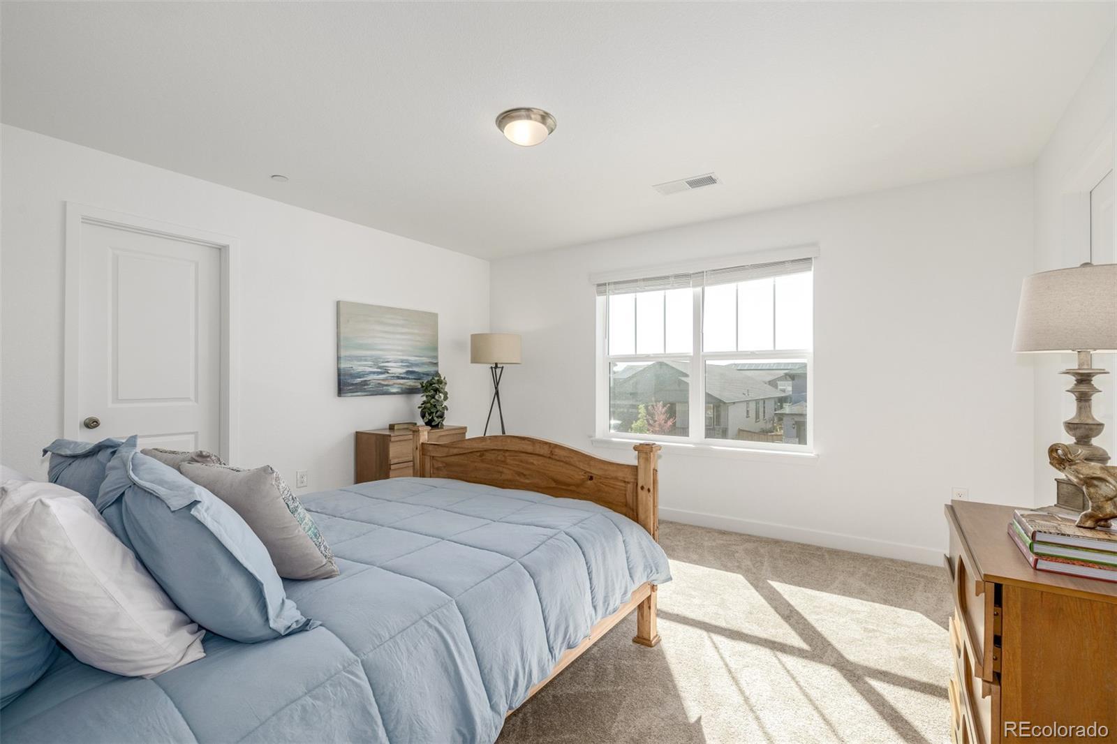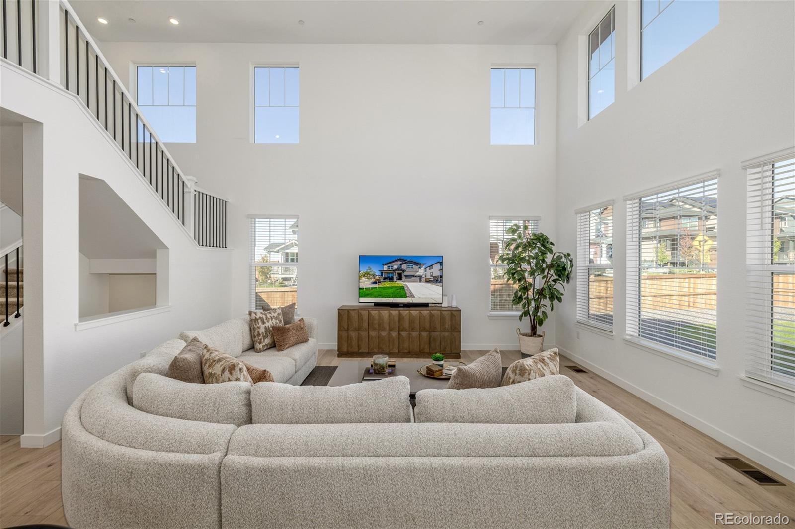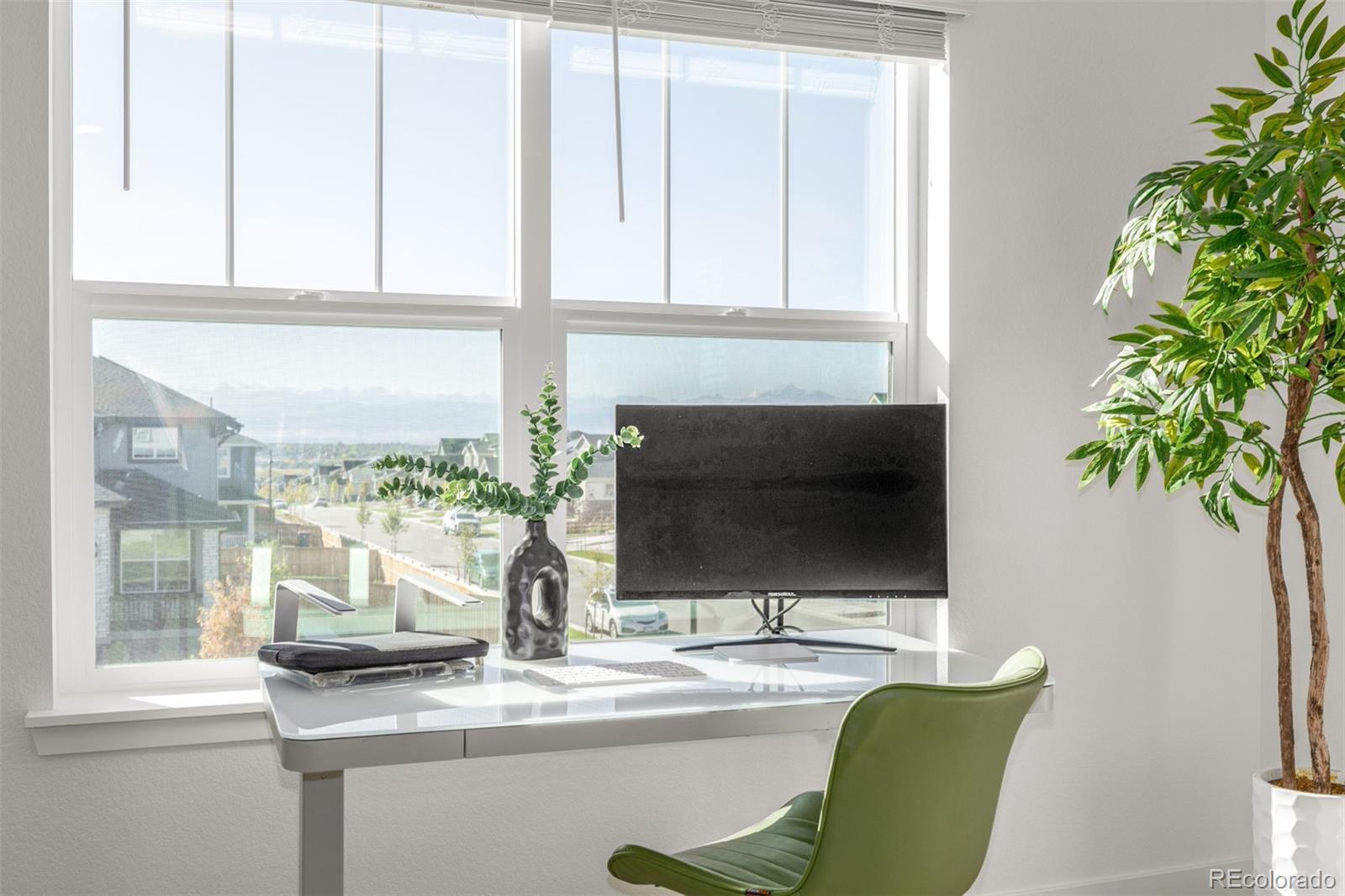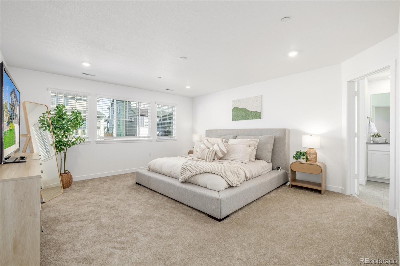 Welcome to the stunning better than new Stonehaven floorplan, perfectly situated on a desirable corner lot with views in Sunset Village! The main level is filled with natural light and offers a versatile bedroom/office, a full guest bath, EVP flooring, and a chef-inspired kitchen featuring a large eat-in island, beautiful quartz countertops and seamless flow into the soaring two-story great room. An open railing staircase leads upstairs, where you’ll find the spacious luxurious owner’s suite with a spa-style en-suite, a conveniently located laundry room, two secondary bedrooms with a Jack-and-Jill bath, plus a large loft with closet and views and full bath. The unfinished basement is ready for your personal touch, while the 3-car tandem garage, solar panels, and expanded covered patio add even more value. Builder warranty good through 5/19/26. All of this within Erie’s charming small-town atmosphere, complete with majestic mountain views, a 63,000 sq. ft. community center, and a 20,000 sq. ft. library. Enjoy nearby shopping, dining, parks, and trails—this home truly has it all!