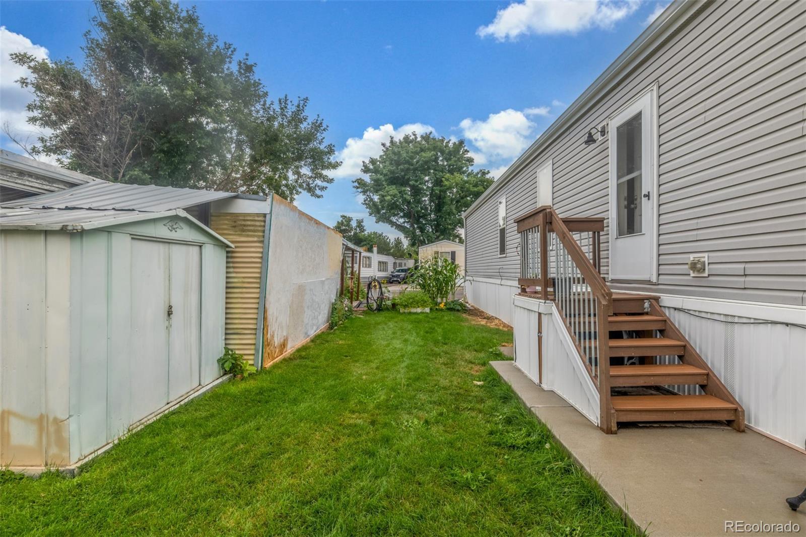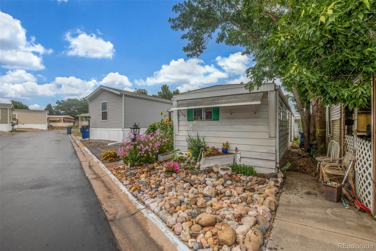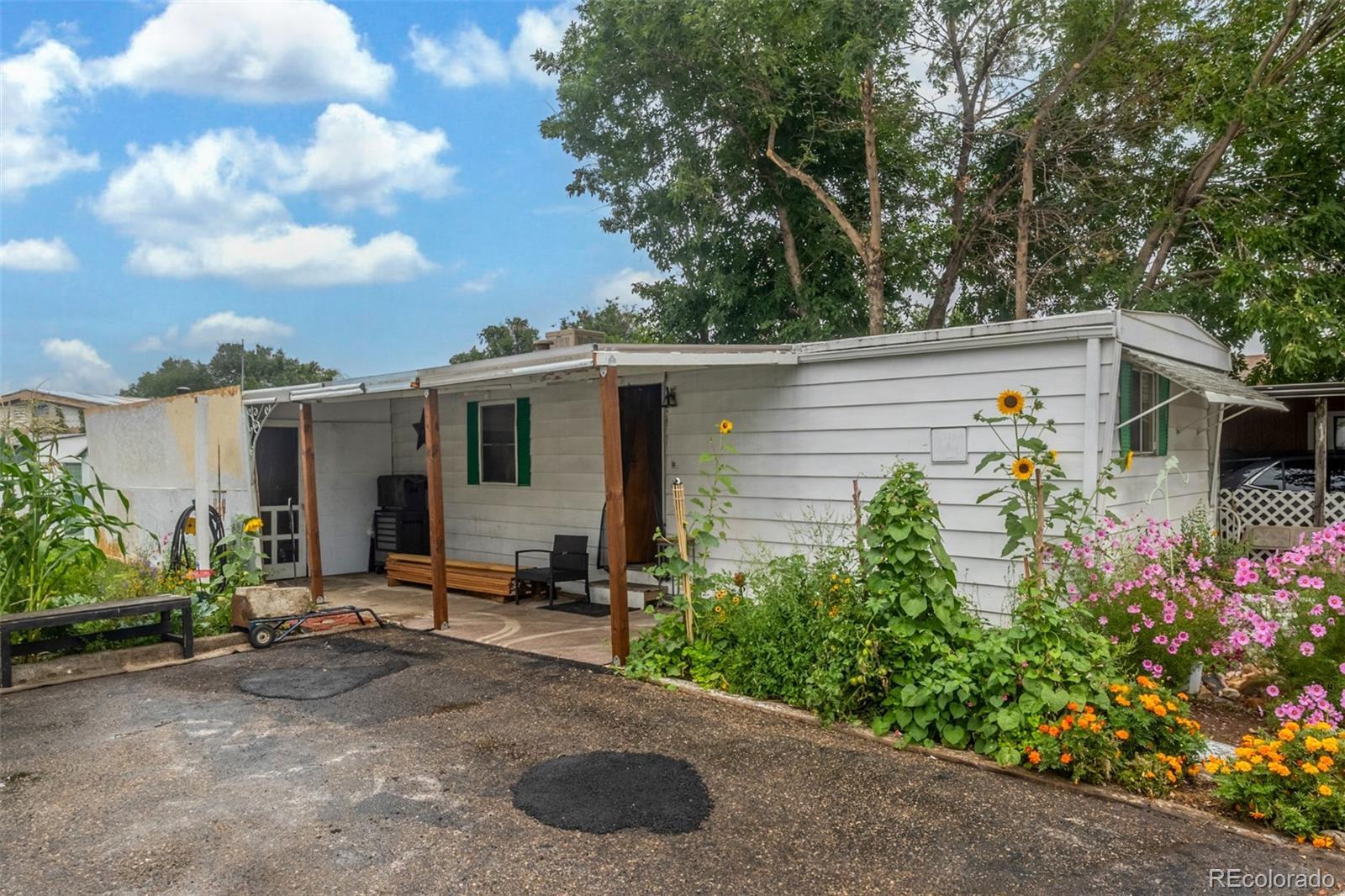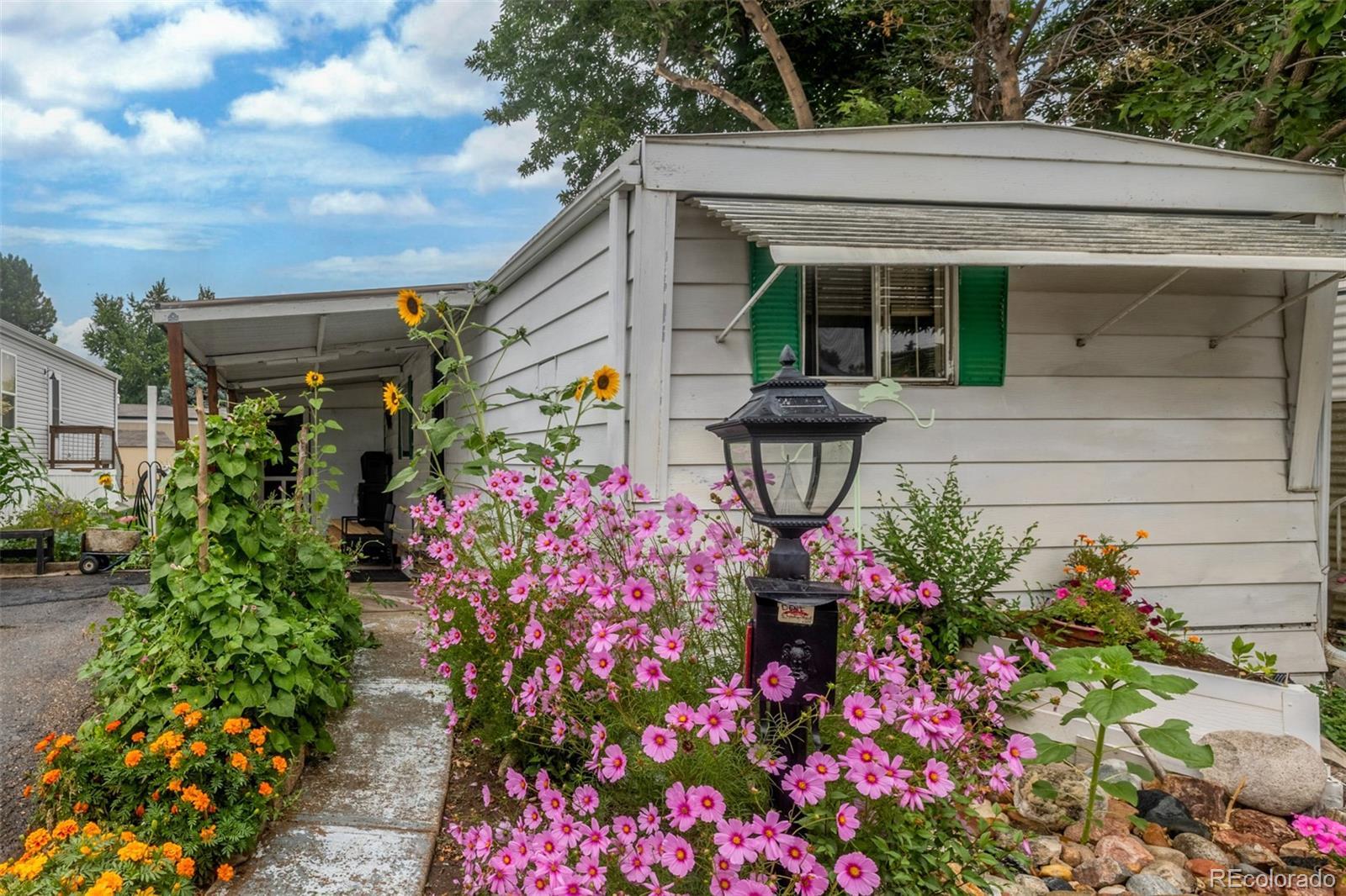 Welcome to this cozy 2-bedroom, 1-bath home tucked away in Bear Creek Village! This home offers a functional layout and great potential for those looking to add their own personal touches. The living room is light and open, leading into an updated kitchen with updated appliances including a gas range and new refrigerator, plus plenty of cabinet storage. The two bedrooms are comfortable and versatile, while the full bath provides everything you need with additional room for updates to make it your own. A convenient laundry area adds extra storage and practicality. Outside, enjoy a large covered front patio perfect for relaxing, plus a storage addition, 2 off-street parking, and a spacious backyard with garden beds, mature trees, and storage sheds—ideal for gardening, hobbies, or simply soaking up the Colorado sunshine. This park is divinely located near parks, shopping, dining, and with easy access to major roads, this home offers an affordable opportunity to own in Denver.