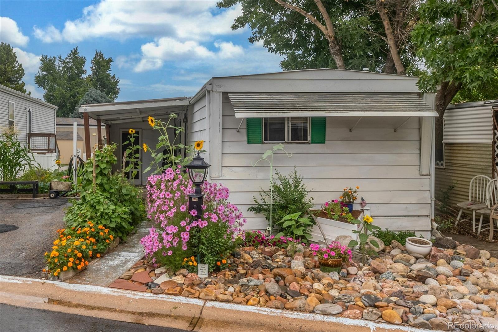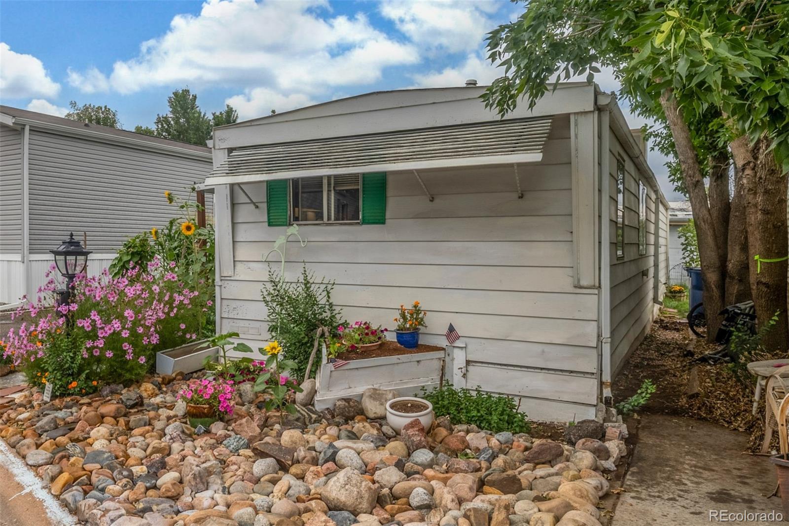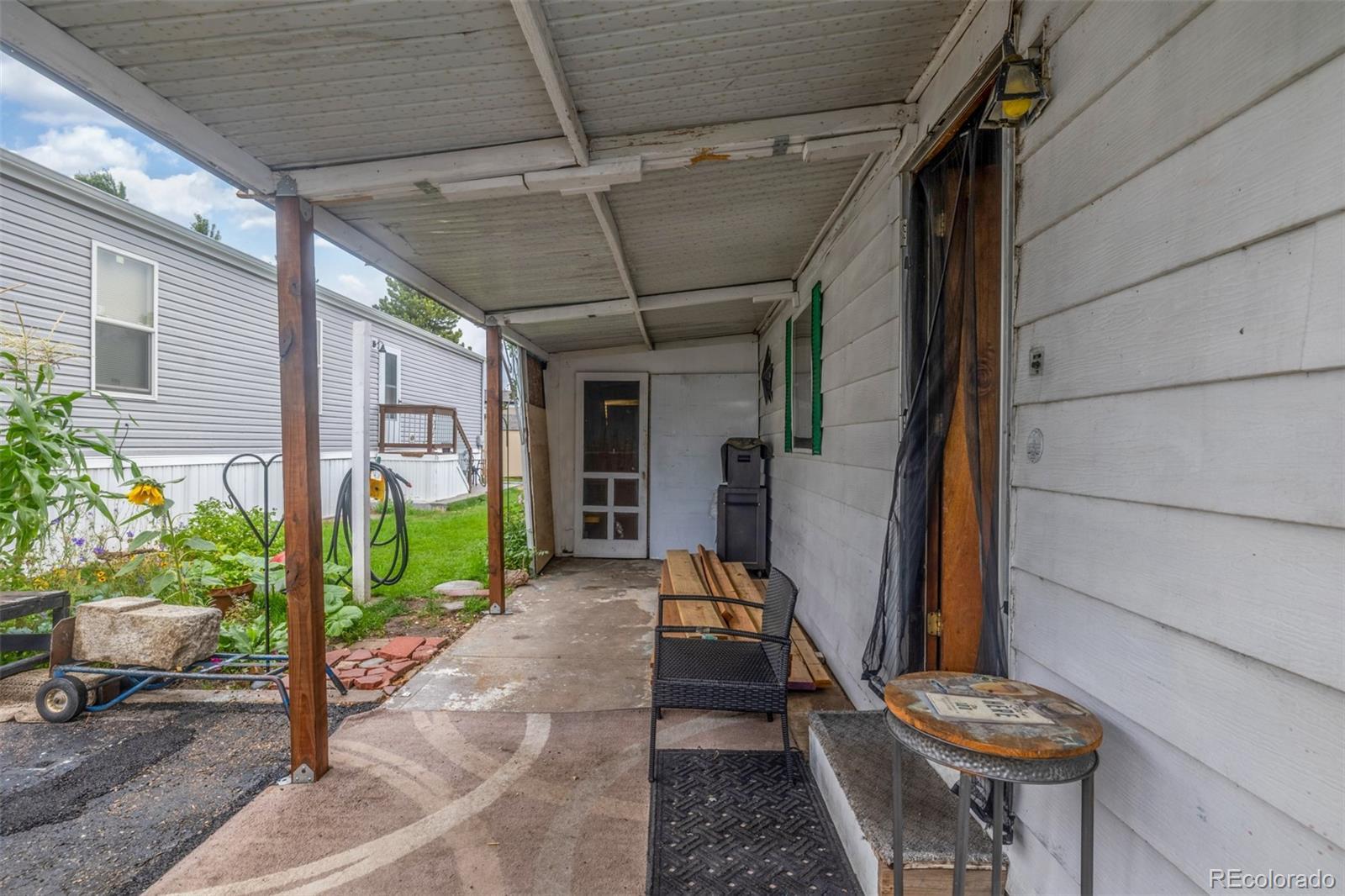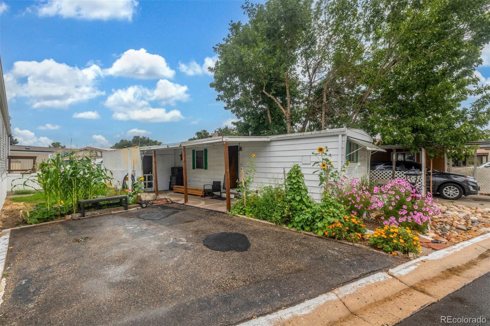 Welcome to this cozy 2-bedroom, 1-bath home tucked away in Bear Creek Village! This home offers a functional layout and great potential for those looking to add their own personal touches. The living room is light and open, leading into an updated kitchen with updated appliances including a gas range and new refrigerator, plus plenty of cabinet storage. The two bedrooms are comfortable and versatile, while the full bath provides everything you need with additional room for updates to make it your own. A convenient laundry area adds extra storage and practicality. Outside, enjoy a large covered front patio perfect for relaxing, plus a storage addition, 2 off-street parking, and a spacious backyard with garden beds, mature trees, and storage sheds—ideal for gardening, hobbies, or simply soaking up the Colorado sunshine. This park is divinely located near parks, shopping, dining, and with easy access to major roads, this home offers an affordable opportunity to own in Denver.