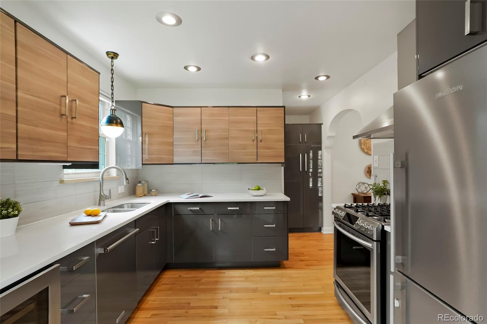 Back on the Market! Buyer's contingency fell through, their loss is your gain! Timeless charm meets modern sophistication in this stunning brick Tudor on tree-lined Locust Street. Sunlight pours through oversized windows, illuminating the seamless blend of original architectural details and contemporary updates throughout. The welcoming foyer flows into an expansive living room with fireplace, opening to a generous dining room and chef's kitchen featuring quartz countertops, modern cabinetry, and premium stainless steel appliances. Thoughtfully renovated with an open floor plan, this home showcases arched doorways, soaring ceilings, gleaming hardwood floors, and exquisite millwork. The main floor master suite offers a private retreat with a beautifully appointed 3/4 bath, while two additional bedrooms provide flexible living options. The lower level family room with fireplace creates perfect entertaining space, complemented by a spacious laundry room and third bedroom with adjoining bathroom/shower. Recent updates include brand new roof, A/C, and an electronic gate for added convenience. The private, mature backyard features a generous patio ideal for outdoor entertaining, plus a two-car garage for storage and parking. Prime Park Hill location offers the best of Denver living - minutes to downtown, walking distance to the vibrant shops and restaurants along Kearney Street, and convenient access to parks, Stapleton, and major corridors. This is sophisticated urban living at its finest.
