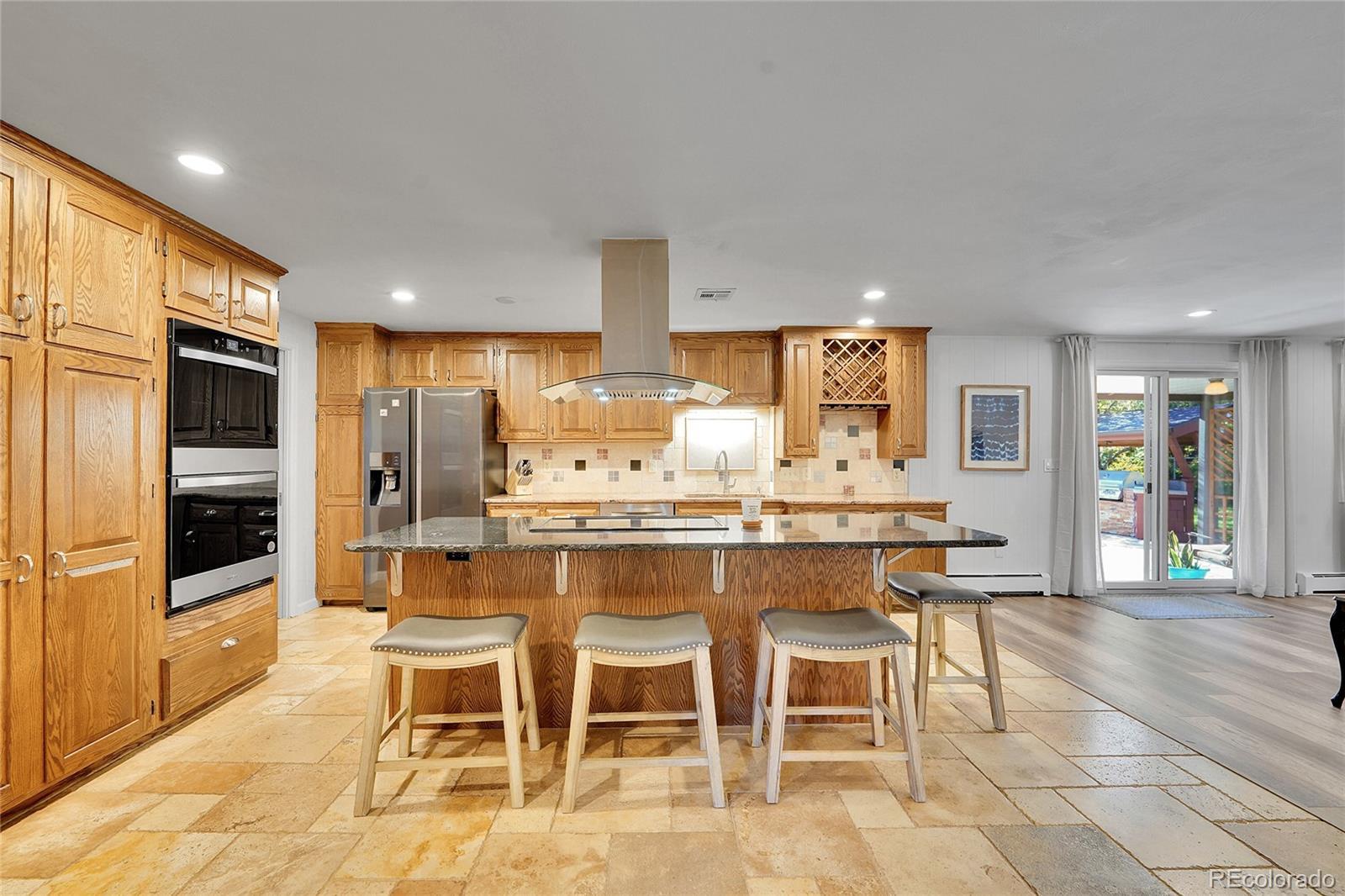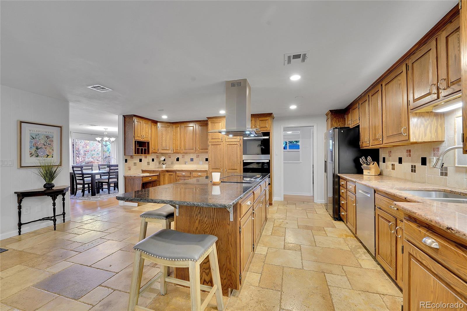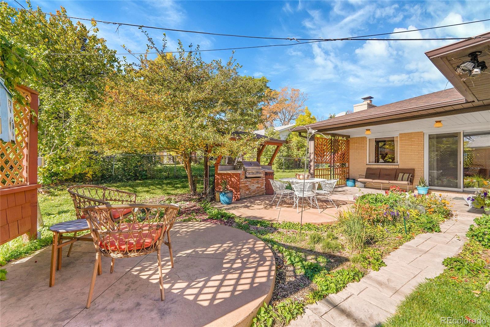 Impeccably maintained ranch made for effortless main-level living and entertaining in coveted Cherry Knolls! Set on a generous .21 acre lot, this 5-bed, 3-bath home features nearly 3,400 sq. ft. of intentional space, an oversized 2-car garage, a rare fully finished basement suite, and an enviable backyard. The classic brick exterior and covered front porch welcome guests into the home, where the dining room’s oversized windows and hardwood floors create a bright atmosphere for holiday hosting or family dinners. Just steps away, the eat-in kitchen boasts stainless steel appliances, brand-new double ovens, granite countertops, abundant raised-panel oak cabinetry, and an oversized island perfect for sharing casual meals and conversation. The adjoining family room, anchored by a timeless brick-surround gas fireplace, connects to the backyard for seamless indoor-outdoor living. Unwind in the main-level primary suite with bright windows, dual closets, and a private 3/4 en suite bath. Two additional bedrooms, a full hall bath, and a home office with custom built-ins complete the main level. Downstairs, the finished basement offers versatility with a second kitchen, den, workspace with wall-to-wall bookshelves, two non-conforming bedrooms, 3/4 bath, and a large laundry room with additional cabinetry—perfect for multigenerational living, long-term guests, or simply more room to play. Step outside to discover a true entertainer’s backyard, featuring a large covered patio, shed, built-in BBQ, second patio, and firepit for summer cookouts or cozy fall evenings. Garden beds and a lush lawn create space for both play and relaxation. With Cherry Knolls Park, Big Dry Creek Trail, and Cherry Knolls Swim Club just around the corner, plus easy access to The Streets at SouthGlenn, South Suburban Golf Course, Chatfield State Park, and Fiddler’s Green Amphitheater, this home offers connection and convenience in a neighborhood loved for its community feel.