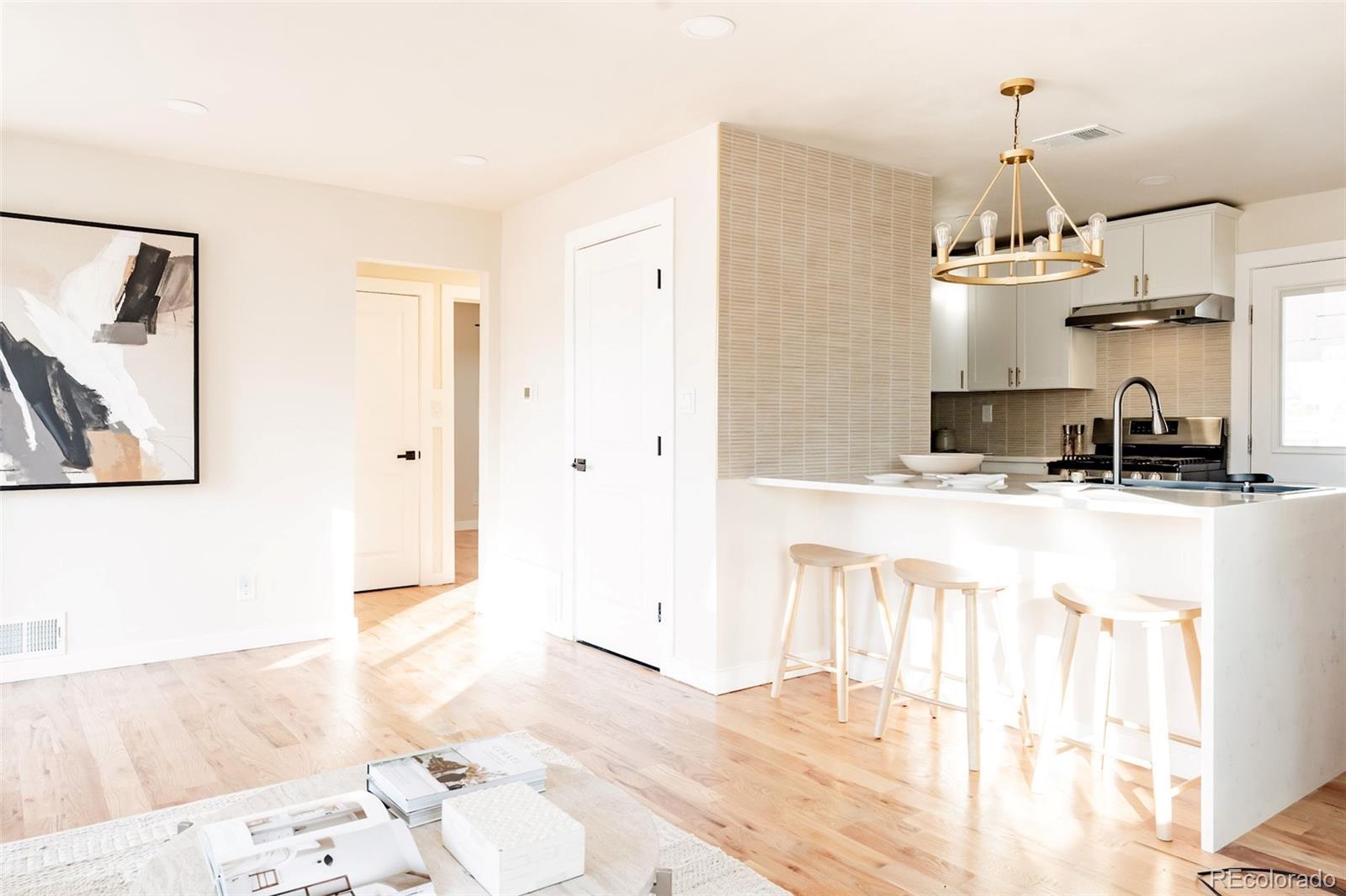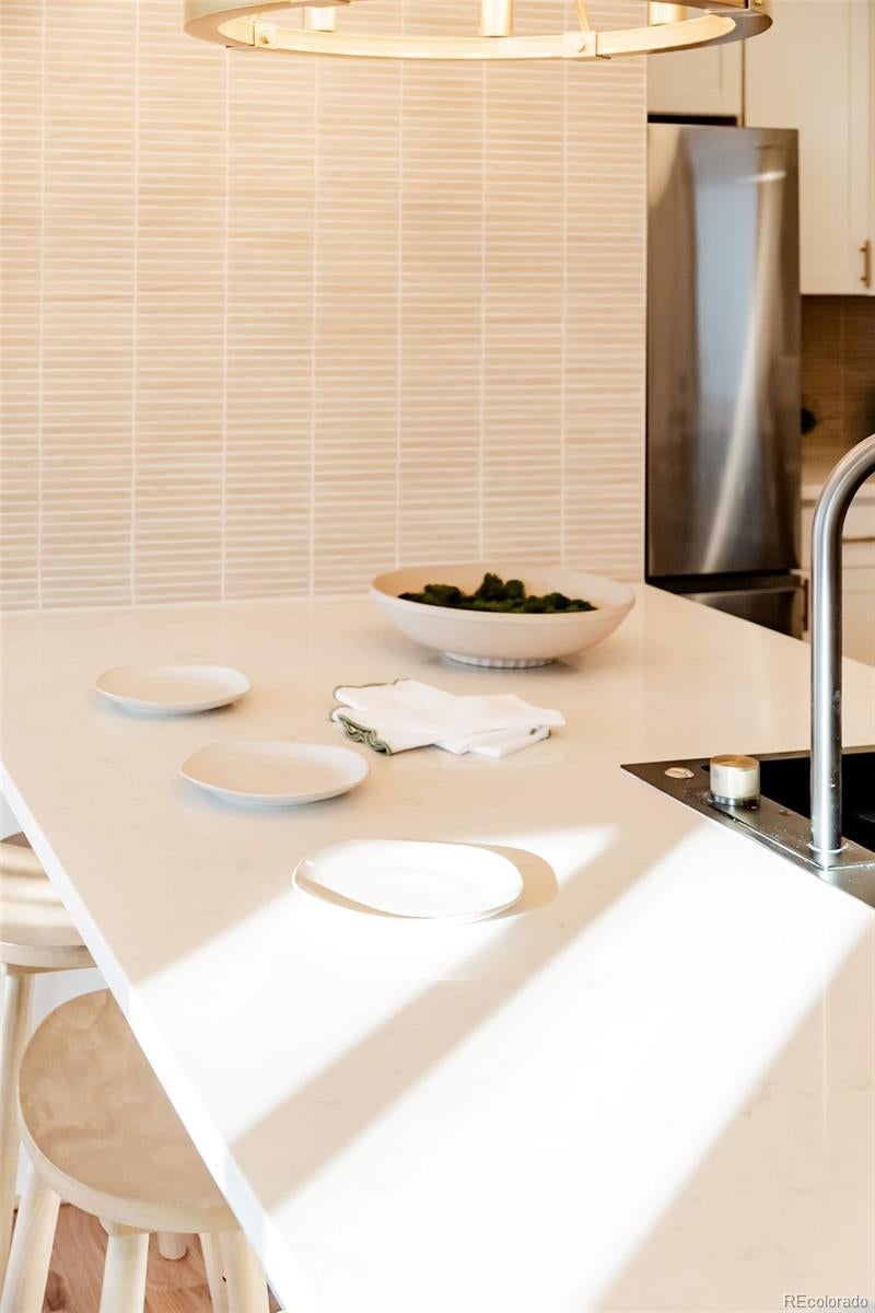 Welcome to this bright and inviting Ruby Hill home, where modern colors and a thoughtfully designed layout make the most of every square foot! Offering 2 bedrooms and 1 bath, the space maximizes with an open concept and airy feel. The stunning kitchen features a quartz waterfall island, sleek modern backsplash, and generous cabinet space. The bathroom is equally impressive with a clean, contemporary design that feels fresh and inviting. Step outside to a highly functional backyard, perfect for extra breathing room, with a covered patio ideal for relaxing or entertaining. An oversized attached 1-car garage provides excellent storage, and an extra bonus to the already well-rounded home. Situated perfectly near shops, restaurants, quick drive to downtown or the mountains, highway access and the vibrant Ruby Hill Park - don't miss the quick walk to the park to enjoy the amphitheater that hosts lively concerts and delightful food trucks all summer long! This home embodies both comfort and entertainment at your doorstep. Don't miss the opportunity to make this perfect home yours!