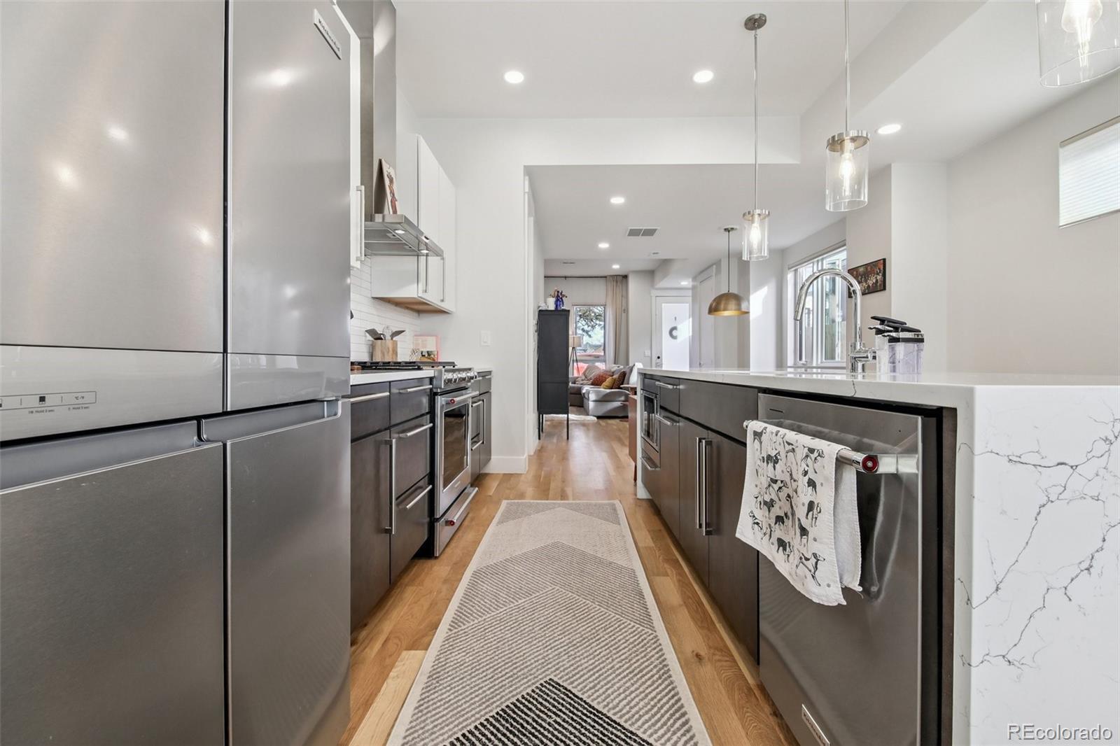 Modern luxury meets urban convenience in this 2023-built townhome in Englewood. Offering 2,507 finished square feet across three levels, this contemporary residence features 3 bedrooms and 5 bathrooms, providing exceptional space and flexibility rarely found in townhome living. The open-concept main level is designed for comfortable living and entertaining, highlighted by expansive living and dining areas and abundant natural light. The stylish kitchen flows seamlessly into the main gathering space, while quality finishes and thoughtful design elements create a clean, modern aesthetic throughout. Central air conditioning and forced air heat provide year-round comfort. Each bedroom is well-sized, and the multiple bathrooms offer convenience for guests, roommates, or multi-generational living. The three-story layout allows separation of space, ideal for a home office, fitness area, or additional flex space. A private rooftop deck extends the living area outdoors and giving you a beautiful mountain view, perfect for relaxing or entertaining. Constructed with stucco exterior and asphalt shingle roof, this low-maintenance property delivers modern construction benefits in an established Englewood location. Conveniently located near South Broadway, restaurants, shopping, parks, and light rail access, with easy connectivity to downtown Denver, DTC, and major highways. An outstanding opportunity for buyers seeking newer construction, contemporary design, and urban accessibility in Arapahoe County.