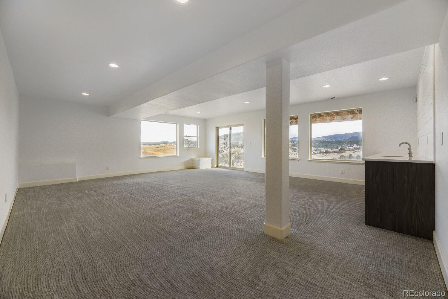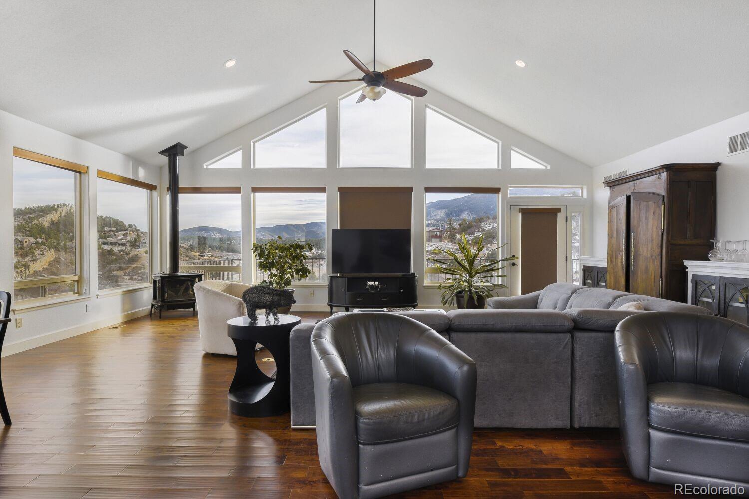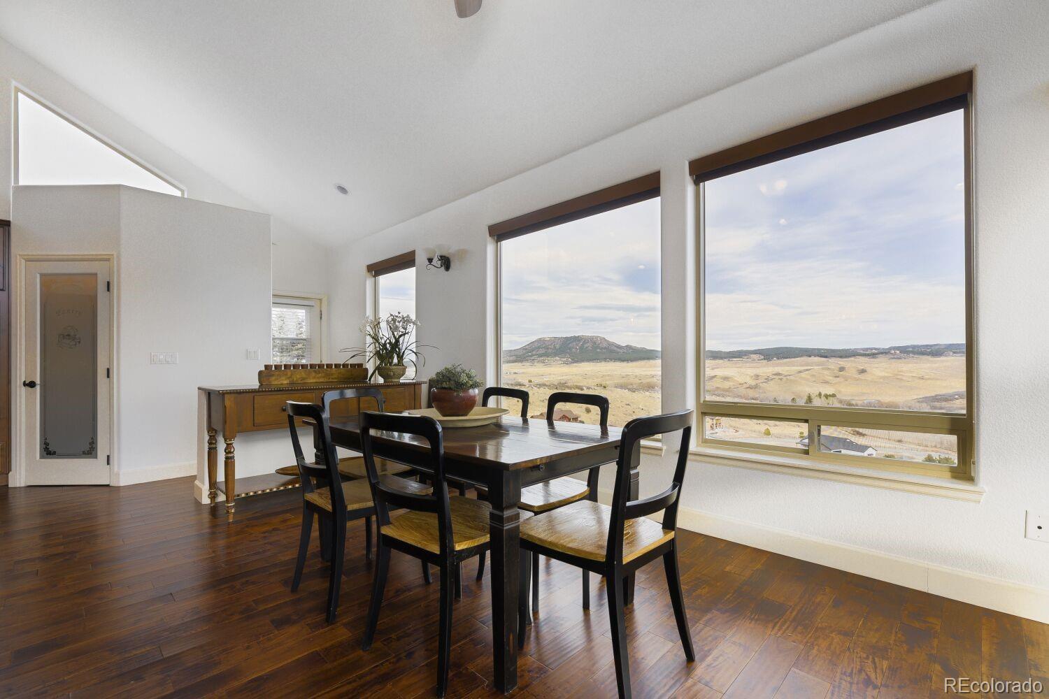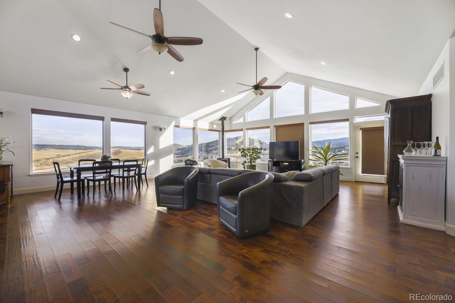 VIEWS! VIEWS! VIEWS! Hilltop Mountain Ranch retreat in the highly desirable Perry Park area, just two minutes from Perry Park Golf and Country Club. This custom home showcases an open-concept design with truly spectacular panoramic mountain views from nearly every room. The great room flows seamlessly into a chef’s kitchen built for entertaining, featuring designer knotty alder cabinetry, granite countertops, a tumbled marble backsplash, a walk-in pantry, stainless steel appliances, a bronze pot filler, and candlelight designer pendant lighting over an oversized breakfast bar. Hardwood plank flooring spans the kitchen, dining area, great room, entry, and hallways. Step outside to a massive composite deck overlooking the mountains—perfect for relaxing or hosting guests while taking in the incredible scenery. The primary suite offers stunning views and a large walk-in closet. All bathrooms feature granite countertops. The fully finished basement includes two additional bedrooms, two additional bathrooms, and a spacious flex area ideal for a home office, game room, or media space. An oversized three-car garage provides ample room for vehicles and storage. With breathtaking views, a functional layout, and proximity to golf, dining, and outdoor recreation, seclusion and privacy kiss this mountain home.