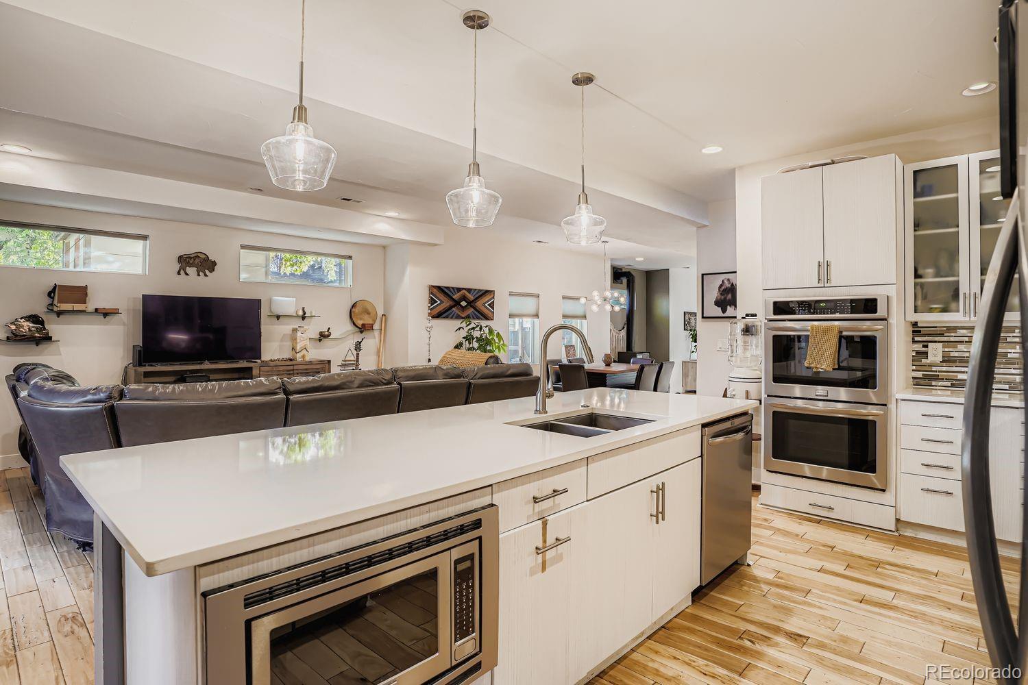 Centrally located on a quiet street just blocks from University of Denver, Platt Park, Wash Park, and South Pearl Street with access to Denver's best parks, shops, and restaurants like Sushi Den and Park Burger. Quick drive to the nearby light rail or easy access to I-25 for a short commute. The main level features an open floor plan with tall ceilings and tons of natural light, wood burning stove, wet bar with wine cooler, and a well-appointed kitchen including stainless steel appliances, quartz countertops, custom soft-close drawers and ample storage with a walk-in pantry. A bedroom/office and 3/4 bathroom complete the thoughtfully designed main level floor plan. Upstairs, you'll find three bedrooms including a primary suite complete with a 5-piece en suite bathroom, and sizeable walk-in closet. Two additional bedrooms, a full bathroom and additional loft/flex space provide plenty of space for family and guests. The laundry room is also conveniently located upstairs and includes a stainless dog washing sink. Outside, the beautifully landscaped yard on a double lot offers a peaceful retreat, from the covered front patio to the backyard with a custom wood deck, spa, irrigated garden and plenty of yard space with southern exposure. The 2-car detached garage provides convenient parking and extra storage space, including a weight rack for your workouts. Ideally situated on a quiet street just two blocks from campus, this home offers walkable access to some of Denver's most desired amenities. Check out this beautiful modern home in one of Denver's most desirable neighborhoods!