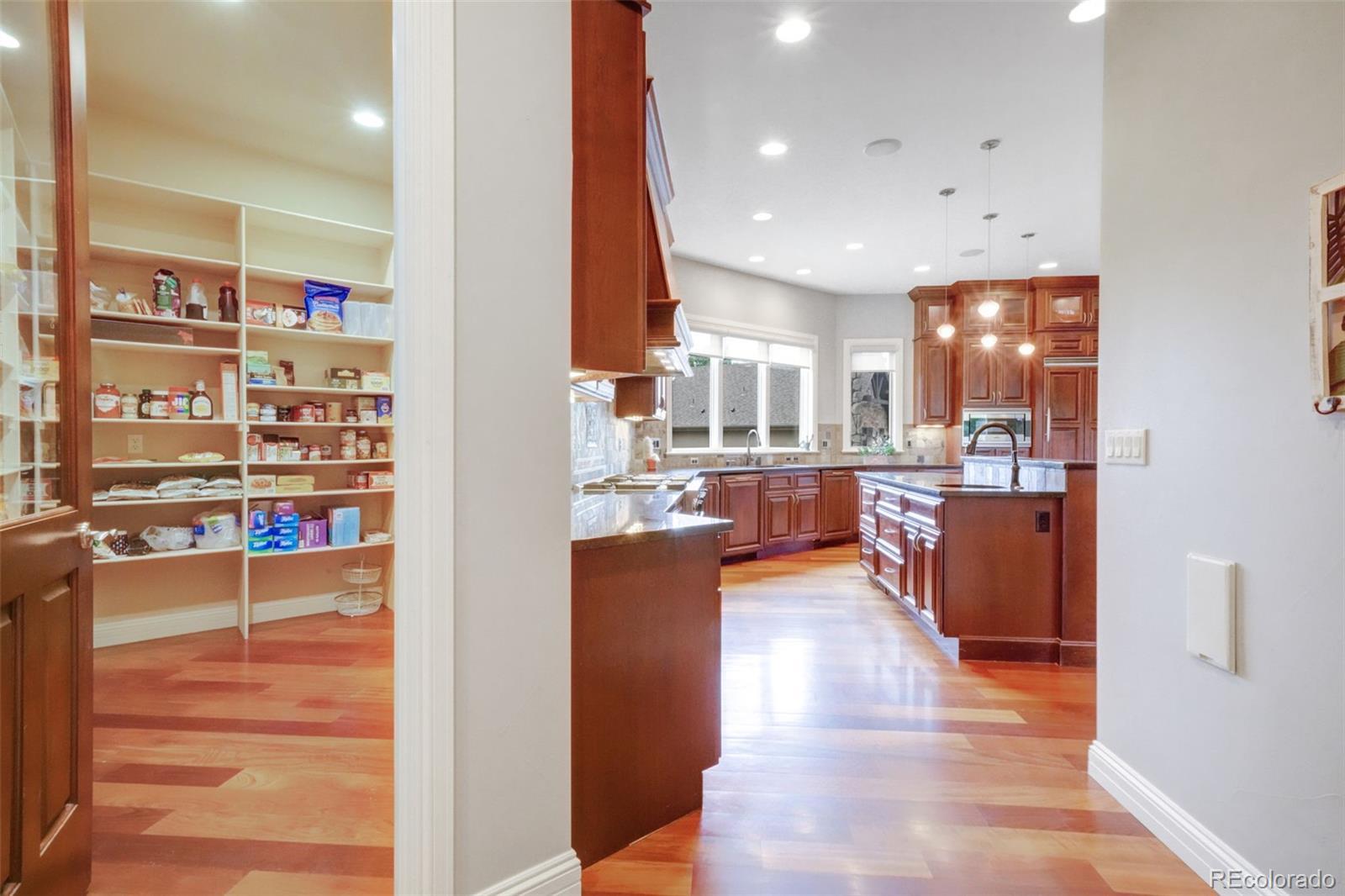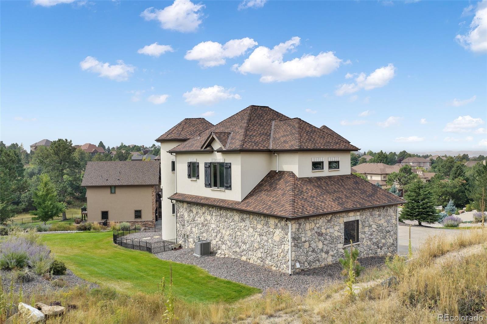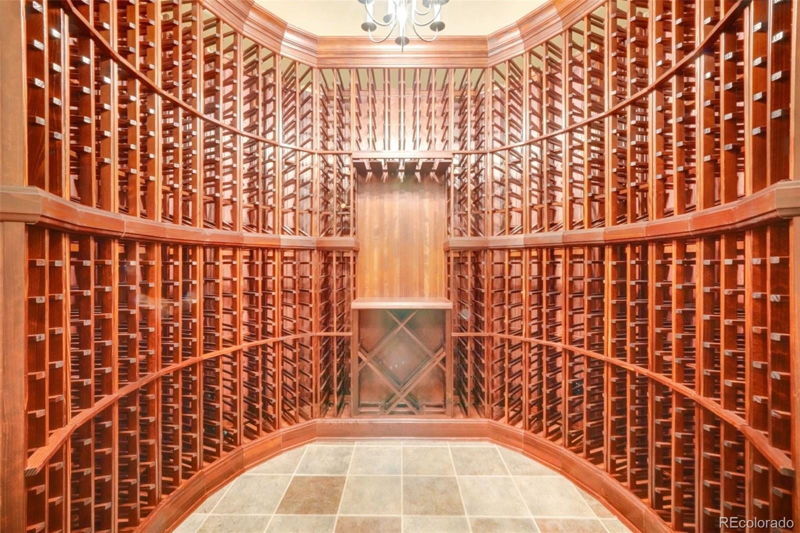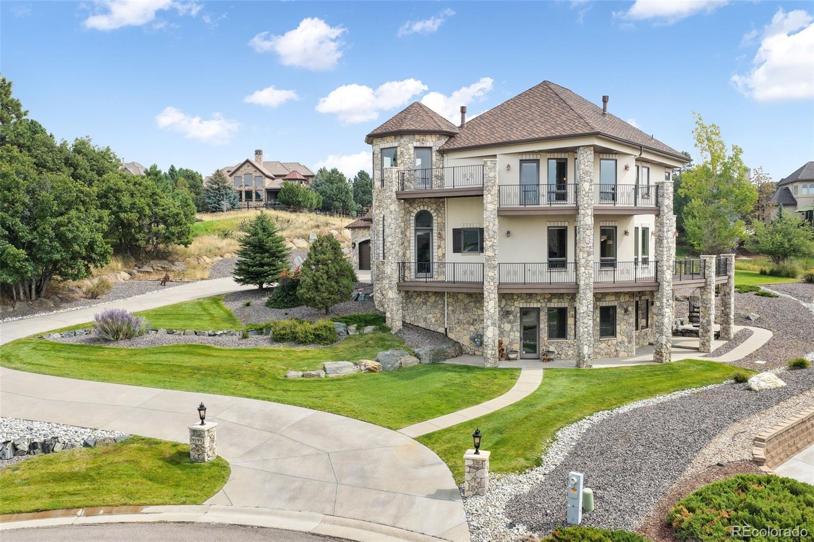 This stunning 7,828 sq. ft. custom home sits privately at the end of a cul-de-sac on a .58-acre lot, offering four bedrooms, six bathrooms, and a three-car garage. Its stone and stucco exterior, multiple decks, and striking architecture create incredible curb appeal. A grand covered stone entry and custom wood door welcome you inside. The main level features wood floors, abundant natural light, and a wrought-iron staircase. A spacious office with built-ins sits to one side, while the formal dining room connects to a butler’s pantry with warming drawer and mini fridge. The living room boasts a gas fireplace, built-in entertainment center, and floor-to-ceiling windows. The chef’s kitchen includes custom cabinetry, granite countertops, double ovens, built-in refrigerator, gas cooktop with wood hood, vegetable sink, and a massive walk-in pantry. A casual dining nook and large mudroom—with a fun slide from the upper level—add to the home’s unique design. A powder bath completes the main floor. Upstairs, a glass-enclosed sitting room with deck captures the views. The primary suite features a private deck, custom built-ins, and a spa-like five-piece bath with jetted tub, oversized shower, and a huge walk-in closet connected to the laundry room. Two additional bedrooms, each with en-suite baths, finish the level. The finished basement is designed for entertaining with a full bar, wine room, multiple recreation areas, theater, fitness room, bedroom with en-suite bath, second laundry room, and abundant storage. Located just minutes from shopping, dining, downtown Denver, and DIA, this home offers exceptional privacy and convenience.