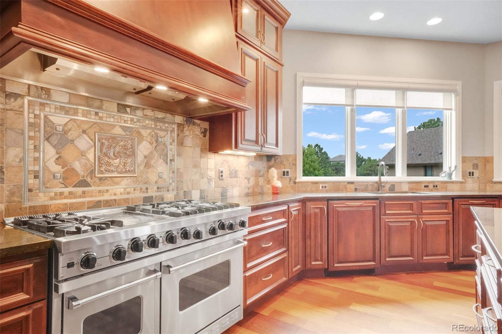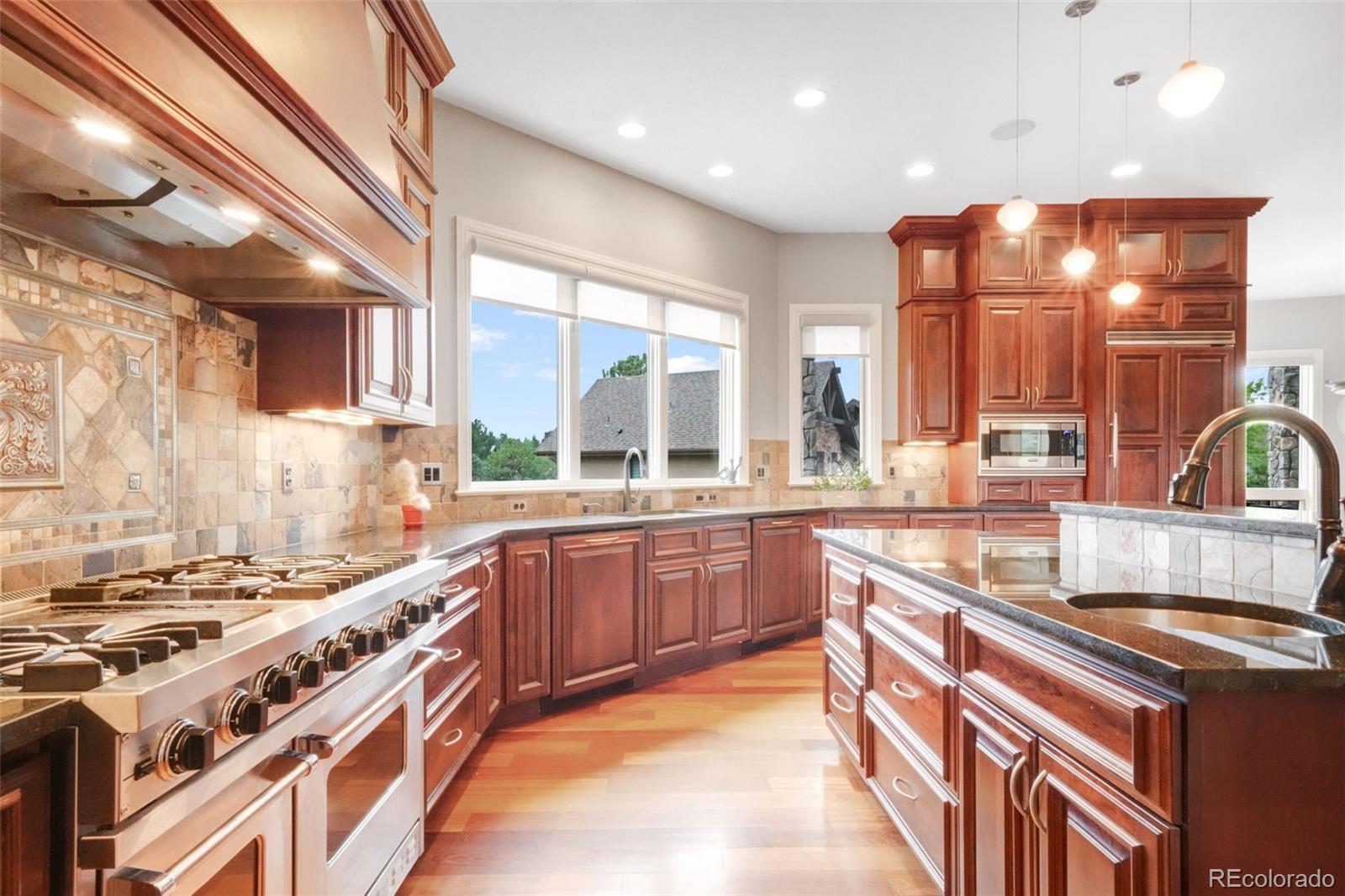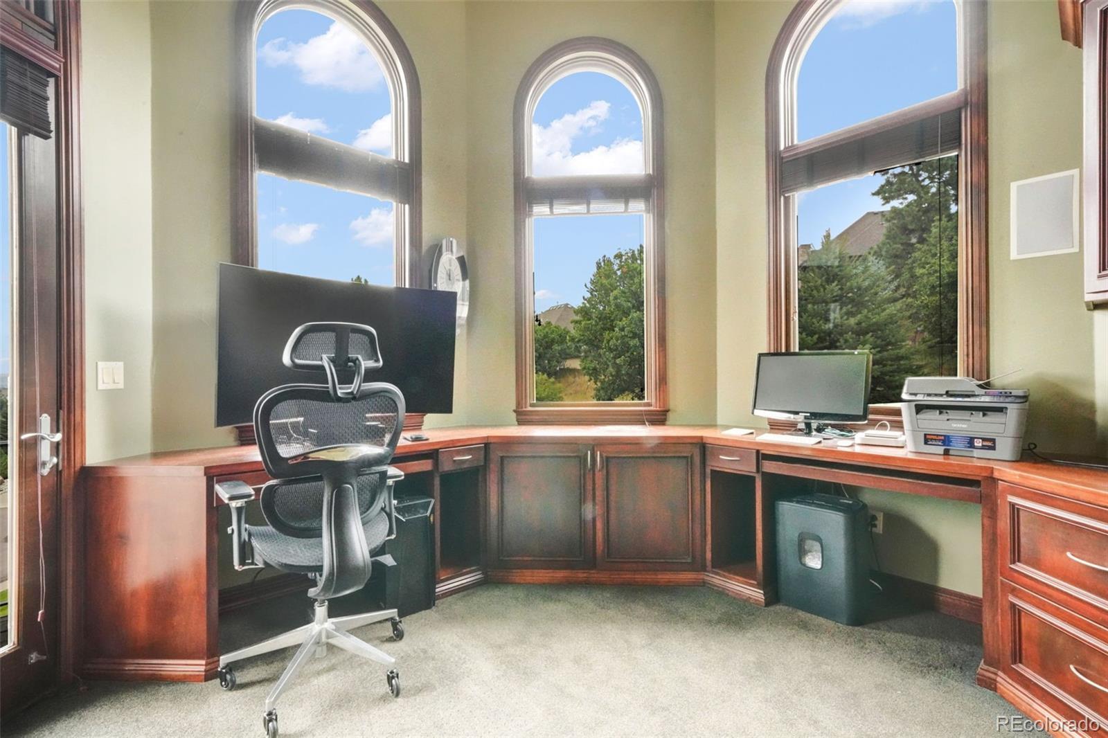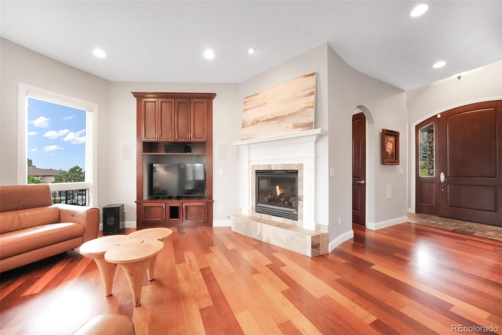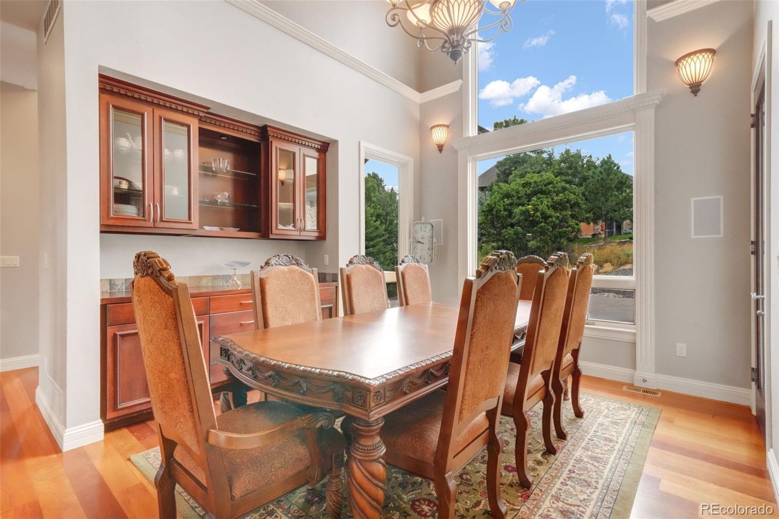 This stunning 7,828 sq. ft. custom home sits privately at the end of a cul-de-sac on a .58-acre lot, offering four bedrooms, six bathrooms, and a three-car garage. Its stone and stucco exterior, multiple decks, and striking architecture create incredible curb appeal. A grand covered stone entry and custom wood door welcome you inside. The main level features wood floors, abundant natural light, and a wrought-iron staircase. A spacious office with built-ins sits to one side, while the formal dining room connects to a butler’s pantry with warming drawer and mini fridge. The living room boasts a gas fireplace, built-in entertainment center, and floor-to-ceiling windows. The chef’s kitchen includes custom cabinetry, granite countertops, double ovens, built-in refrigerator, gas cooktop with wood hood, vegetable sink, and a massive walk-in pantry. A casual dining nook and large mudroom—with a fun slide from the upper level—add to the home’s unique design. A powder bath completes the main floor. Upstairs, a glass-enclosed sitting room with deck captures the views. The primary suite features a private deck, custom built-ins, and a spa-like five-piece bath with jetted tub, oversized shower, and a huge walk-in closet connected to the laundry room. Two additional bedrooms, each with en-suite baths, finish the level. The finished basement is designed for entertaining with a full bar, wine room, multiple recreation areas, theater, fitness room, bedroom with en-suite bath, second laundry room, and abundant storage. Located just minutes from shopping, dining, downtown Denver, and DIA, this home offers exceptional privacy and convenience.