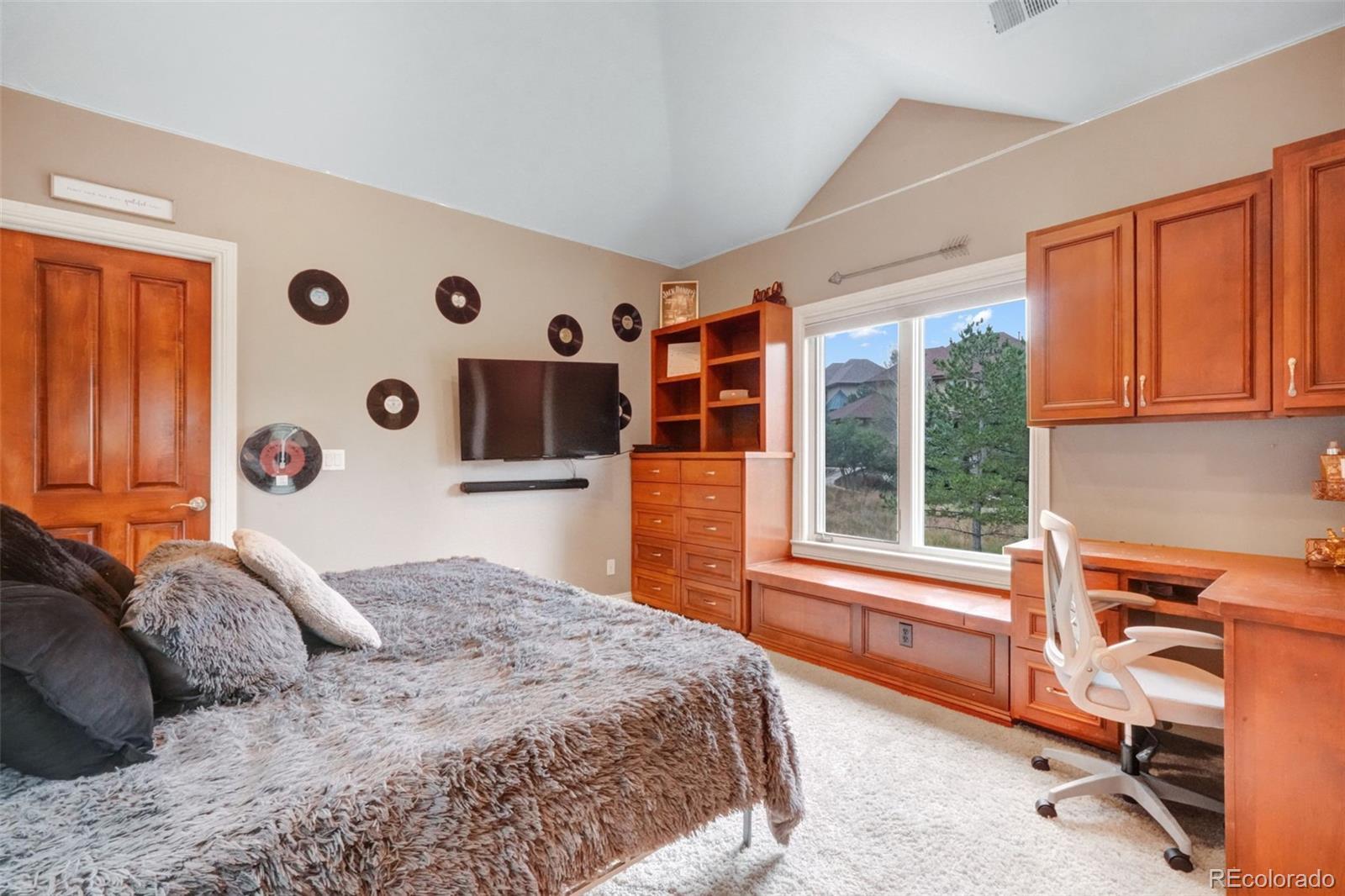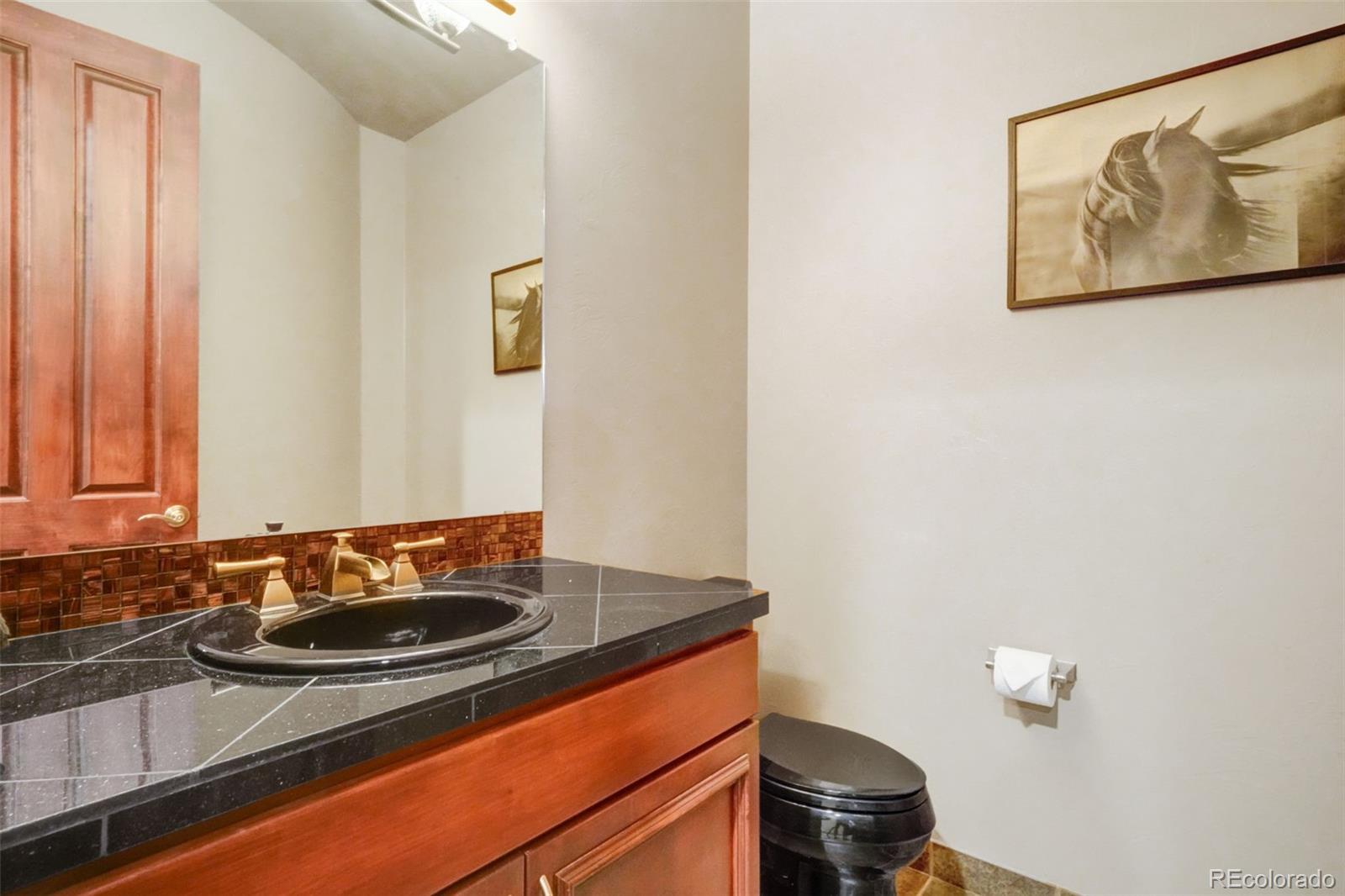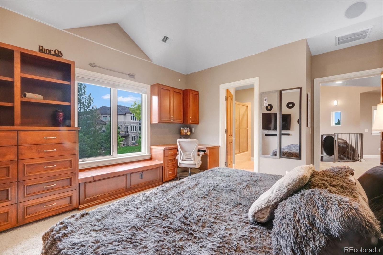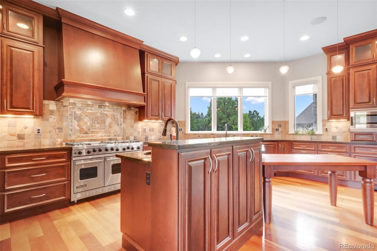 This stunning 7,828 sq. ft. custom home sits privately at the end of a cul-de-sac on a .58-acre lot, offering four bedrooms, six bathrooms, and a three-car garage. Its stone and stucco exterior, multiple decks, and striking architecture create incredible curb appeal. A grand covered stone entry and custom wood door welcome you inside. The main level features wood floors, abundant natural light, and a wrought-iron staircase. A spacious office with built-ins sits to one side, while the formal dining room connects to a butler’s pantry with warming drawer and mini fridge. The living room boasts a gas fireplace, built-in entertainment center, and floor-to-ceiling windows. The chef’s kitchen includes custom cabinetry, granite countertops, double ovens, built-in refrigerator, gas cooktop with wood hood, vegetable sink, and a massive walk-in pantry. A casual dining nook and large mudroom—with a fun slide from the upper level—add to the home’s unique design. A powder bath completes the main floor. Upstairs, a glass-enclosed sitting room with deck captures the views. The primary suite features a private deck, custom built-ins, and a spa-like five-piece bath with jetted tub, oversized shower, and a huge walk-in closet connected to the laundry room. Two additional bedrooms, each with en-suite baths, finish the level. The finished basement is designed for entertaining with a full bar, wine room, multiple recreation areas, theater, fitness room, bedroom with en-suite bath, second laundry room, and abundant storage. Located just minutes from shopping, dining, downtown Denver, and DIA, this home offers exceptional privacy and convenience.