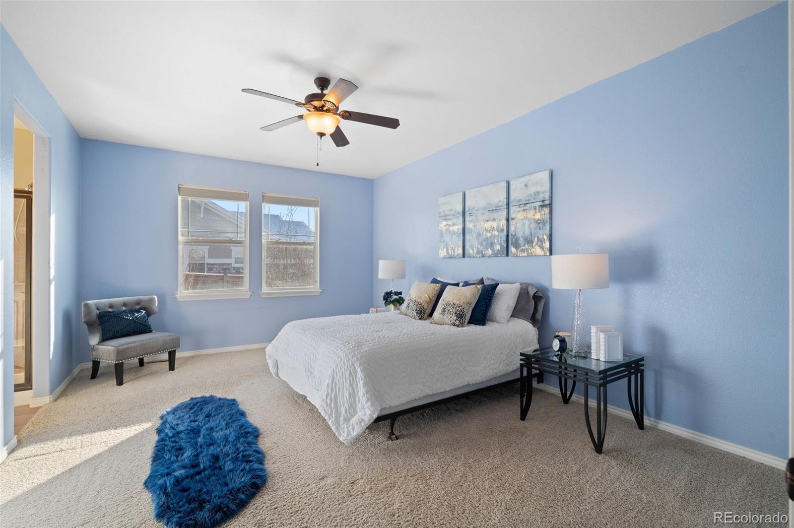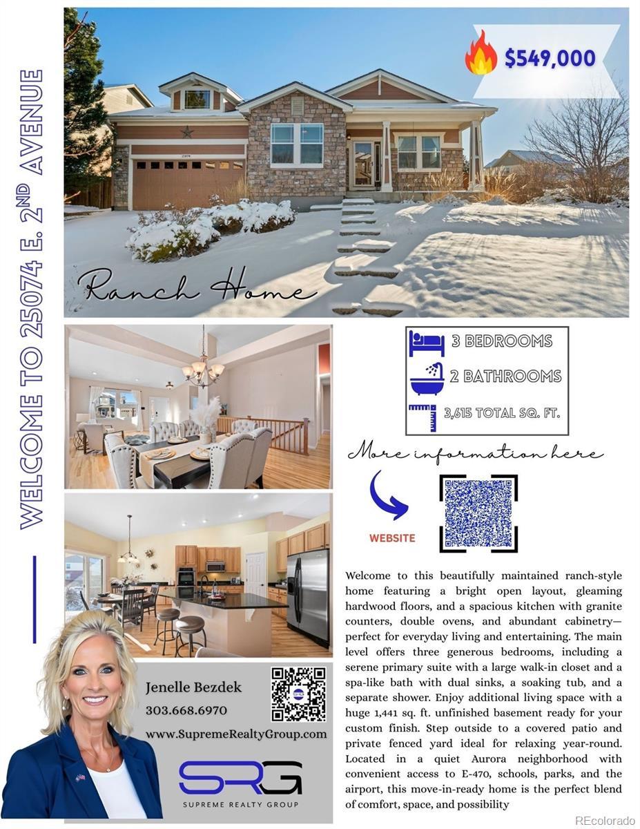 Welcome home to this beautifully staged and move-in-ready ranch in the highly desired Traditions community! Featuring 3 bedrooms, 2 baths, a bright open-concept layout, and a HUGE 1,441 sq ft unfinished basement offering endless equity potential. Enjoy main-level living, a spacious kitchen with abundant storage, and a private primary suite with walk-in closet. The corner lot, large backyard, 2-car garage, 3-year old roof, and quiet interior location make this home the perfect retreat. Traditions offer a resort-style clubhouse, pool, parks, trails, and quick access to E-470, I-70, DIA, Buckley Space Force Base, and the Anschutz Medical Campus. Immaculate, stylish, and priced to sell — this is the home your buyers have been waiting for! ***ASSUMABLE 2.5% VA LOAN AVAIALBLE FOR QUALIFIED OWNER-OCCUPIED BUYERS - ASK FOR DETAILS *****