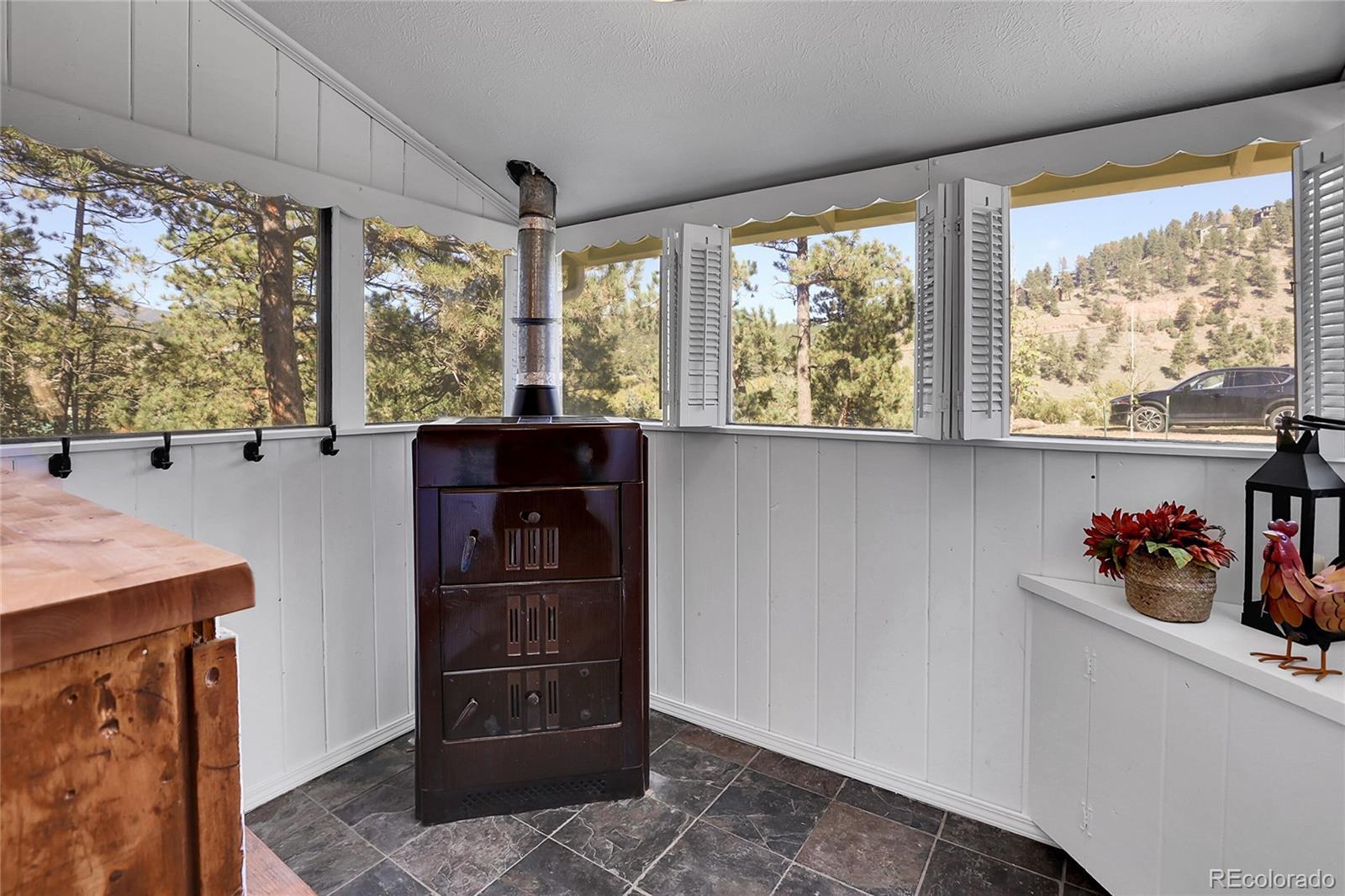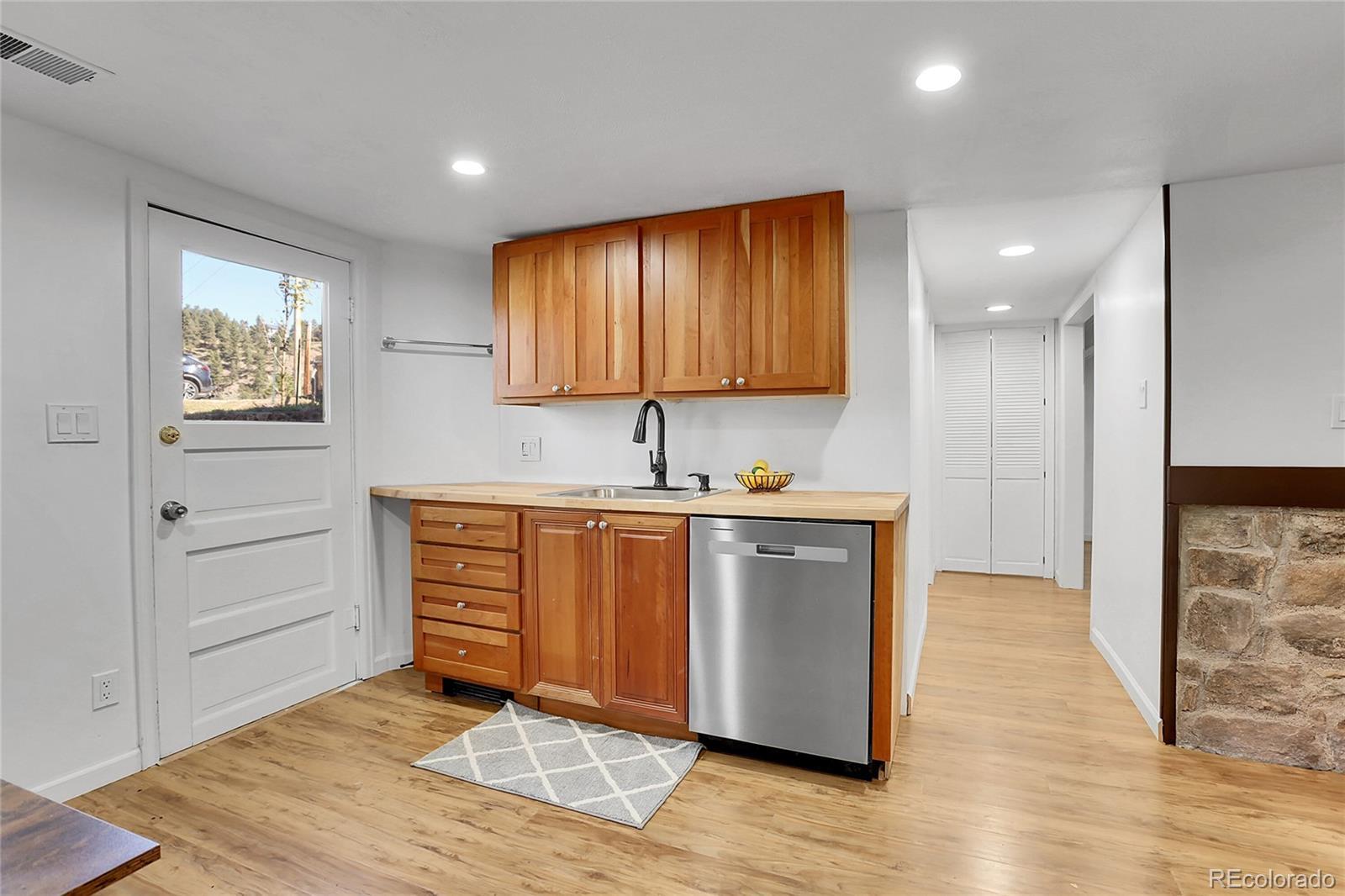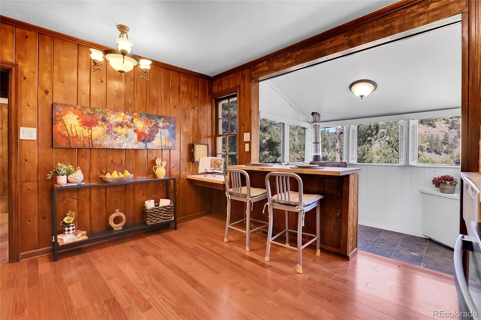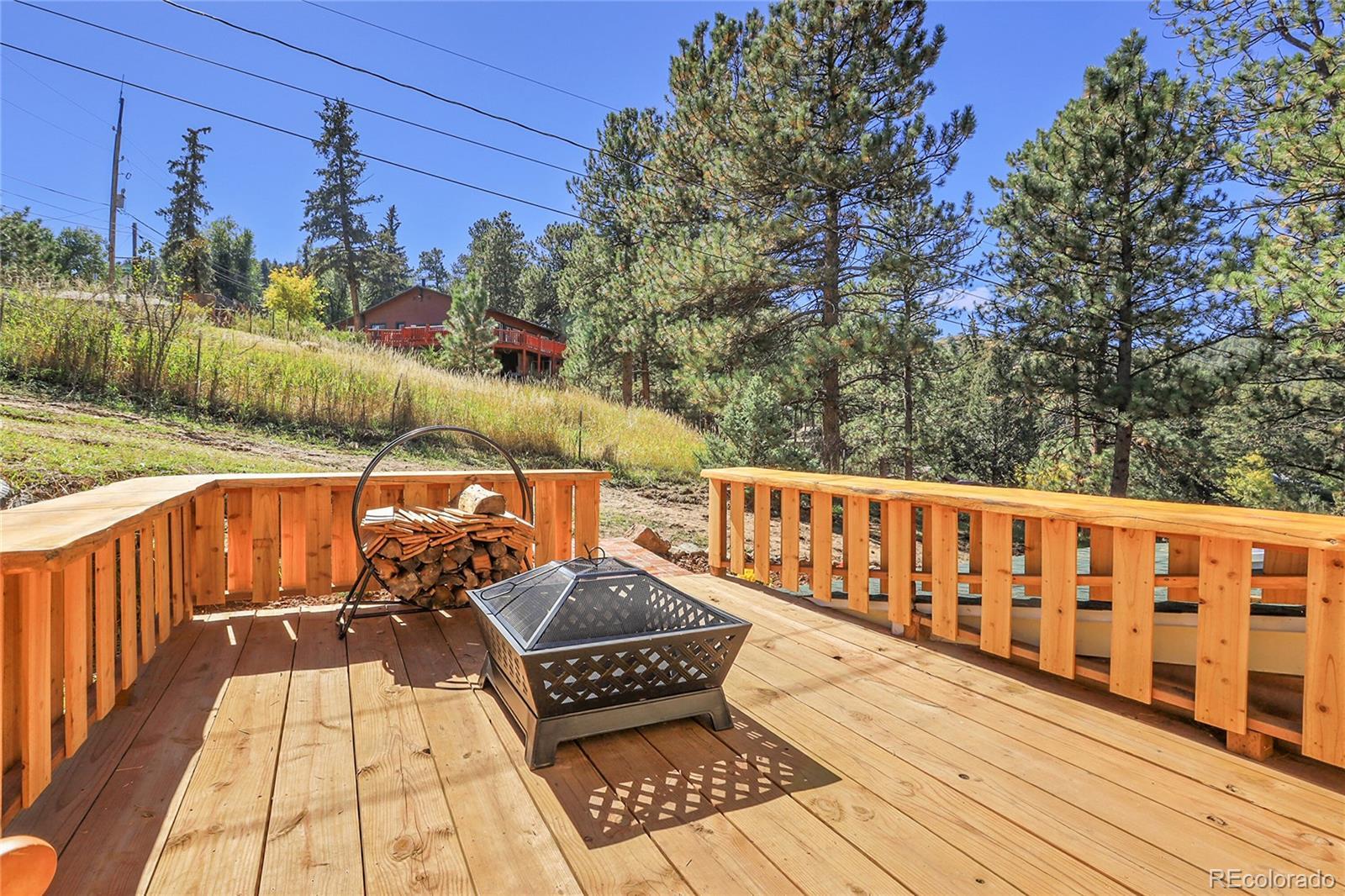Welcome to this darling cottage, tucked away at the end of a quiet street on a rare, private ½-acre double lot with scenic views. This property blends vintage charm with extensive modern improvements for peace of mind, including a new electric panel, new roof, new sewer line, new interior & exterior paint, new deck, new bathroom & much more. Step inside & you will find warm character & ample space, starting with a cozy living room with hardwood floors & stone fireplace, and additional large sunlit family room. The updated kitchen is a gathering place, complete with all-new butcher block countertops & farm sink. Bar seating makes the kitchen a great place to hang, especially next to the cozy wood burning stove. The bedroom offers flexibility—perfect as a primary for main level living, or an office. Many rooms feature knotty pine, which can be left as-is or painted for a modern farmhouse look. Head downstairs to find a brand new kitchenette, 2 bedrooms with ample closets (one a walk-in), flex space for workout or crafting, laundry room & a lovely new bathroom with a luxury shower. This is an ideal primary bedroom area, with access to the yard. The newly built south-facing deck offers great outdoor living, as does much of the lot with plenty of flat area, fenced garden, privacy & views! The large attached workshop/storage has plentiful cabinetry & workbench Lots of parking too. This is a peaceful, private setting where one can hear the rippling waters of Bear Creek below. The darling hamlet of Kittredge offers so much - walk to the coffee shop, stroll to the park for a stream side picnic, experience fishing & miles of trails just 5 min away. And, it’s only 2 miles to downtown Evergreen with restaurants, shops, amenities & the lake. Or head to Red Rocks Amphitheater & all that Denver offers – just 12 min away! Public road and utilities, not to mention the plethora of upgrades, make this vintage charmer a modern delight! 3D Tour & more pics: www.3425 BurnhamDrive.com