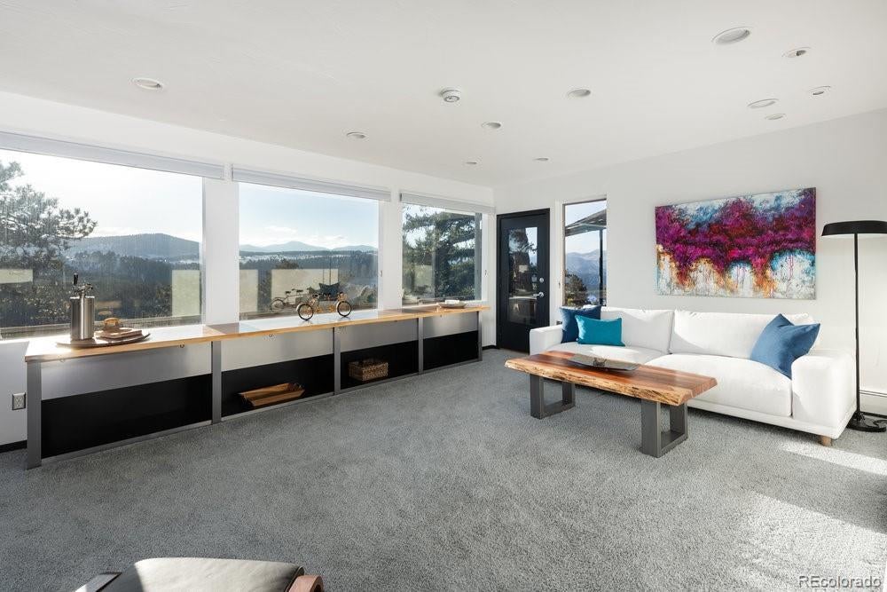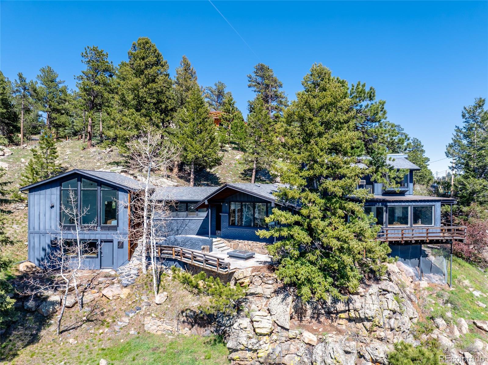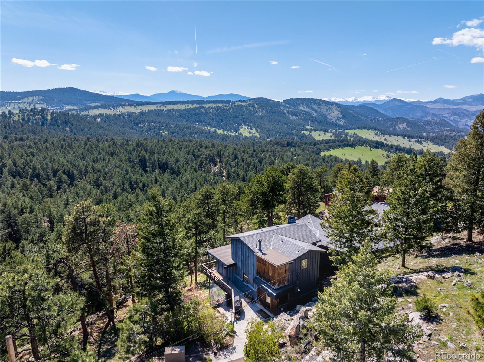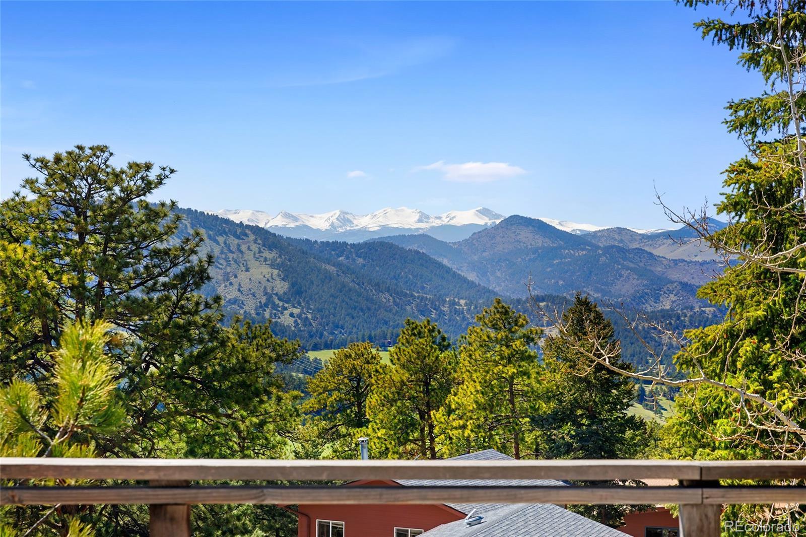 Set on an acre and a half on coveted Lookout Mountain, this stunning mid-century mountain retreat seamlessly blends architectural elegance with sweeping mountain views. Walls of windows flood the open living spaces with natural light, creating a seamless connection to the serene landscape with expansive views from nearly every room. The living room is anchored by a striking wood burning fireplace with floor to ceiling stone surround. The updated kitchen offers leathered granite countertops, stainless steel backsplash, original wood cabinetry and sleek appliances. The kitchen opens to the family room featuring a custom built-in entertainment center and storage, all opening up to panoramic views. Both living spaces provide access to the wraparound balcony and stone patio with fire pit. The luxurious primary retreat showcases soaring vaulted ceilings and majestic views that will have you wondering if you are waking up in a dream. Unwind in the large soaking tub, refresh in the tiled shower and enjoy dual vanities all with unique windows set against the privacy of rock outcroppings. Additional main level accommodations include a secondary bedroom, currently configured as a home office with built-in desk and shelving and a full bathroom. A curved staircase leads to the secondary suite with a spacious bedroom and five-piece bathroom with custom tile soaking tub and shower. Separate guest quarters feature a bedroom with built-ins and bathroom. A heated stone walkway leads to the oversized detached garage, complete with a newly installed electric car charger. Bonus room above the garage is perfect for a gym or workshop and offers a large storage room. Enjoy unparalleled peace and tranquility all with easy access to Golden, Denver, and ski resorts. With close proximity to Apex Park and scenic hiking trails, this extraordinary home offers the perfect blend of nature, luxury, and modern living. Don’t miss the opportunity to make this breathtaking mountain retreat your own.