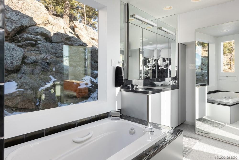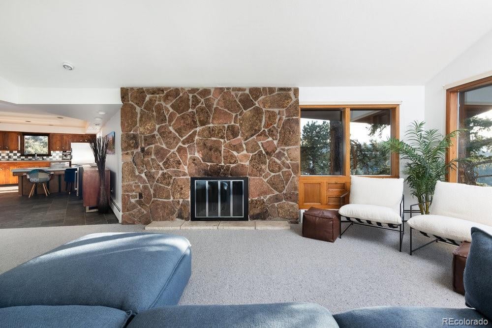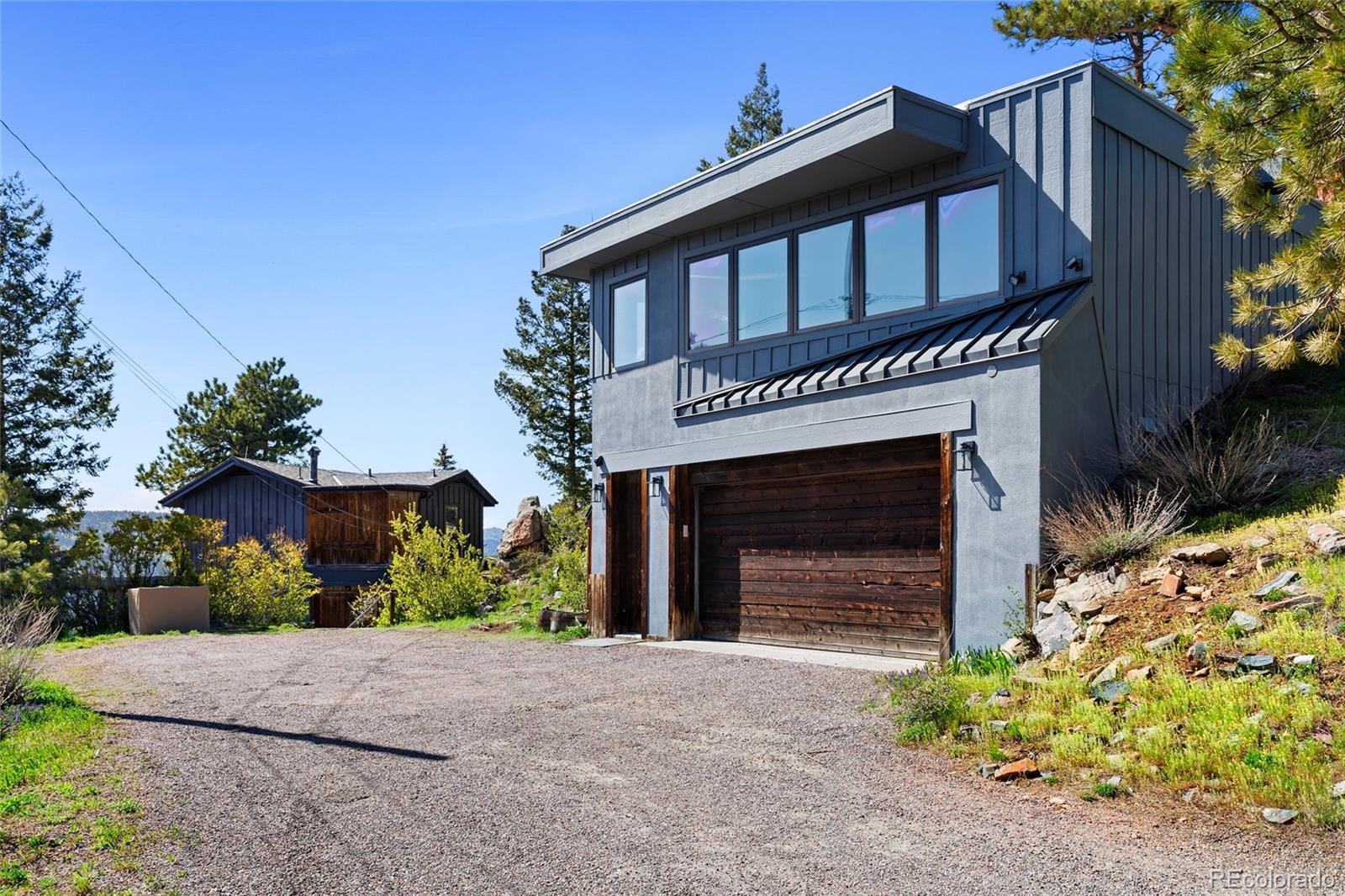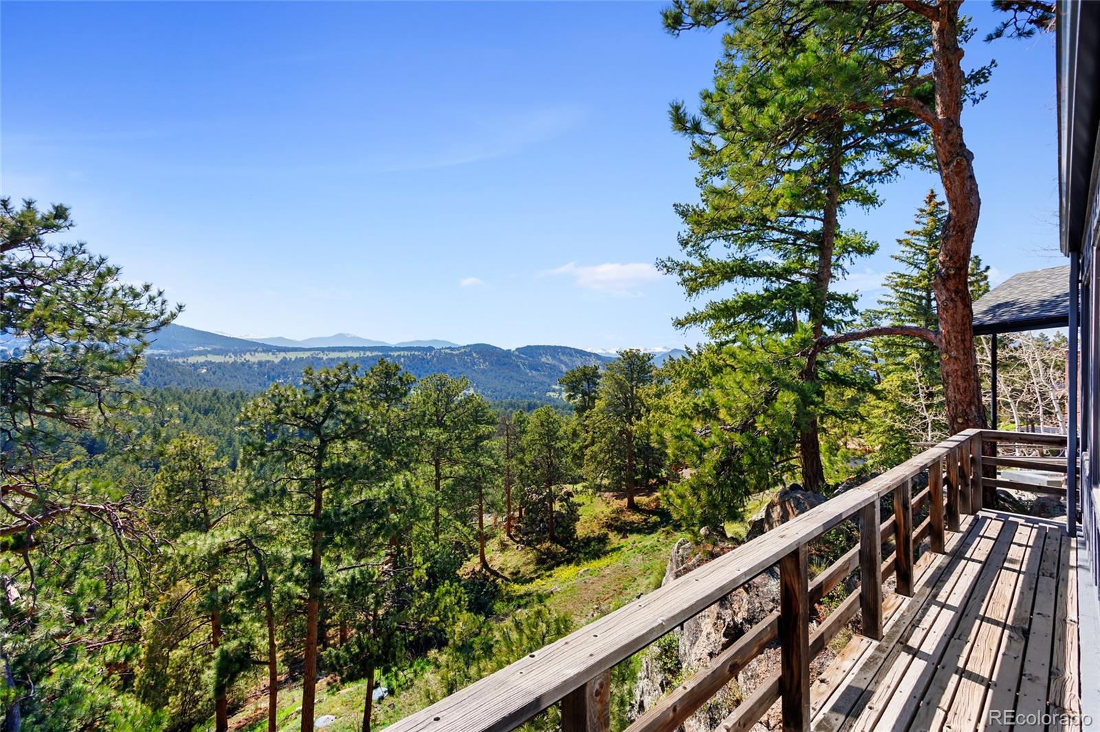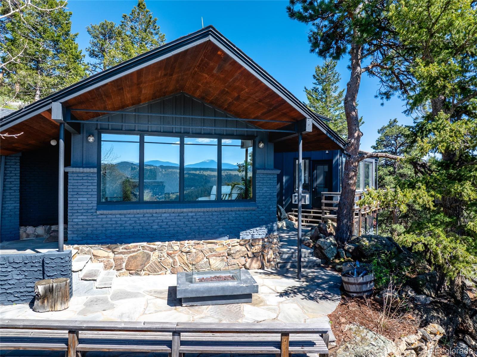 Set on an acre and a half on coveted Lookout Mountain, this stunning mid-century mountain retreat seamlessly blends architectural elegance with sweeping mountain views. Walls of windows flood the open living spaces with natural light, creating a seamless connection to the serene landscape with expansive views from nearly every room. The living room is anchored by a striking wood burning fireplace with floor to ceiling stone surround. The updated kitchen offers leathered granite countertops, stainless steel backsplash, original wood cabinetry and sleek appliances. The kitchen opens to the family room featuring a custom built-in entertainment center and storage, all opening up to panoramic views. Both living spaces provide access to the wraparound balcony and stone patio with fire pit. The luxurious primary retreat showcases soaring vaulted ceilings and majestic views that will have you wondering if you are waking up in a dream. Unwind in the large soaking tub, refresh in the tiled shower and enjoy dual vanities all with unique windows set against the privacy of rock outcroppings. Additional main level accommodations include a secondary bedroom, currently configured as a home office with built-in desk and shelving and a full bathroom. A curved staircase leads to the secondary suite with a spacious bedroom and five-piece bathroom with custom tile soaking tub and shower. Separate guest quarters feature a bedroom with built-ins and bathroom. A heated stone walkway leads to the oversized detached garage, complete with a newly installed electric car charger. Bonus room above the garage is perfect for a gym or workshop and offers a large storage room. Enjoy unparalleled peace and tranquility all with easy access to Golden, Denver, and ski resorts. With close proximity to Apex Park and scenic hiking trails, this extraordinary home offers the perfect blend of nature, luxury, and modern living. Don’t miss the opportunity to make this breathtaking mountain retreat your own.
