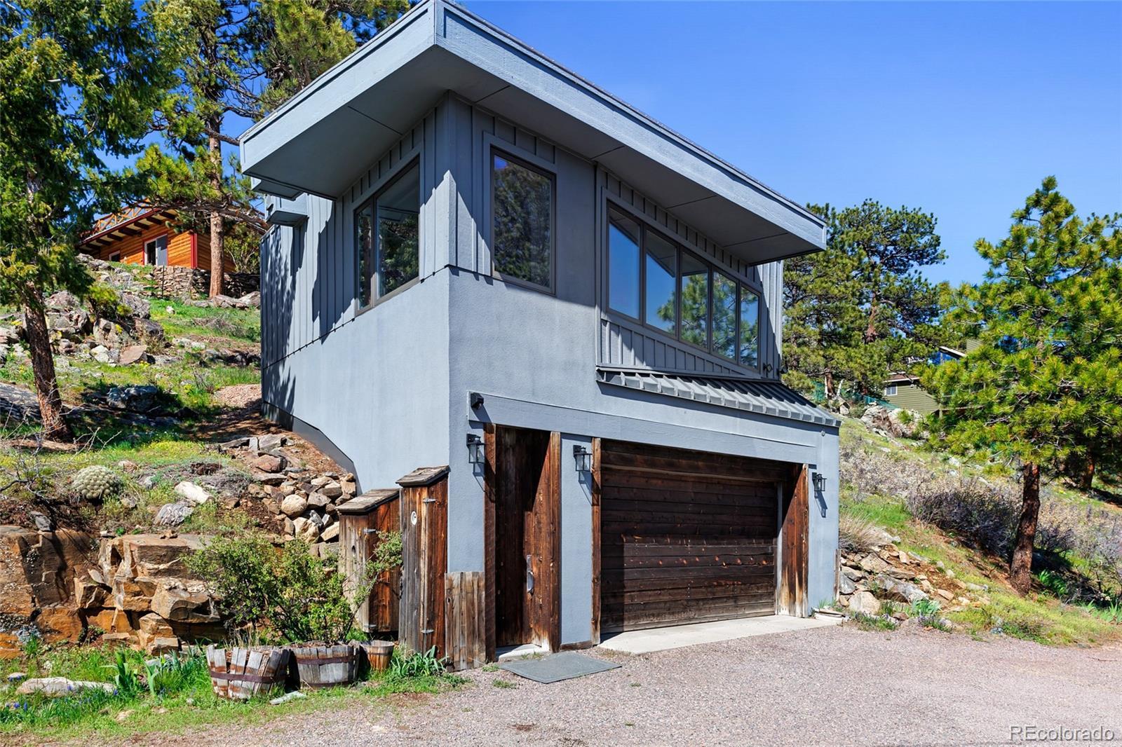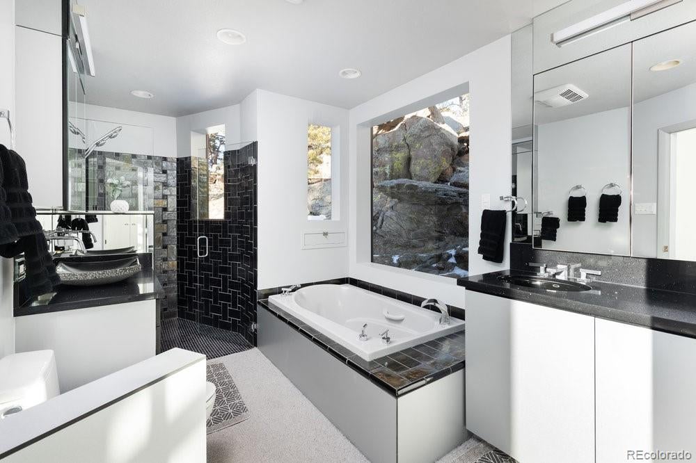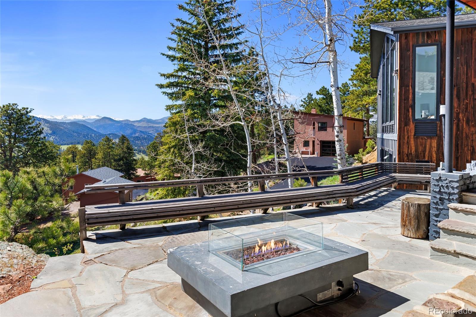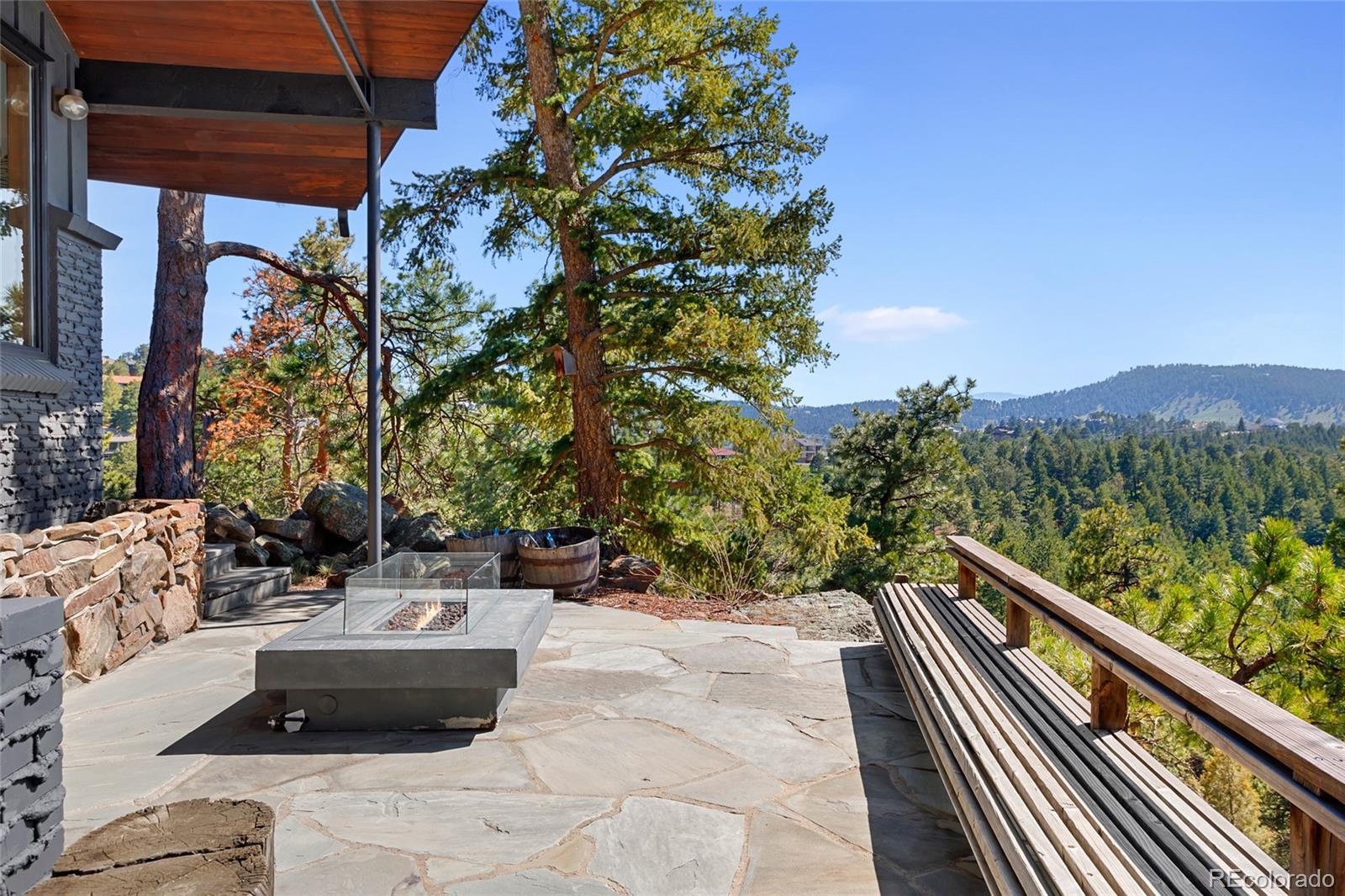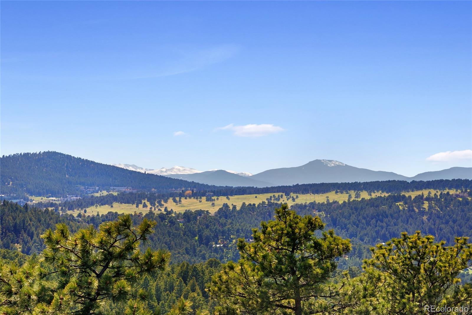 Set on an acre and a half on coveted Lookout Mountain, this stunning mid-century mountain retreat seamlessly blends architectural elegance with sweeping mountain views. Walls of windows flood the open living spaces with natural light, creating a seamless connection to the serene landscape with expansive views from nearly every room. The living room is anchored by a striking wood burning fireplace with floor to ceiling stone surround. The updated kitchen offers leathered granite countertops, stainless steel backsplash, original wood cabinetry and sleek appliances. The kitchen opens to the family room featuring a custom built-in entertainment center and storage, all opening up to panoramic views. Both living spaces provide access to the wraparound balcony and stone patio with fire pit. The luxurious primary retreat showcases soaring vaulted ceilings and majestic views that will have you wondering if you are waking up in a dream. Unwind in the large soaking tub, refresh in the tiled shower and enjoy dual vanities all with unique windows set against the privacy of rock outcroppings. Additional main level accommodations include a secondary bedroom, currently configured as a home office with built-in desk and shelving and a full bathroom. A curved staircase leads to the secondary suite with a spacious bedroom and five-piece bathroom with custom tile soaking tub and shower. Separate guest quarters feature a bedroom with built-ins and bathroom. A heated stone walkway leads to the oversized detached garage, complete with a newly installed electric car charger. Bonus room above the garage is perfect for a gym or workshop and offers a large storage room. Enjoy unparalleled peace and tranquility all with easy access to Golden, Denver, and ski resorts. With close proximity to Apex Park and scenic hiking trails, this extraordinary home offers the perfect blend of nature, luxury, and modern living. Don’t miss the opportunity to make this breathtaking mountain retreat your own.