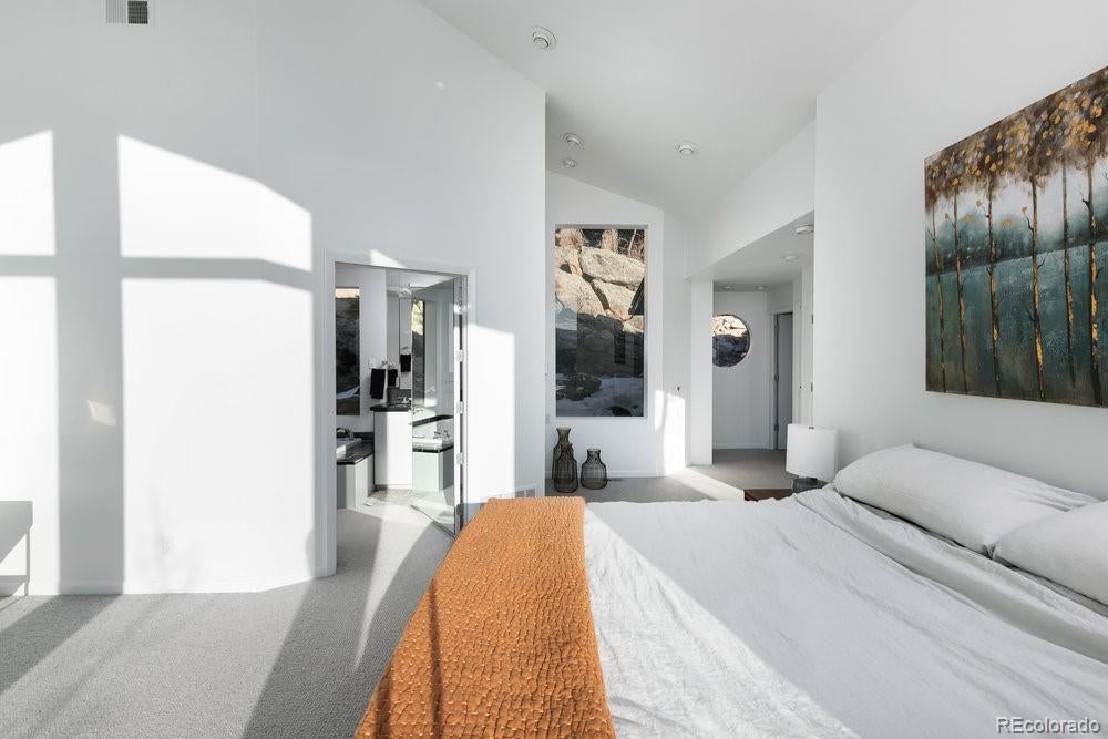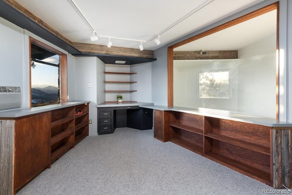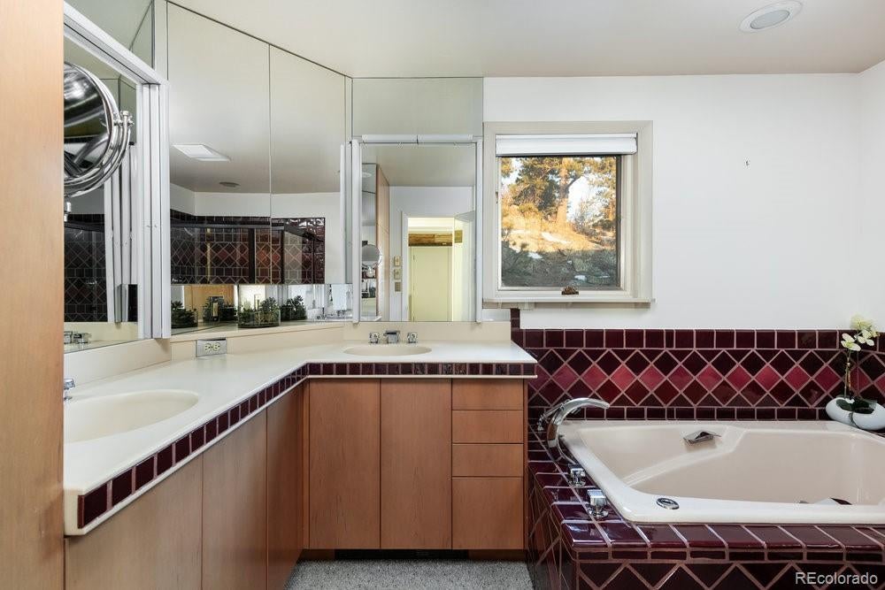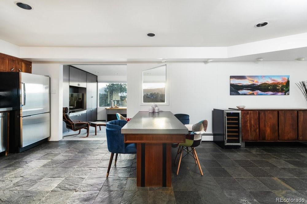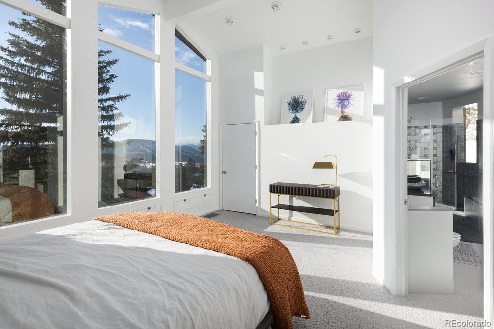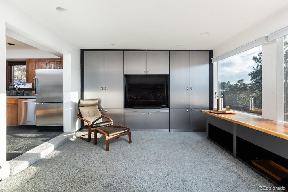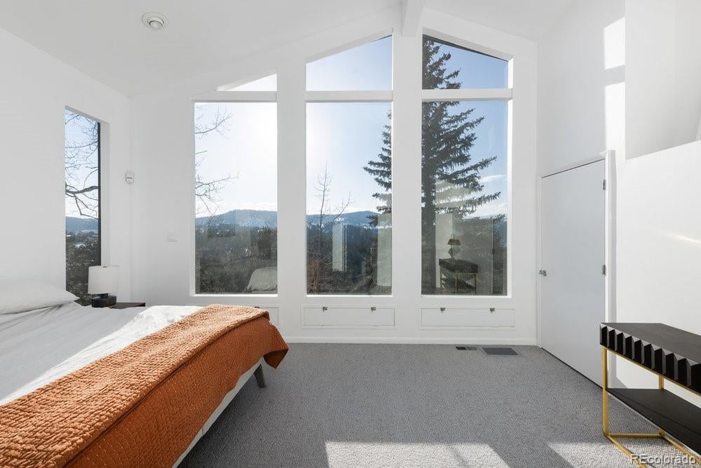 Set on an acre and a half on coveted Lookout Mountain, this stunning mid-century mountain retreat seamlessly blends architectural elegance with sweeping mountain views. Walls of windows flood the open living spaces with natural light, creating a seamless connection to the serene landscape with expansive views from nearly every room. The living room is anchored by a striking wood burning fireplace with floor to ceiling stone surround. The updated kitchen offers leathered granite countertops, stainless steel backsplash, original wood cabinetry and sleek appliances. The kitchen opens to the family room featuring a custom built-in entertainment center and storage, all opening up to panoramic views. Both living spaces provide access to the wraparound balcony and stone patio with fire pit. The luxurious primary retreat showcases soaring vaulted ceilings and majestic views that will have you wondering if you are waking up in a dream. Unwind in the large soaking tub, refresh in the tiled shower and enjoy dual vanities all with unique windows set against the privacy of rock outcroppings. Additional main level accommodations include a secondary bedroom, currently configured as a home office with built-in desk and shelving and a full bathroom. A curved staircase leads to the secondary suite with a spacious bedroom and five-piece bathroom with custom tile soaking tub and shower. Separate guest quarters feature a bedroom with built-ins and bathroom. A heated stone walkway leads to the oversized detached garage, complete with a newly installed electric car charger. Bonus room above the garage is perfect for a gym or workshop and offers a large storage room. Enjoy unparalleled peace and tranquility all with easy access to Golden, Denver, and ski resorts. With close proximity to Apex Park and scenic hiking trails, this extraordinary home offers the perfect blend of nature, luxury, and modern living. Don’t miss the opportunity to make this breathtaking mountain retreat your own.