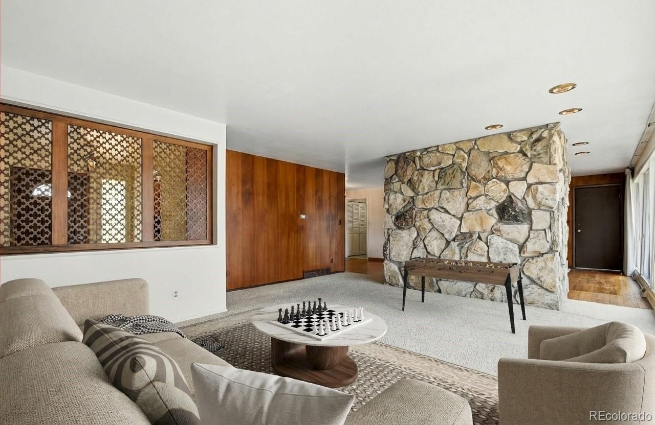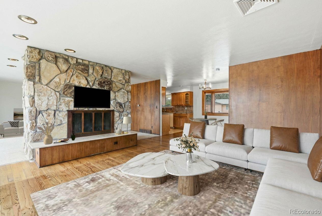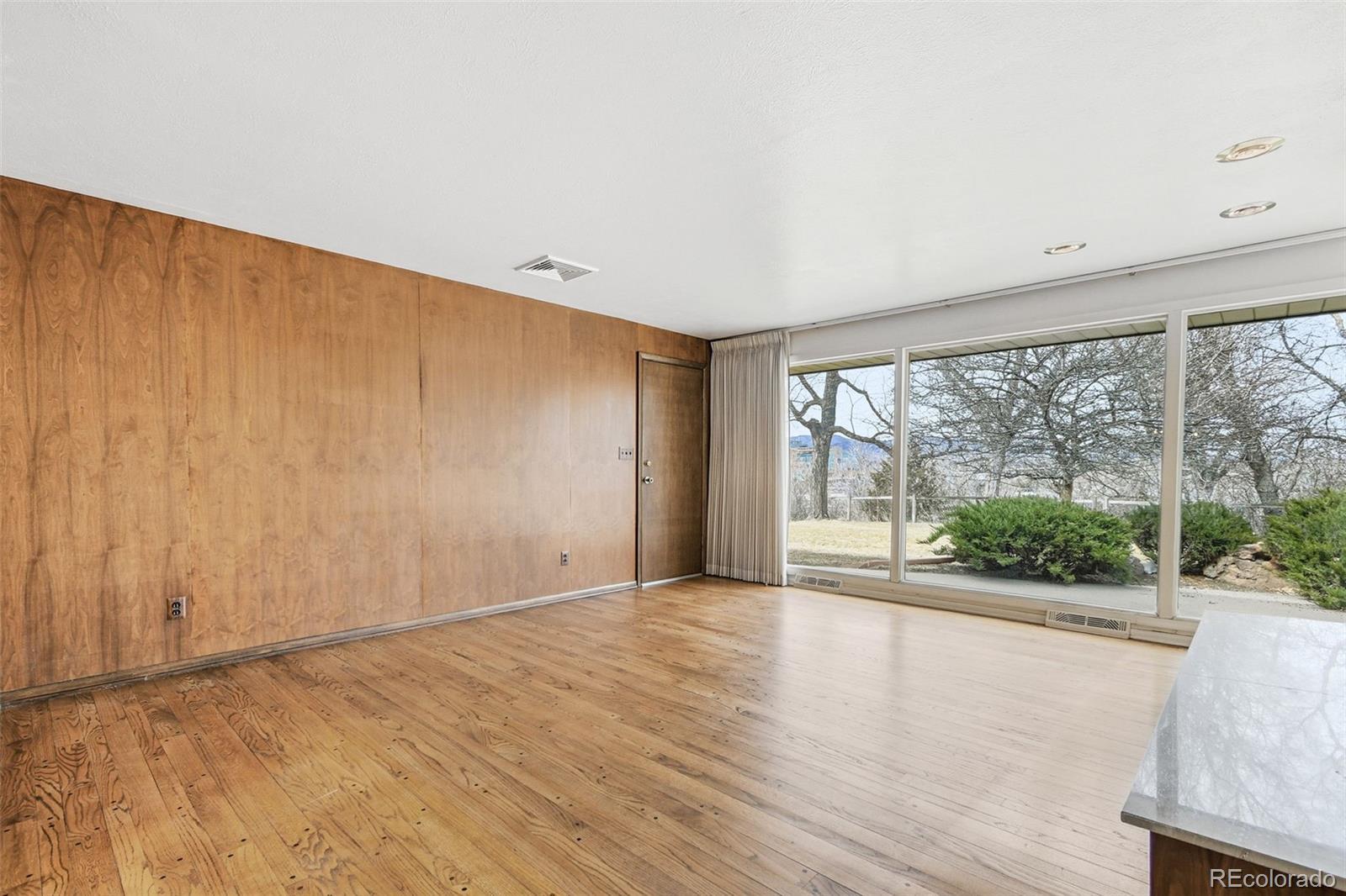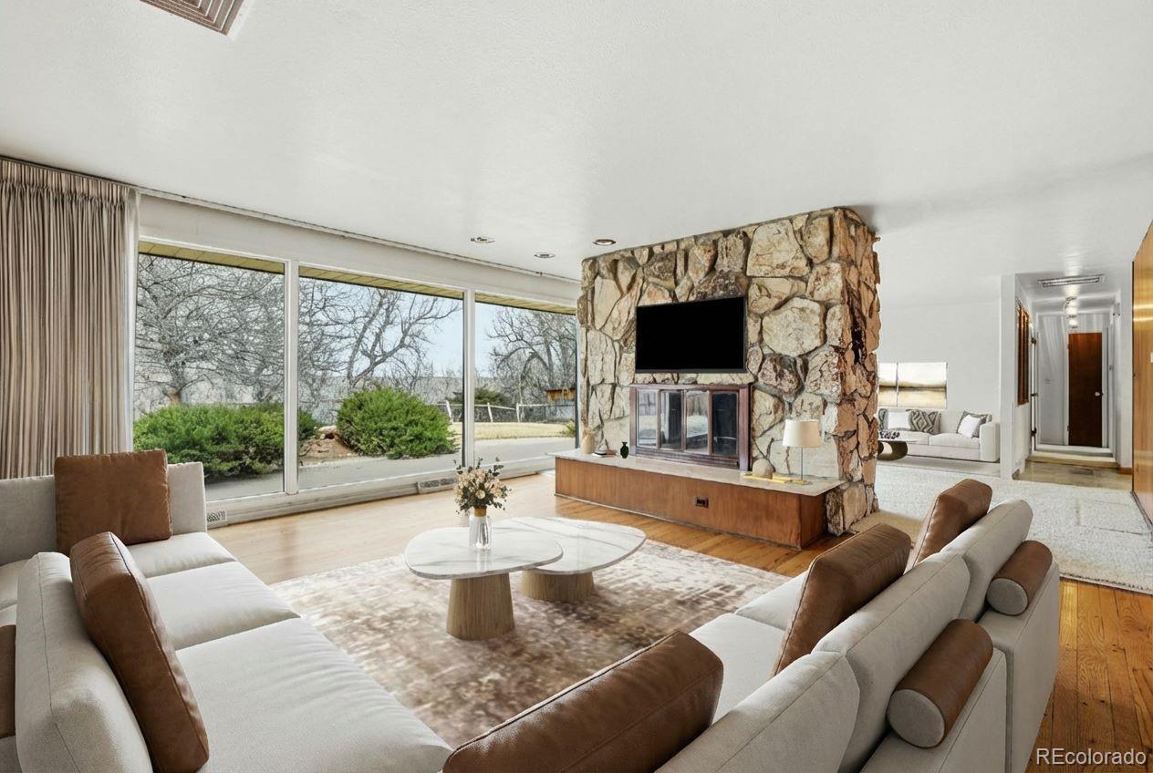 Welcome to this classic mid-century ranch on a private dead-end street in the coveted Applewood community. Set behind mature landscaping, the home greets you with an entry foyer and original custom wood-paneled divider that leads into the living area with original hardwood floors, mahogany-paneled walls, and a striking stone fireplace. The back of the home features floor-to-ceiling windows framing open-space, mountain, and lake views and fills the family room with tranquil vistas. The fully remodeled kitchen offers granite counters and updated appliances. Down the bedroom corridor you’ll find an original full bath and a bright secondary bedroom ideal for guests or a home office. The owner’s retreat includes custom paneled walls, two walk-in closets, a bay window, and direct access to the backyard. Outside, enjoy 300+ days of sunshine in a spacious, private yard with mature trees, established plantings, and a generous patio—perfect for entertaining. Upgraded electric service and custom wood-clad windows blend modern convenience with authentic mid-century character. A rare offering for buyers seeking original details with thoughtful updates.