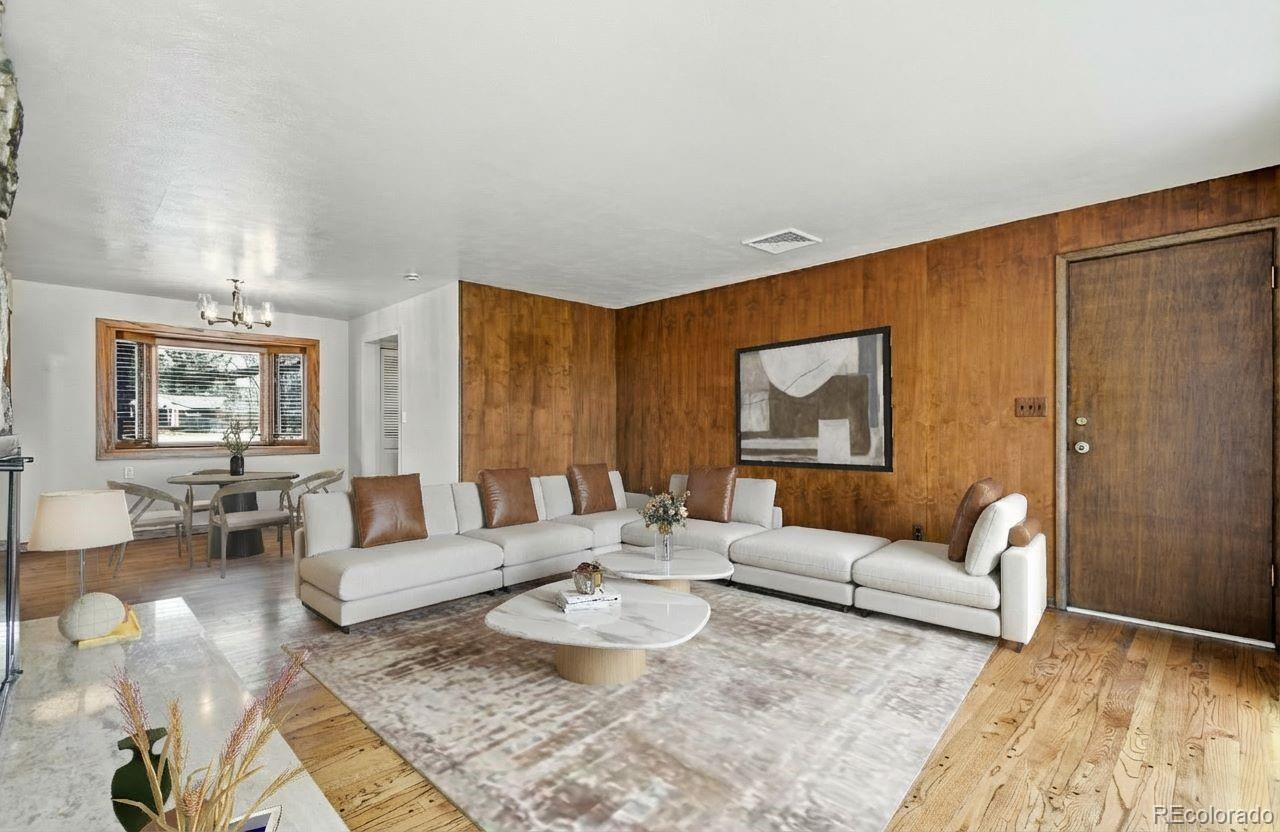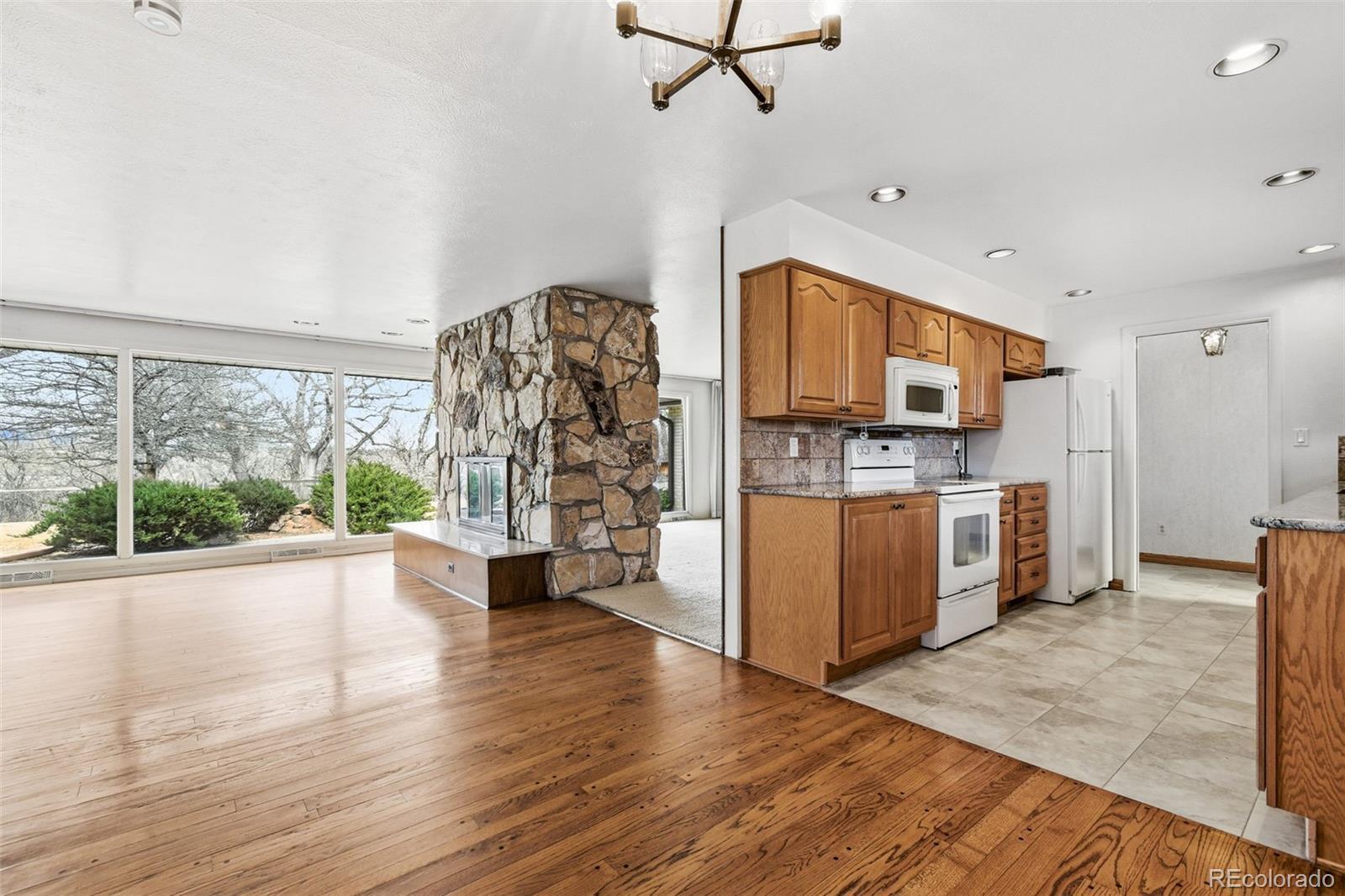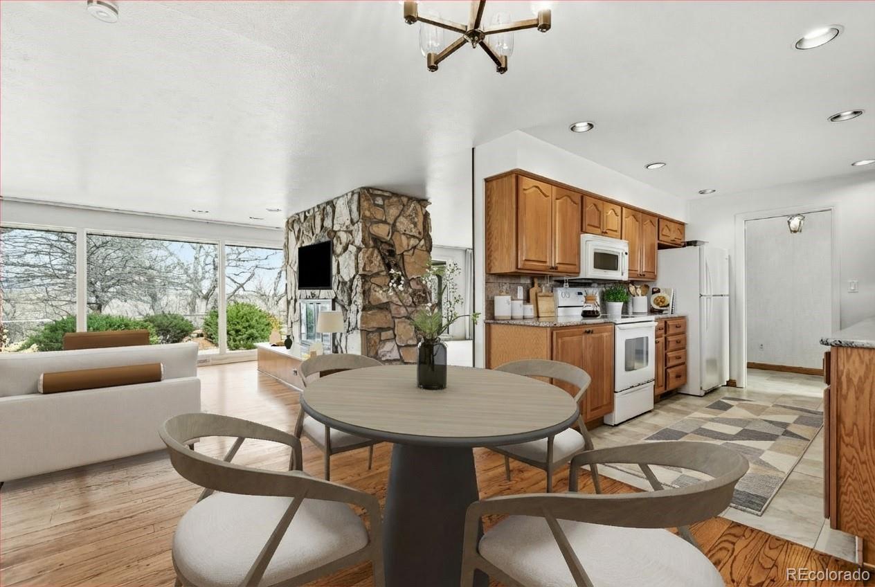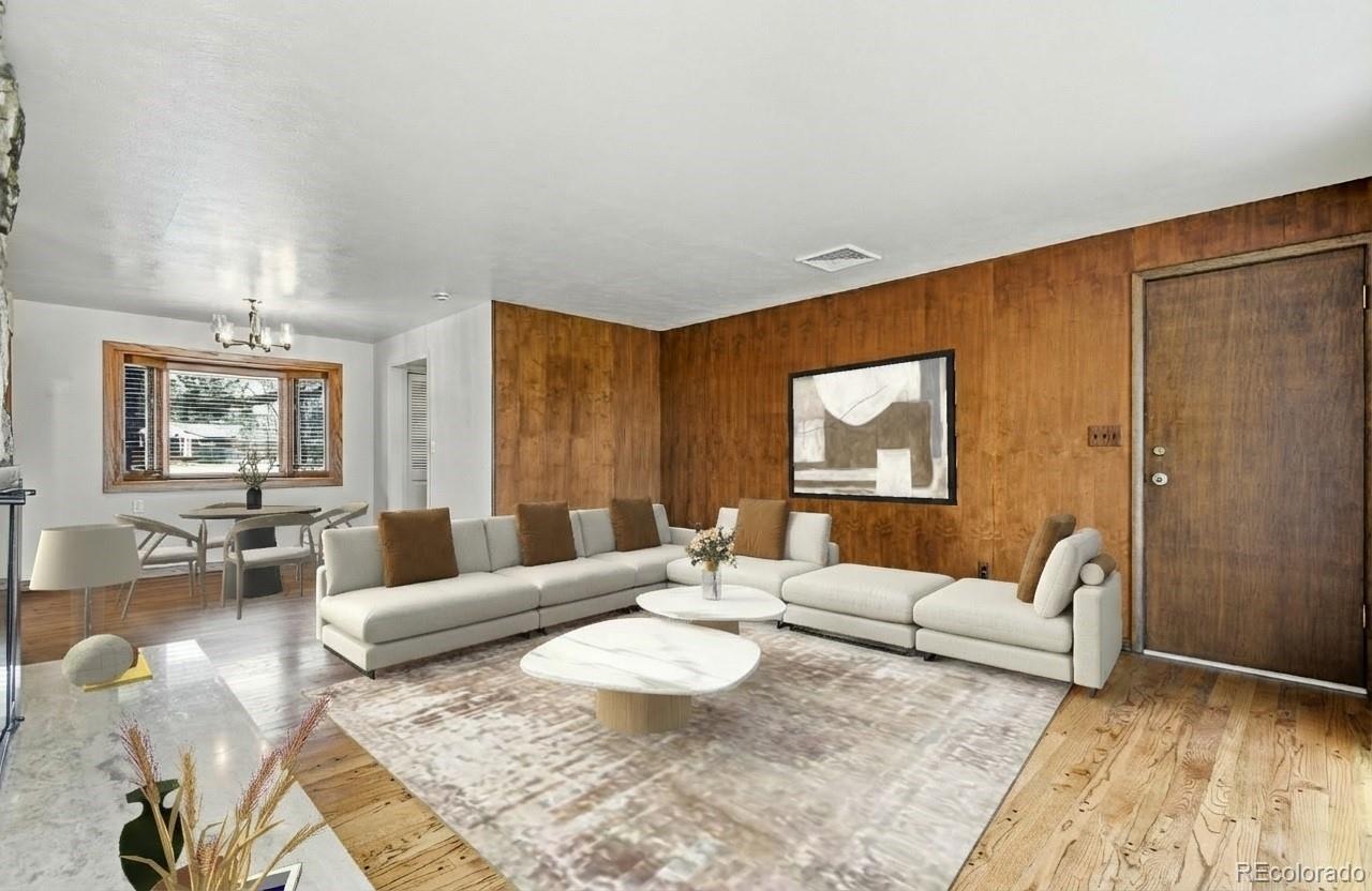 Welcome to this classic mid-century ranch on a private dead-end street in the coveted Applewood community. Set behind mature landscaping, the home greets you with an entry foyer and original custom wood-paneled divider that leads into the living area with original hardwood floors, mahogany-paneled walls, and a striking stone fireplace. The back of the home features floor-to-ceiling windows framing open-space, mountain, and lake views and fills the family room with tranquil vistas. The fully remodeled kitchen offers granite counters and updated appliances. Down the bedroom corridor you’ll find an original full bath and a bright secondary bedroom ideal for guests or a home office. The owner’s retreat includes custom paneled walls, two walk-in closets, a bay window, and direct access to the backyard. Outside, enjoy 300+ days of sunshine in a spacious, private yard with mature trees, established plantings, and a generous patio—perfect for entertaining. Upgraded electric service and custom wood-clad windows blend modern convenience with authentic mid-century character. A rare offering for buyers seeking original details with thoughtful updates.