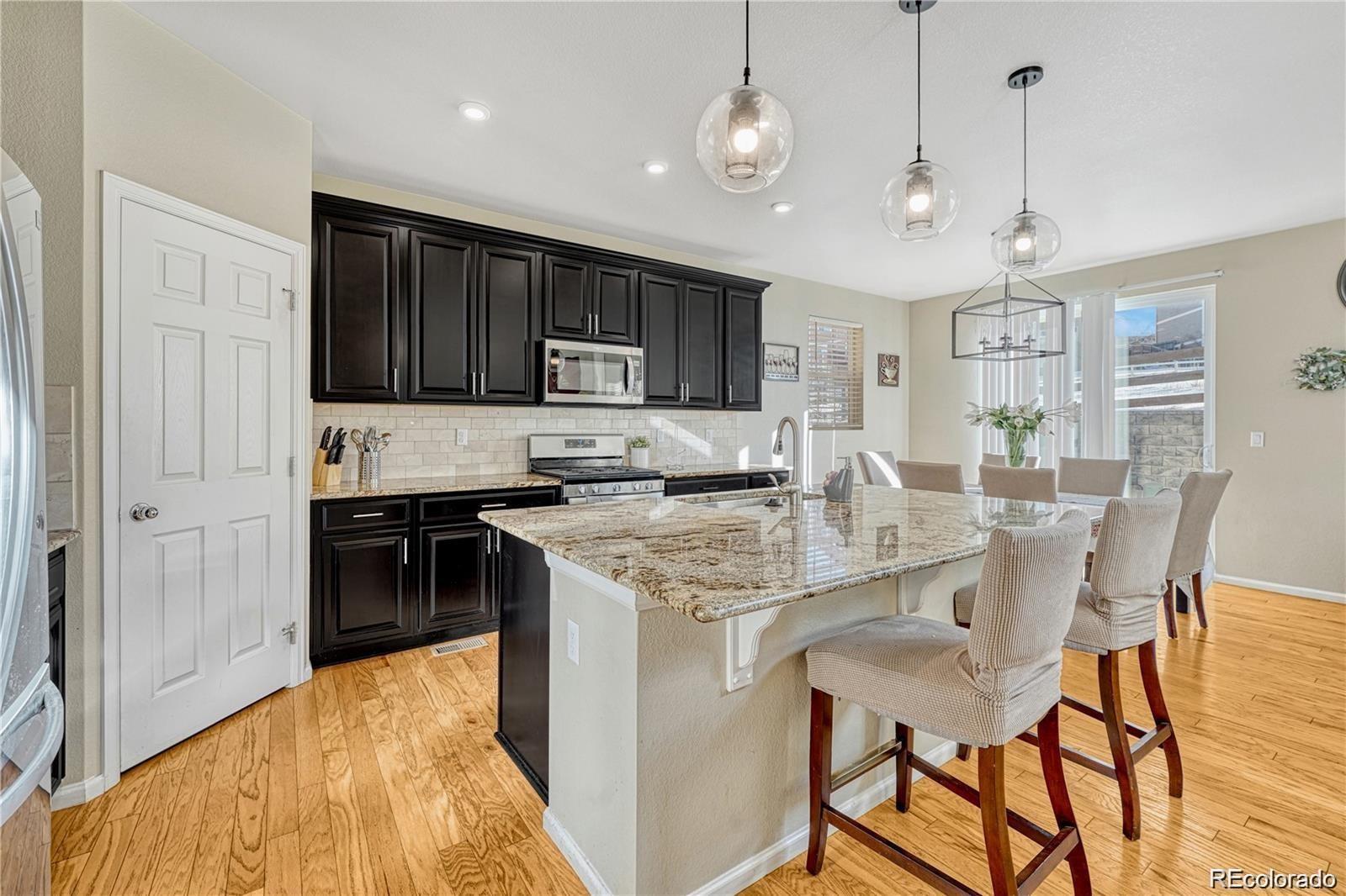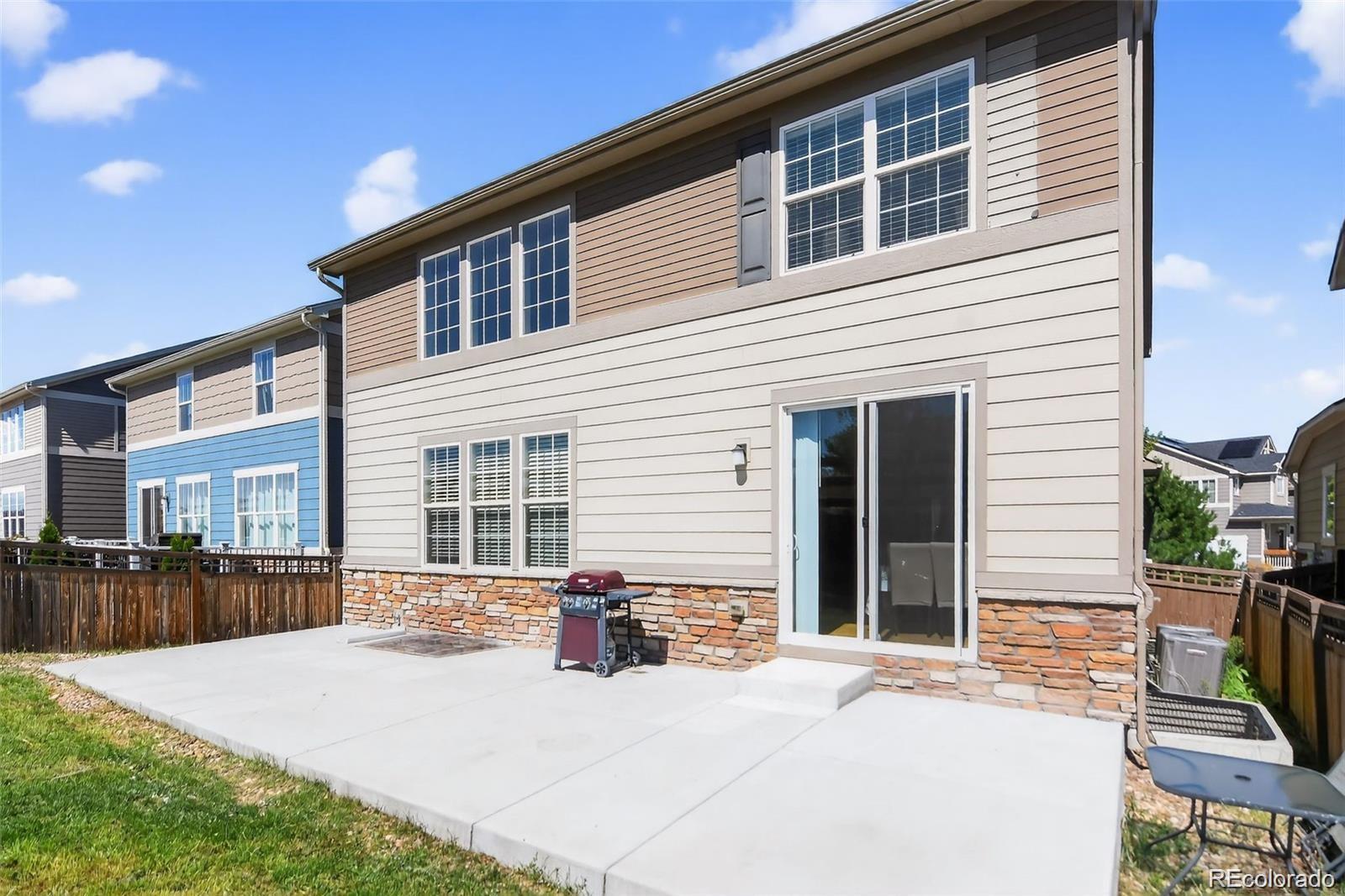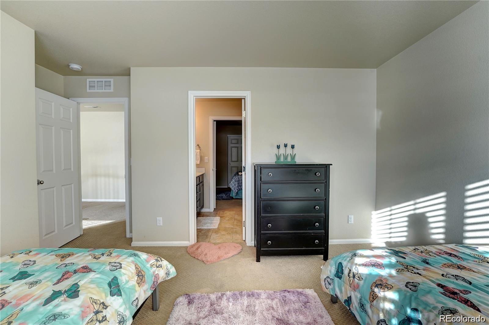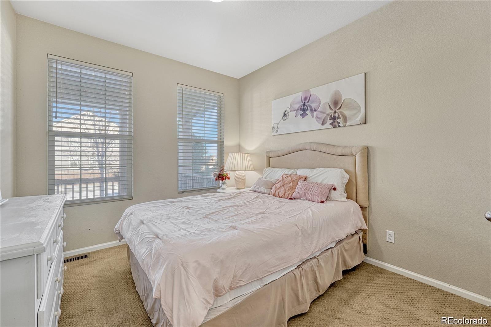 Nestled in a serene cul-de-sac and backing to a peaceful Greenbelt, this beautifully maintained 4-bedroom, 3-bathroom home offers the perfect blend of modern comfort and private outdoor living. The main level features soaring vaulted ceilings and a harmonious mix of hardwood floors and plush carpet throughout. The spacious, eat-in kitchen is a chef's dream with granite countertops, stainless-steel appliances, a large center island, and a generous walk-in pantry. The kitchen seamlessly flows into the living area, with a sliding door that opens to a private backyard ideal for indoor/outdoor entertaining. The main floor also includes a guest bedroom and a full bath, offering comfort and convenience for visitors. Upstairs, you'll find three spacious bedrooms, including a luxurious primary suite with a private ensuite bathroom complete with dual vanities, a walk-in closet, and a large soaking tub—perfect for relaxation. Two of the secondary bedrooms are connected by a convenient Jack-and-Jill bathroom, making this layout ideal for families. This home is just minutes away from top-rated Cherry Creek Schools, E-470, and the popular Park Meadows Mall, providing easy access to shopping, dining, and outdoor recreation. Don't miss the opportunity to make this tranquil retreat your own!