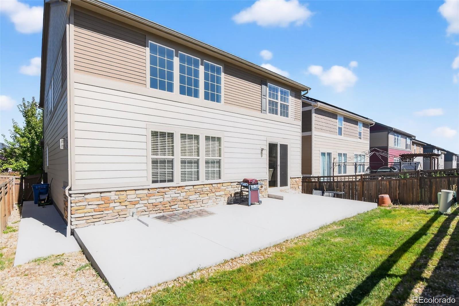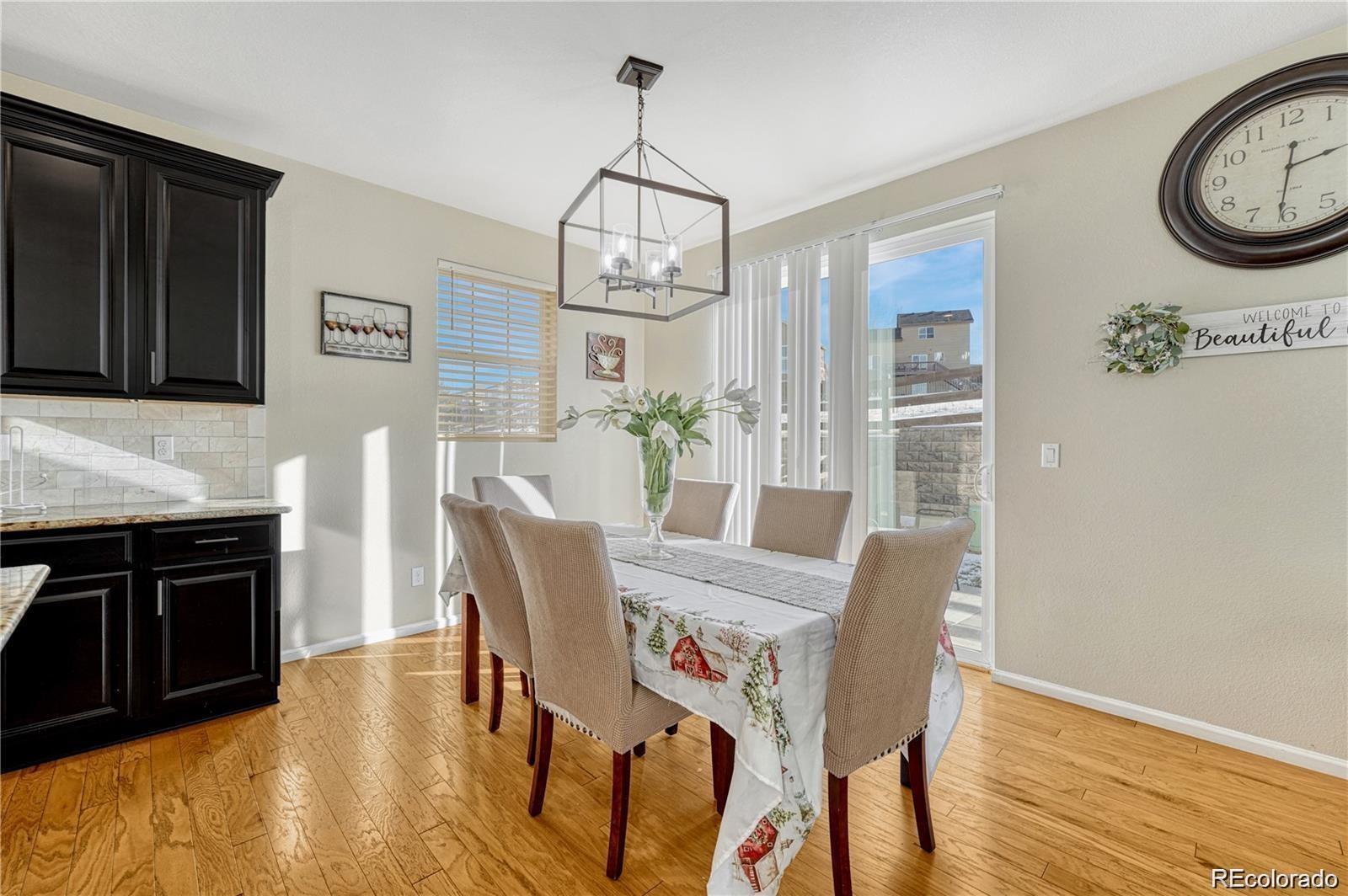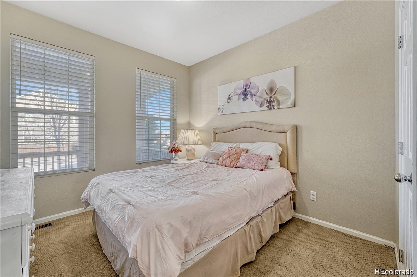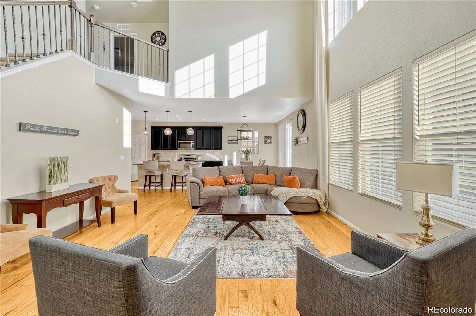 Nestled in a serene cul-de-sac and backing to a peaceful Greenbelt, this beautifully maintained 4-bedroom, 3-bathroom home offers the perfect blend of modern comfort and private outdoor living. The main level features soaring vaulted ceilings and a harmonious mix of hardwood floors and plush carpet throughout. The spacious, eat-in kitchen is a chef's dream with granite countertops, stainless-steel appliances, a large center island, and a generous walk-in pantry. The kitchen seamlessly flows into the living area, with a sliding door that opens to a private backyard ideal for indoor/outdoor entertaining. The main floor also includes a guest bedroom and a full bath, offering comfort and convenience for visitors. Upstairs, you'll find three spacious bedrooms, including a luxurious primary suite with a private ensuite bathroom complete with dual vanities, a walk-in closet, and a large soaking tub—perfect for relaxation. Two of the secondary bedrooms are connected by a convenient Jack-and-Jill bathroom, making this layout ideal for families. This home is just minutes away from top-rated Cherry Creek Schools, E-470, and the popular Park Meadows Mall, providing easy access to shopping, dining, and outdoor recreation. Don't miss the opportunity to make this tranquil retreat your own!