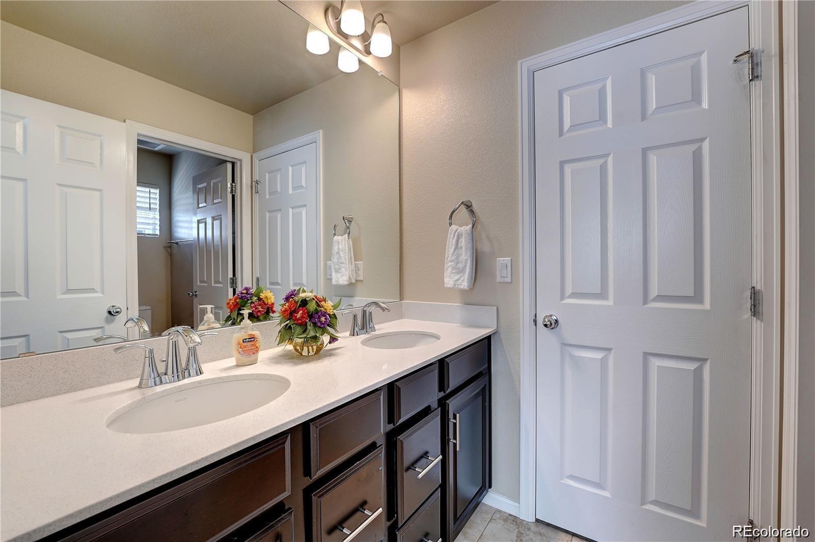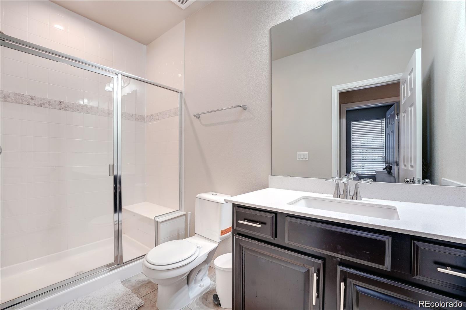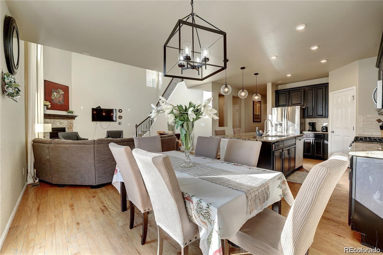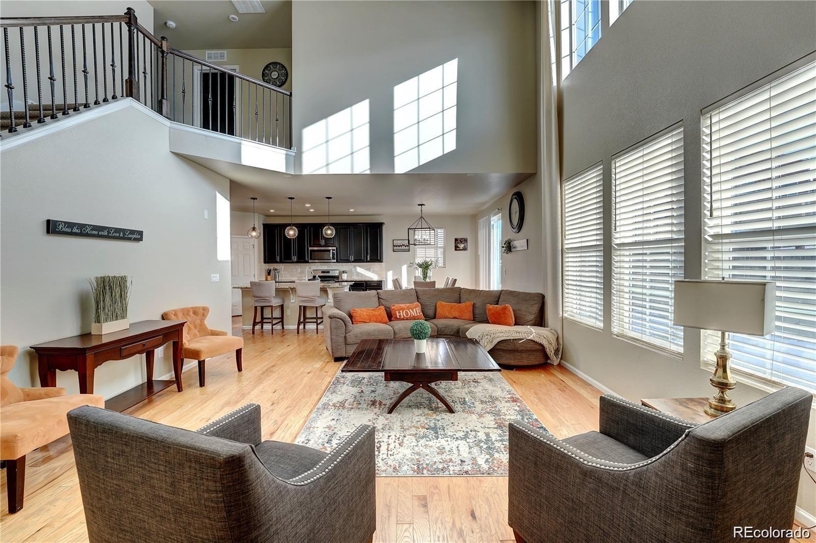 Nestled in a serene cul-de-sac and backing to a peaceful Greenbelt, this beautifully maintained 4-bedroom, 3-bathroom home offers the perfect blend of modern comfort and private outdoor living. The main level features soaring vaulted ceilings and a harmonious mix of hardwood floors and plush carpet throughout. The spacious, eat-in kitchen is a chef's dream with granite countertops, stainless-steel appliances, a large center island, and a generous walk-in pantry. The kitchen seamlessly flows into the living area, with a sliding door that opens to a private backyard ideal for indoor/outdoor entertaining. The main floor also includes a guest bedroom and a full bath, offering comfort and convenience for visitors. Upstairs, you'll find three spacious bedrooms, including a luxurious primary suite with a private ensuite bathroom complete with dual vanities, a walk-in closet, and a large soaking tub—perfect for relaxation. Two of the secondary bedrooms are connected by a convenient Jack-and-Jill bathroom, making this layout ideal for families. This home is just minutes away from top-rated Cherry Creek Schools, E-470, and the popular Park Meadows Mall, providing easy access to shopping, dining, and outdoor recreation. Don't miss the opportunity to make this tranquil retreat your own!