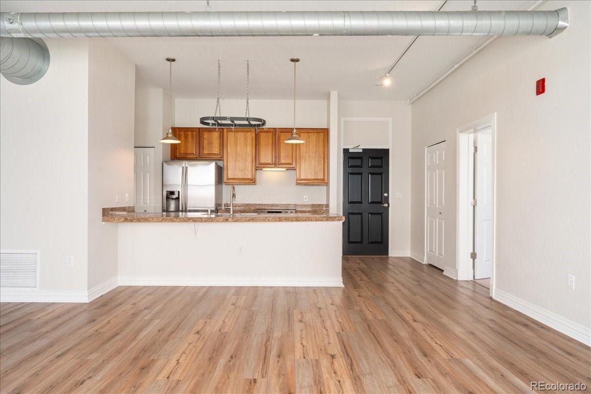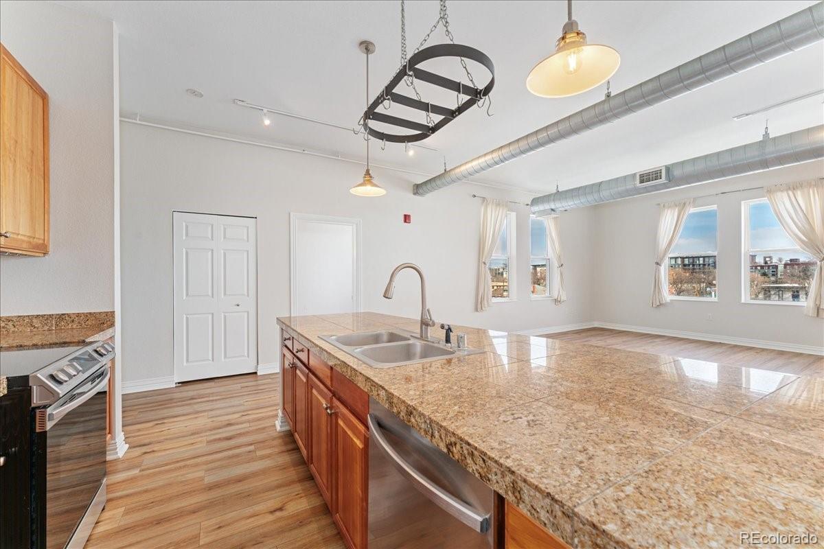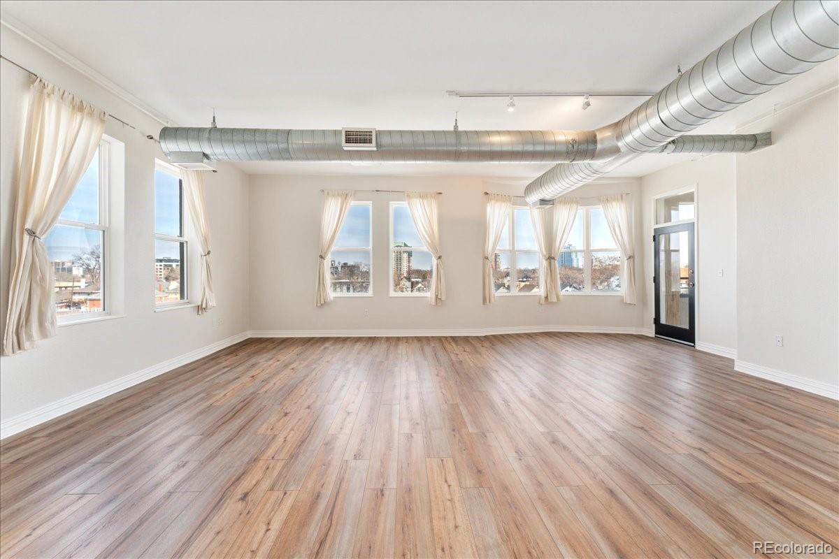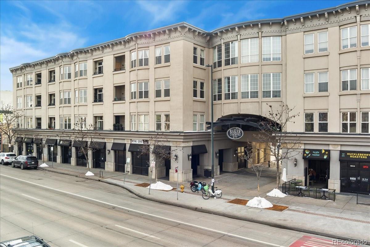Experience the best of Denver with this modern 2-bedroom, 2-bathroom condo in Baker Commons. This industrial design inspired condo features 12 ft high ceilings, new luxury vinyl plank flooring, new tankless water heater, new paint, in unit washer and dryer, and a balcony with magnificent city views. Located on the top floor, this unit boasted the largest floor plan with an open concept living – a perfect space for any home design ideas. Oversized windows in the entire condo floods the space with natural light creating a stunning, airy atmosphere. The kitchen is equipped with stainless steel appliances and granite counter tops. The spacious primary bedroom is a true retreat, offering comfort with its generous layout complete with walk-in closet and en-suite bathroom. Second bedroom is equally spacious with walk-in closet and direct access to second bathroom. Enjoy the convenience of walkable streets, best restaurants, boutique shopping and easy access to public transportation, making it ideal for those who are always on the go. With a perfect blend of comfort and urban excitement, this condo offers the ultimate Denver living.