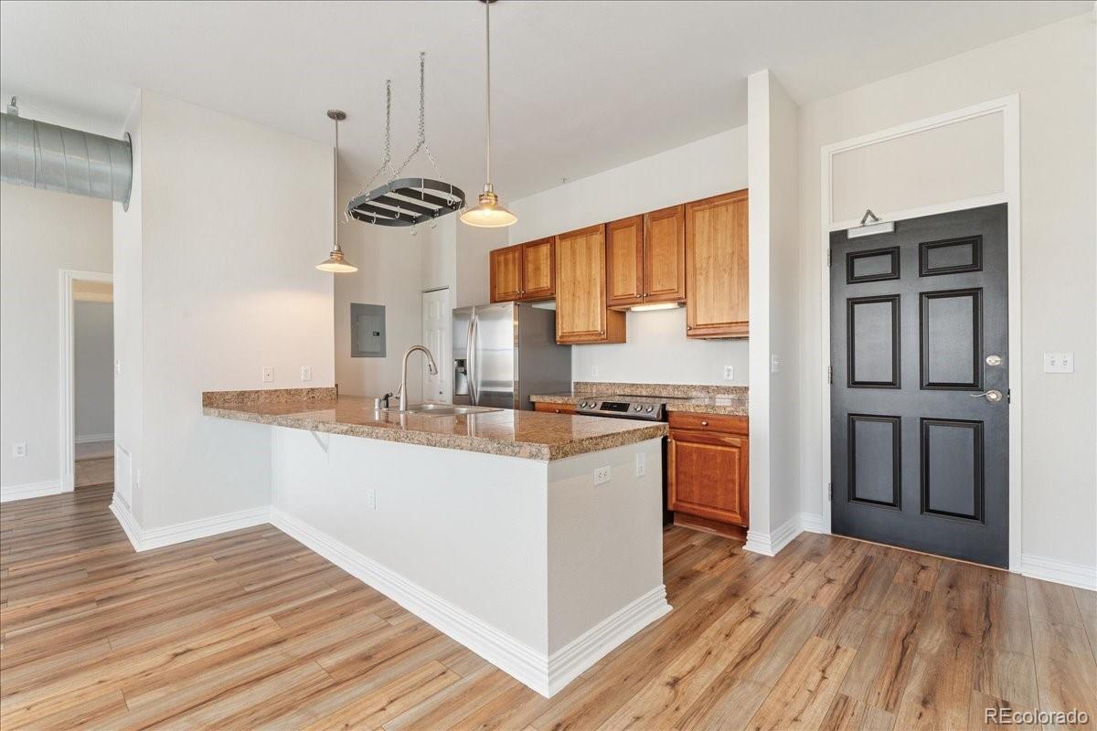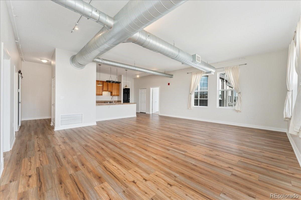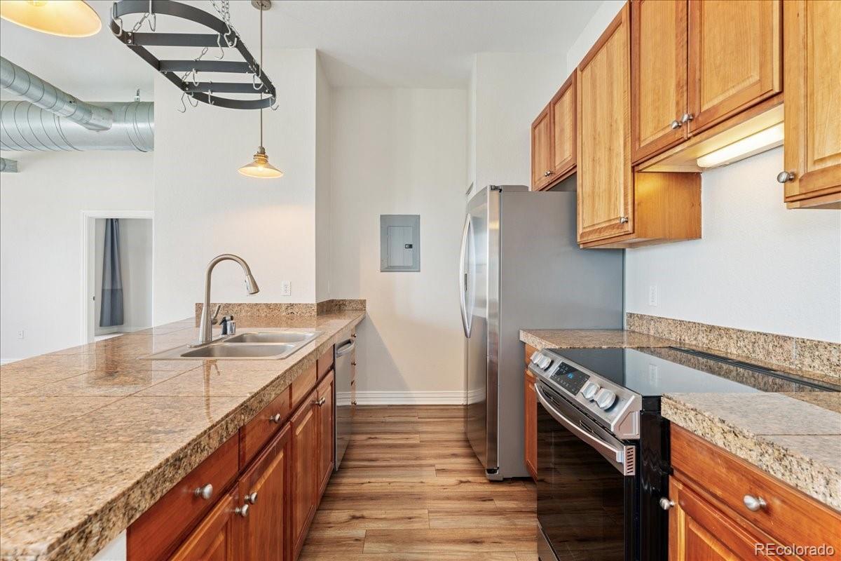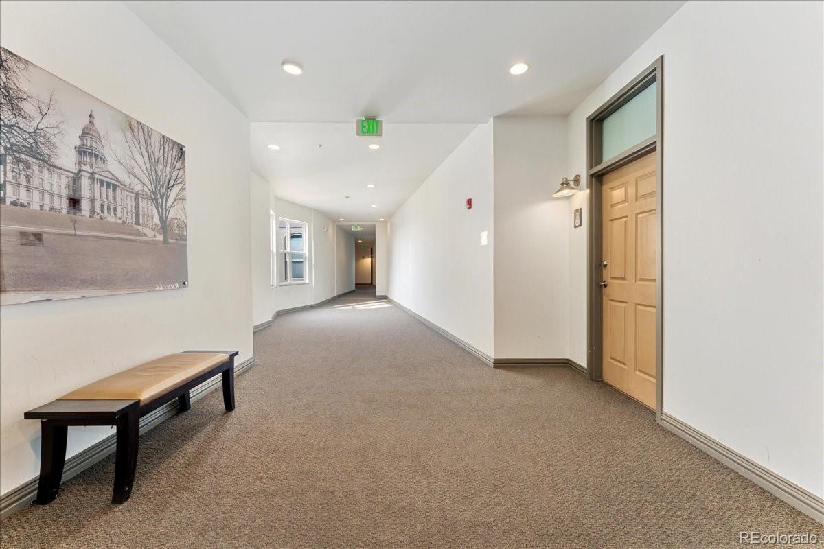 Experience the best of Denver with this modern 2-bedroom, 2-bathroom condo in Baker Commons. This industrial design inspired condo features 12 ft high ceilings, new luxury vinyl plank flooring, new tankless water heater, new paint, in unit washer and dryer, and a balcony with magnificent city views. Located on the top floor, this unit boasted the largest floor plan with an open concept living – a perfect space for any home design ideas. Oversized windows in the entire condo floods the space with natural light creating a stunning, airy atmosphere. The kitchen is equipped with stainless steel appliances and granite counter tops. The spacious primary bedroom is a true retreat, offering comfort with its generous layout complete with walk-in closet and en-suite bathroom. Second bedroom is equally spacious with walk-in closet and direct access to second bathroom. Enjoy the convenience of walkable streets, best restaurants, boutique shopping and easy access to public transportation, making it ideal for those who are always on the go. With a perfect blend of comfort and urban excitement, this condo offers the ultimate Denver living.