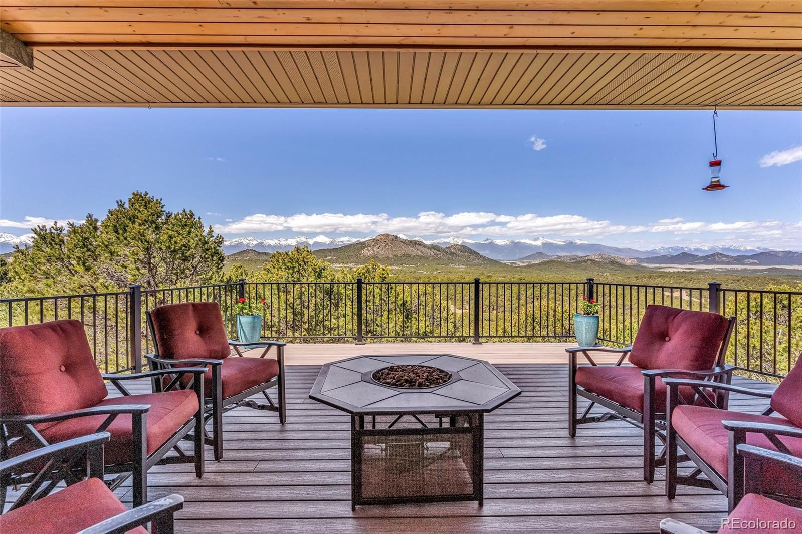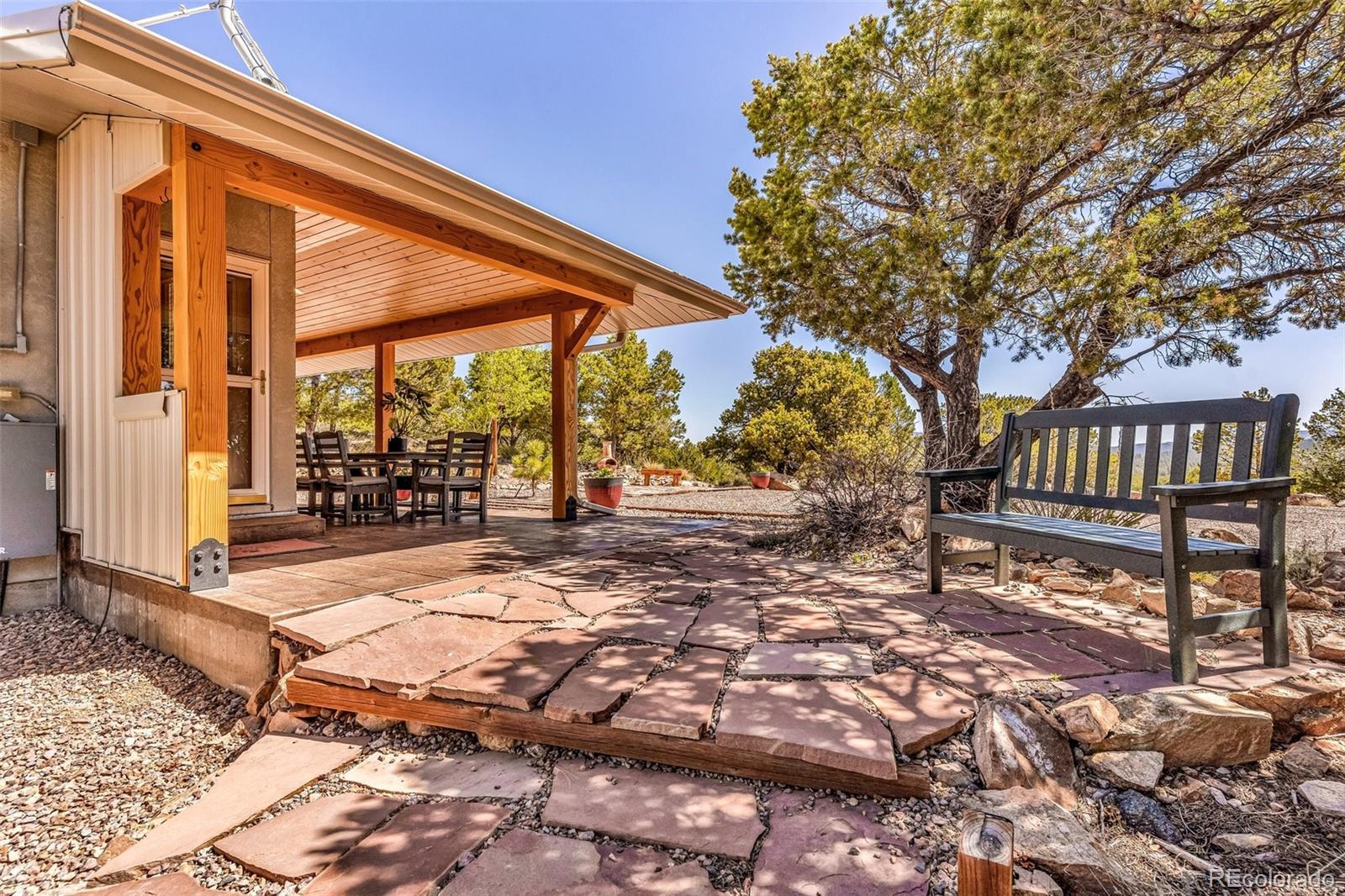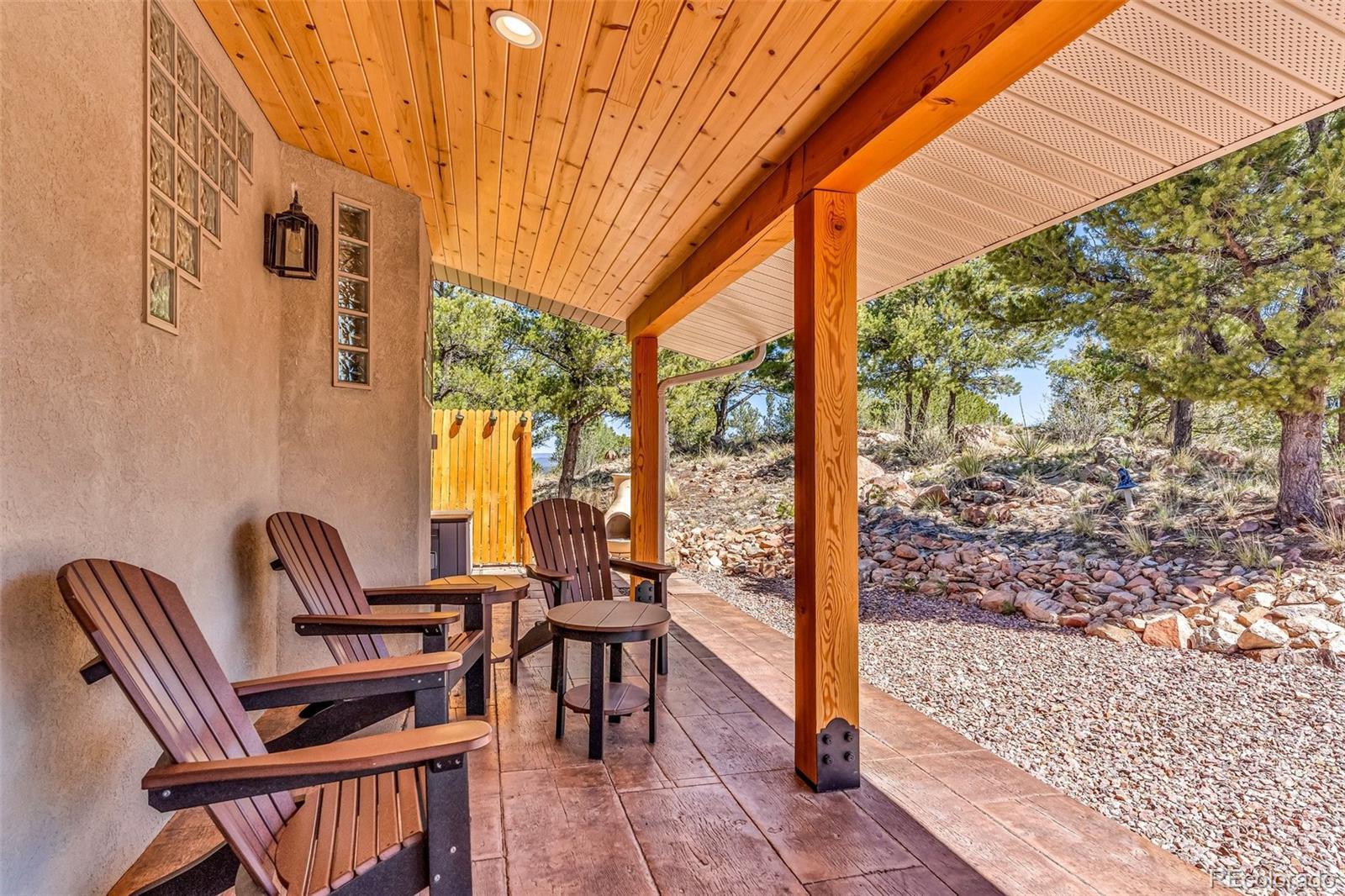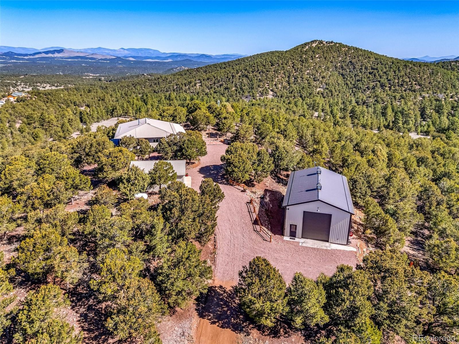 Enter this wooded setting and find a lovely low maintenance acrylic stucco custom home with panoramic Sangre mountain views. The lovely mahogany front door invites you into this meticulous home that is wired for sound, Internet and has a power antenna cell phone system. The main level has Aspen wood ceilings in the great room, family room, and master bedroom. The light and cheery kitchen has an abundance of storage space in the hickory cabinets. The in-floor hot water heating system has 6 zones for your comfort. The master suite includes an elegant bathroom with an over-sized shower, large whirlpool tub, and two sinks. Walkout level has 2 bedrooms or office, a full bath, and recreation room. The walkout patio is ready for your hot tub. Many low maintenance features including a 270+ sq ft synthetic deck and powder coated metal railing and rock yard and terracing. Metal soffits and metal roof. Motorized 16X13 deck awning. Unattached observation/picnic area on the dramatic bluff. Seller is also selling adjacent lot https://www.haydenoutdoors.com/land-for-sale/riggs-mesa/