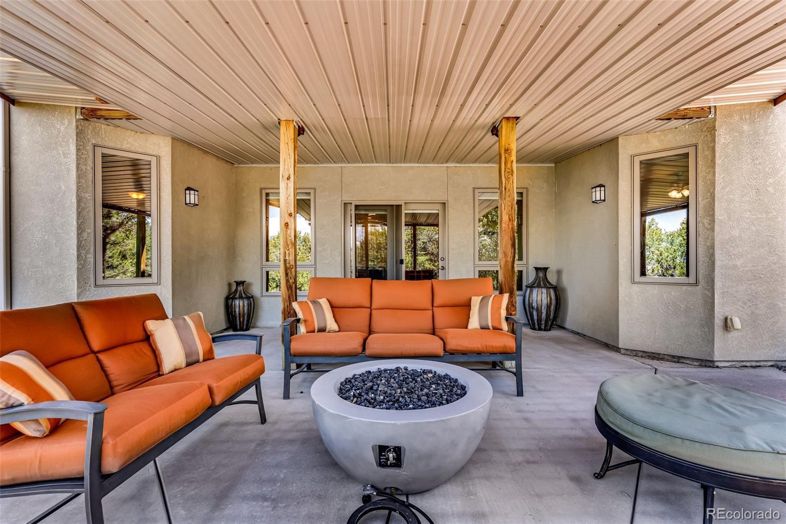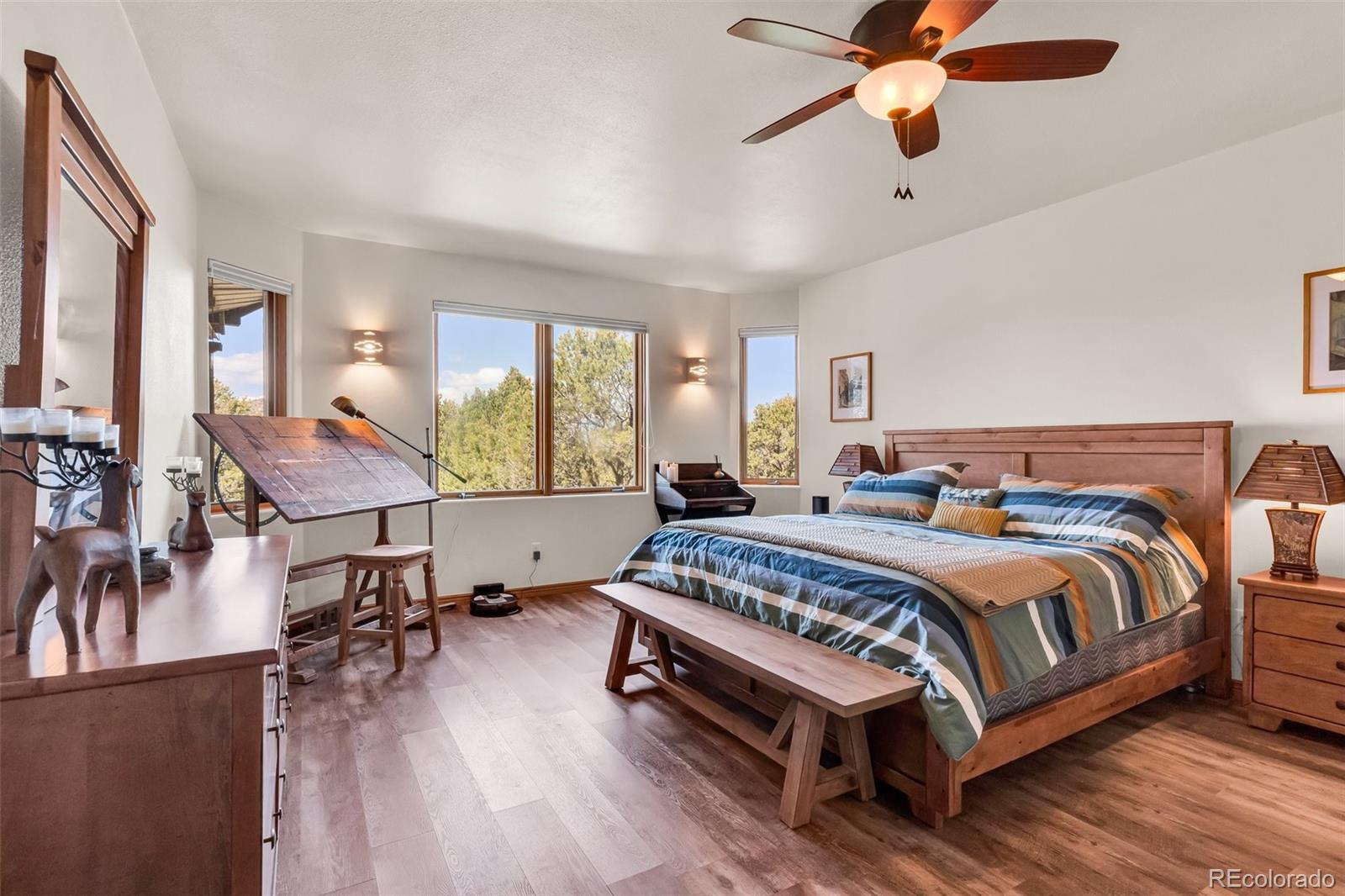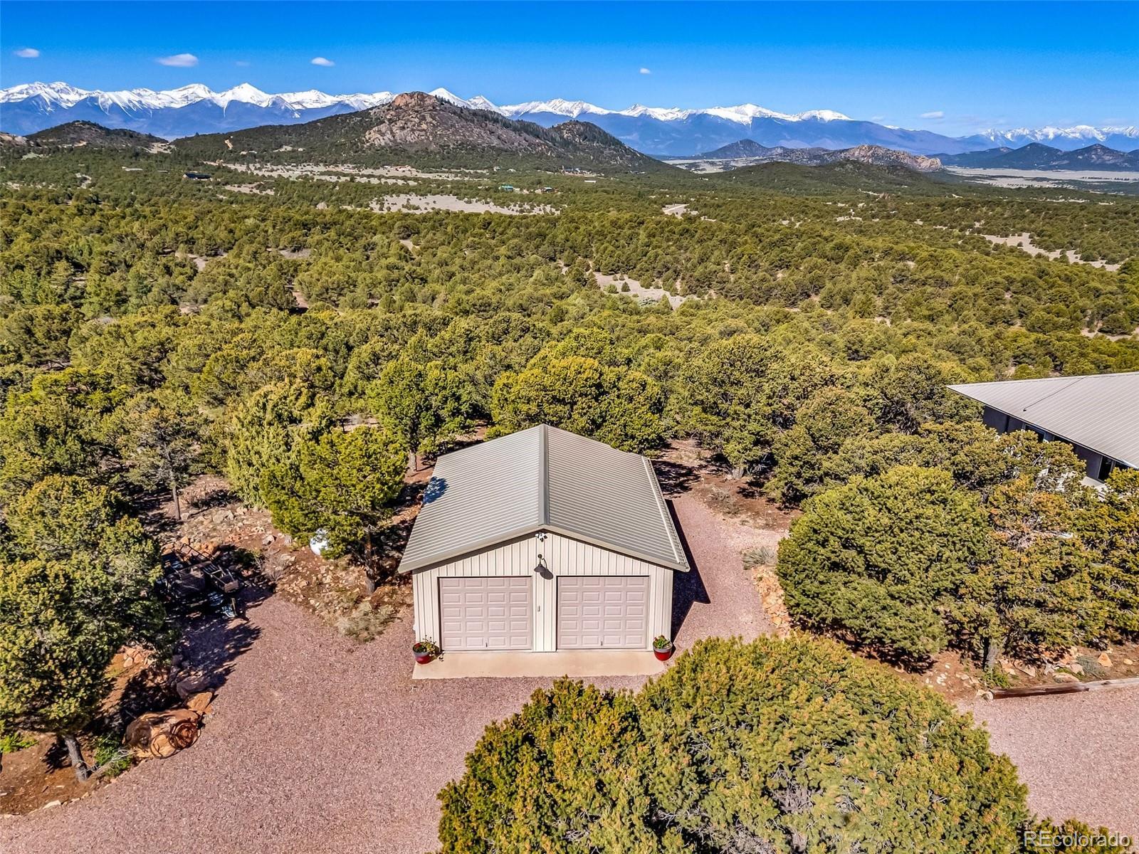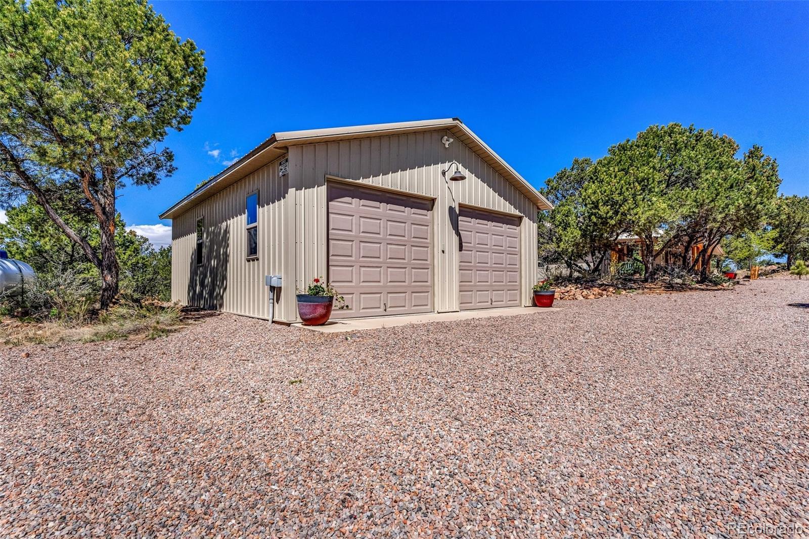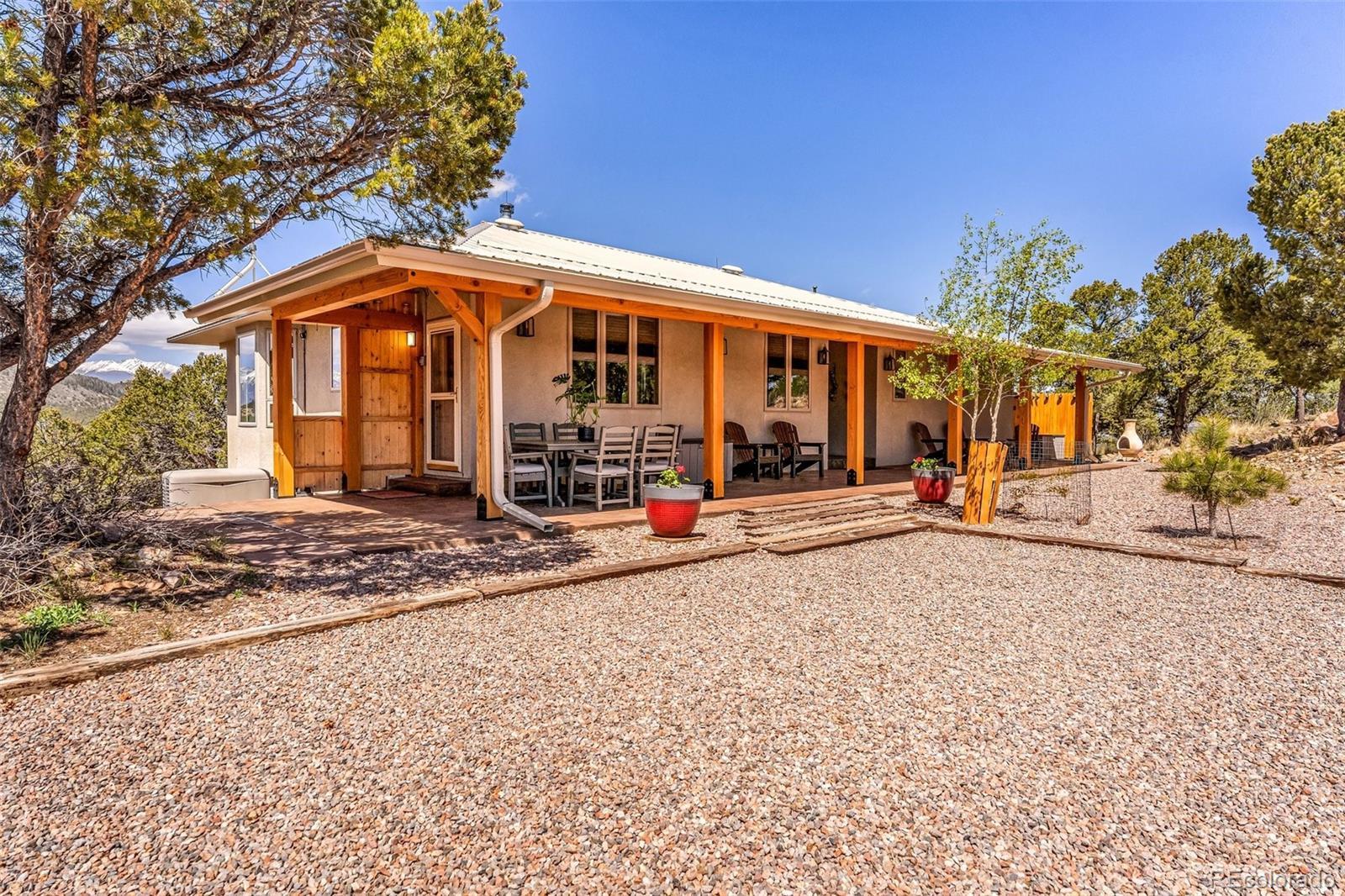 Enter this wooded setting and find a lovely low maintenance acrylic stucco custom home with panoramic Sangre mountain views. The lovely mahogany front door invites you into this meticulous home that is wired for sound, Internet and has a power antenna cell phone system. The main level has Aspen wood ceilings in the great room, family room, and master bedroom. The light and cheery kitchen has an abundance of storage space in the hickory cabinets. The in-floor hot water heating system has 6 zones for your comfort. The master suite includes an elegant bathroom with an over-sized shower, large whirlpool tub, and two sinks. Walkout level has 2 bedrooms or office, a full bath, and recreation room. The walkout patio is ready for your hot tub. Many low maintenance features including a 270+ sq ft synthetic deck and powder coated metal railing and rock yard and terracing. Metal soffits and metal roof. Motorized 16X13 deck awning. Unattached observation/picnic area on the dramatic bluff. Seller is also selling adjacent lot https://www.haydenoutdoors.com/land-for-sale/riggs-mesa/