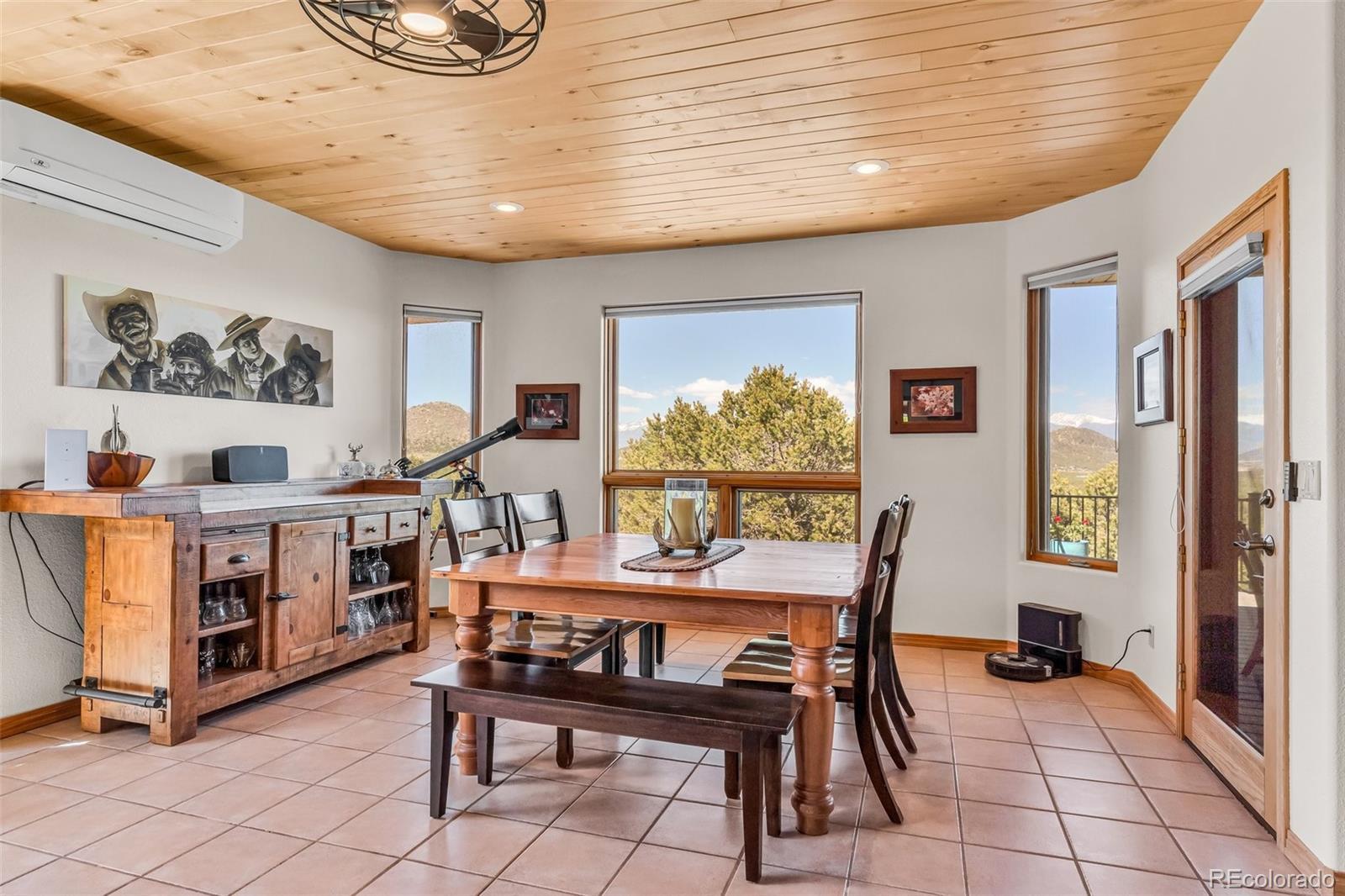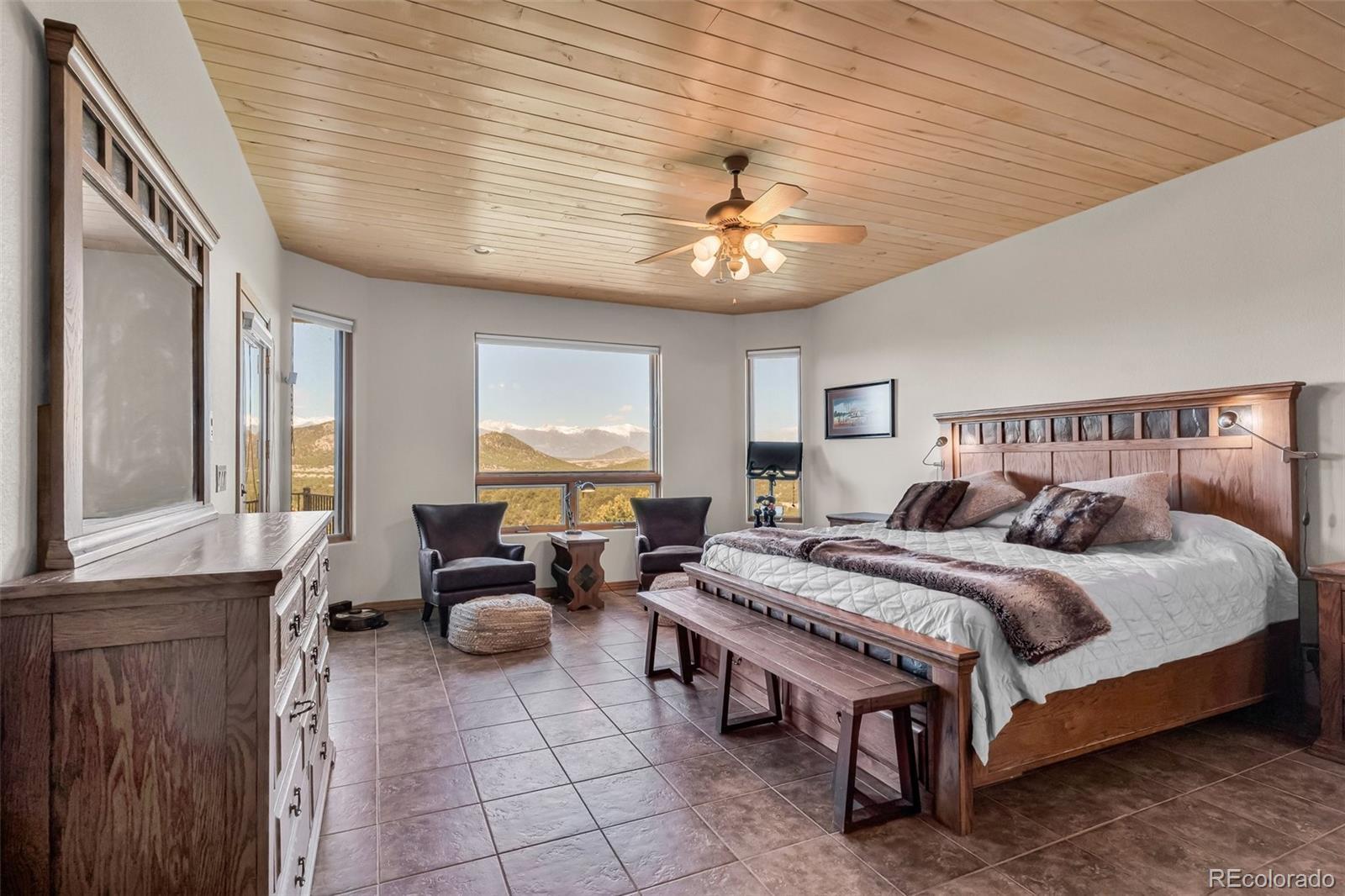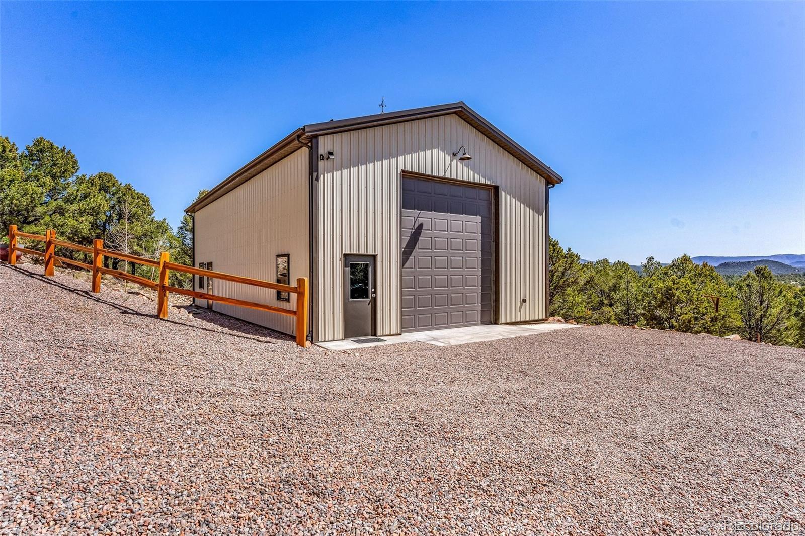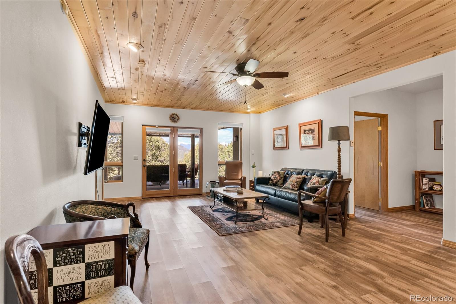 Enter this wooded setting and find a lovely low maintenance acrylic stucco custom home with panoramic Sangre mountain views. The lovely mahogany front door invites you into this meticulous home that is wired for sound, Internet and has a power antenna cell phone system. The main level has Aspen wood ceilings in the great room, family room, and master bedroom. The light and cheery kitchen has an abundance of storage space in the hickory cabinets. The in-floor hot water heating system has 6 zones for your comfort. The master suite includes an elegant bathroom with an over-sized shower, large whirlpool tub, and two sinks. Walkout level has 2 bedrooms or office, a full bath, and recreation room. The walkout patio is ready for your hot tub. Many low maintenance features including a 270+ sq ft synthetic deck and powder coated metal railing and rock yard and terracing. Metal soffits and metal roof. Motorized 16X13 deck awning. Unattached observation/picnic area on the dramatic bluff. Seller is also selling adjacent lot https://www.haydenoutdoors.com/land-for-sale/riggs-mesa/