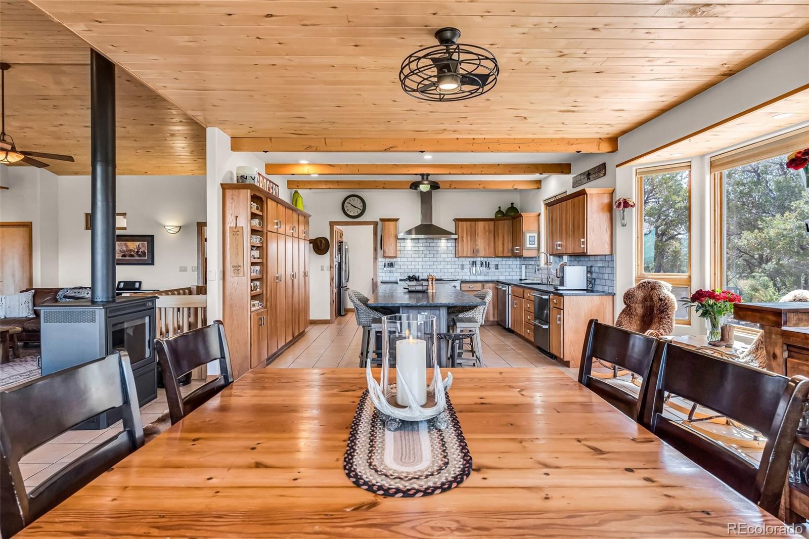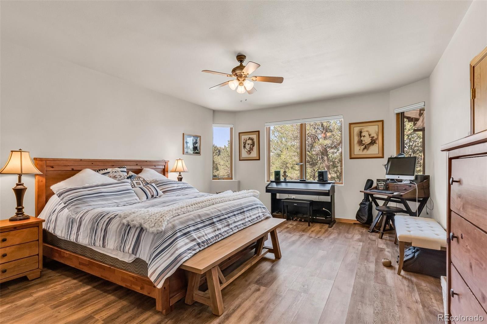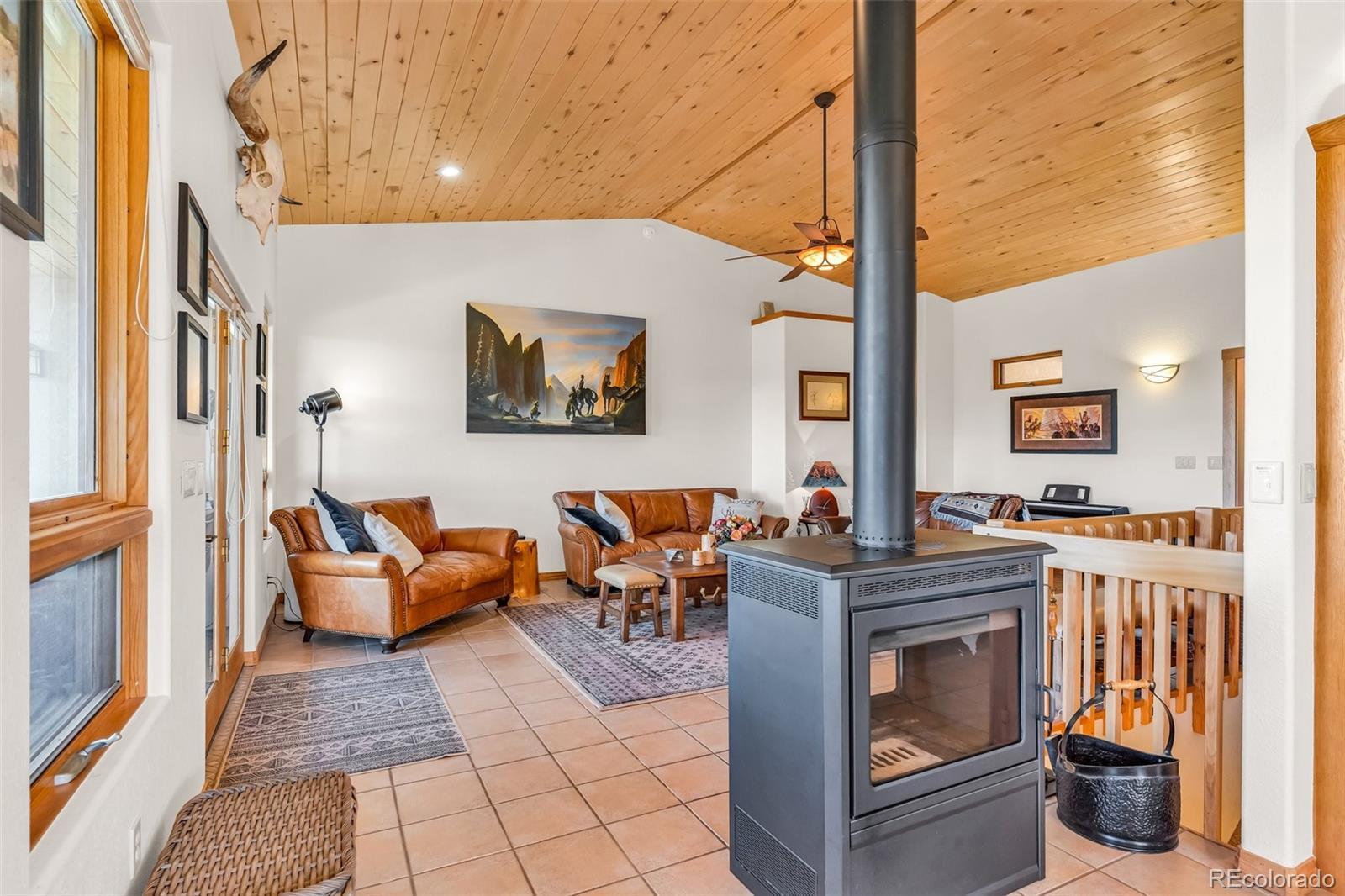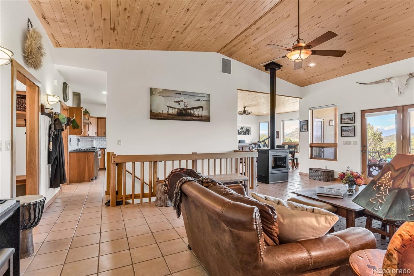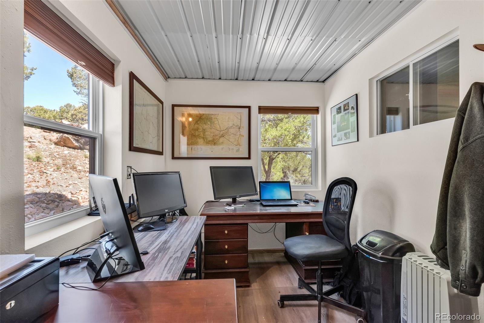 Enter this wooded setting and find a lovely low maintenance acrylic stucco custom home with panoramic Sangre mountain views. The lovely mahogany front door invites you into this meticulous home that is wired for sound, Internet and has a power antenna cell phone system. The main level has Aspen wood ceilings in the great room, family room, and master bedroom. The light and cheery kitchen has an abundance of storage space in the hickory cabinets. The in-floor hot water heating system has 6 zones for your comfort. The master suite includes an elegant bathroom with an over-sized shower, large whirlpool tub, and two sinks. Walkout level has 2 bedrooms or office, a full bath, and recreation room. The walkout patio is ready for your hot tub. Many low maintenance features including a 270+ sq ft synthetic deck and powder coated metal railing and rock yard and terracing. Metal soffits and metal roof. Motorized 16X13 deck awning. Unattached observation/picnic area on the dramatic bluff. Seller is also selling adjacent lot https://www.haydenoutdoors.com/land-for-sale/riggs-mesa/