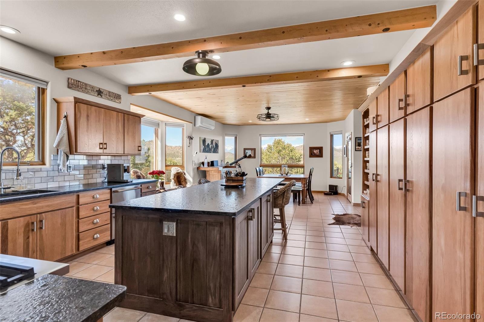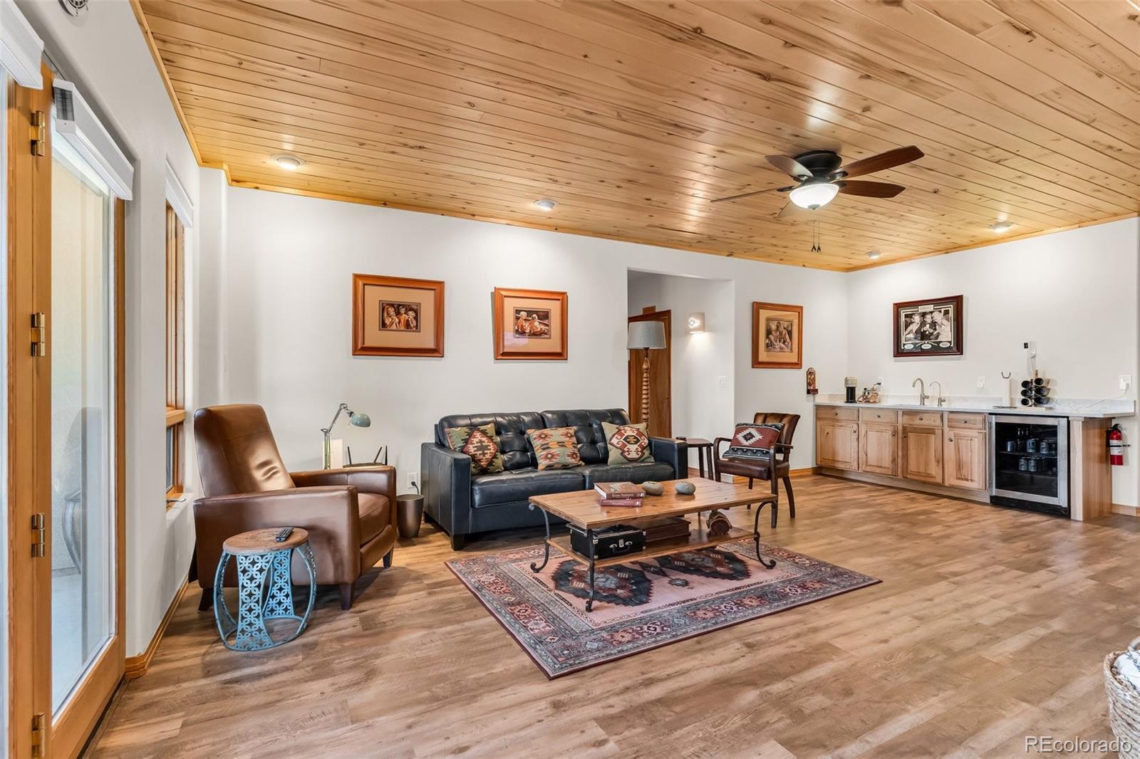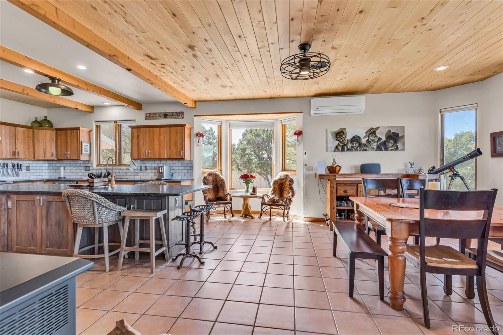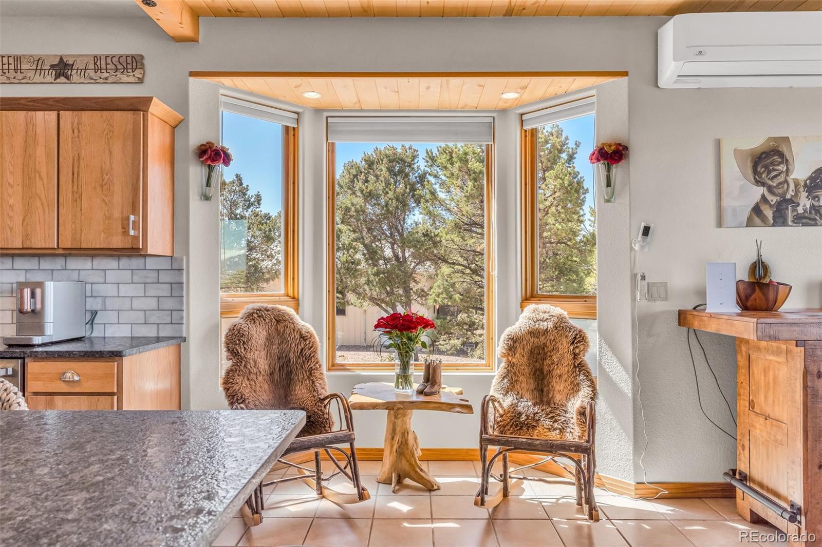 Enter this wooded setting and find a lovely low maintenance acrylic stucco custom home with panoramic Sangre mountain views. The lovely mahogany front door invites you into this meticulous home that is wired for sound, Internet and has a power antenna cell phone system. The main level has Aspen wood ceilings in the great room, family room, and master bedroom. The light and cheery kitchen has an abundance of storage space in the hickory cabinets. The in-floor hot water heating system has 6 zones for your comfort. The master suite includes an elegant bathroom with an over-sized shower, large whirlpool tub, and two sinks. Walkout level has 2 bedrooms or office, a full bath, and recreation room. The walkout patio is ready for your hot tub. Many low maintenance features including a 270+ sq ft synthetic deck and powder coated metal railing and rock yard and terracing. Metal soffits and metal roof. Motorized 16X13 deck awning. Unattached observation/picnic area on the dramatic bluff. Seller is also selling adjacent lot https://www.haydenoutdoors.com/land-for-sale/riggs-mesa/