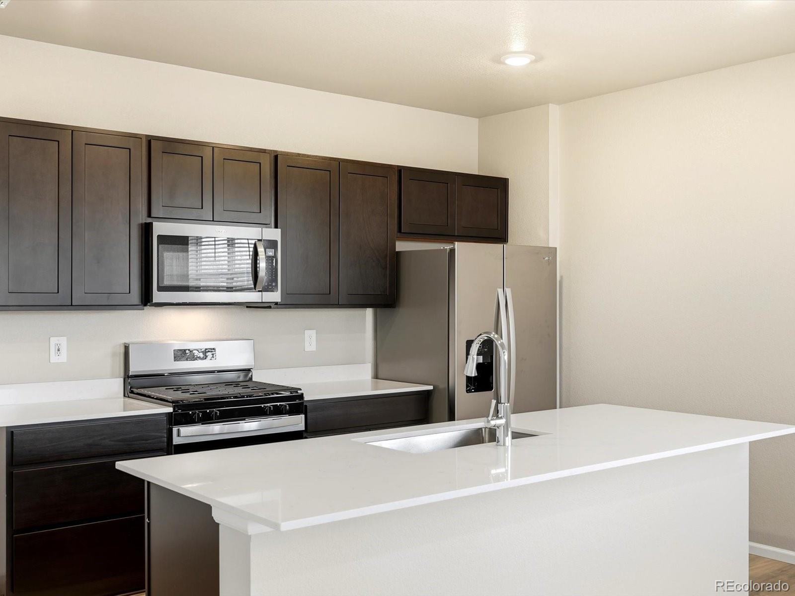 Open concept kitchen with quartz countertops and espresso cabinets! The Woodland is a stylish end-unit townhome featuring an open-concept main floor and a welcoming covered front porch. Upstairs offers a private primary suite with walk-in closet, plus two additional bedrooms and a versatile landing space. With 2.5 baths and a two-bay garage, this design blends comfort and functionality. The Meritage Home difference includes spray-foam insulation, advanced air filtration for year-round comfort and healthier air, and durable cementitious siding known for its strength, fire-resistance, and long-lasting performance. A Whirlpool appliance package, and full home blinds are also included for move-in convenience. Welcome home where every detail is built for comfort, efficiency, and LIFE. BUILT. BETTER. Horizon Uptown is a walkable, master-planned community in Aurora featuring parks, a dog park, and tennis courts. Located at I-70 and E-470, it offers quick access to Denver International Airport, downtown Denver, the Fitzsimons Innovation Community, the Denver Tech Center, and major entertainment destinations. *This home qualifies for special incentives through builder preferred lender for a limited time. Terms and conditions apply. See sales counselor for details!