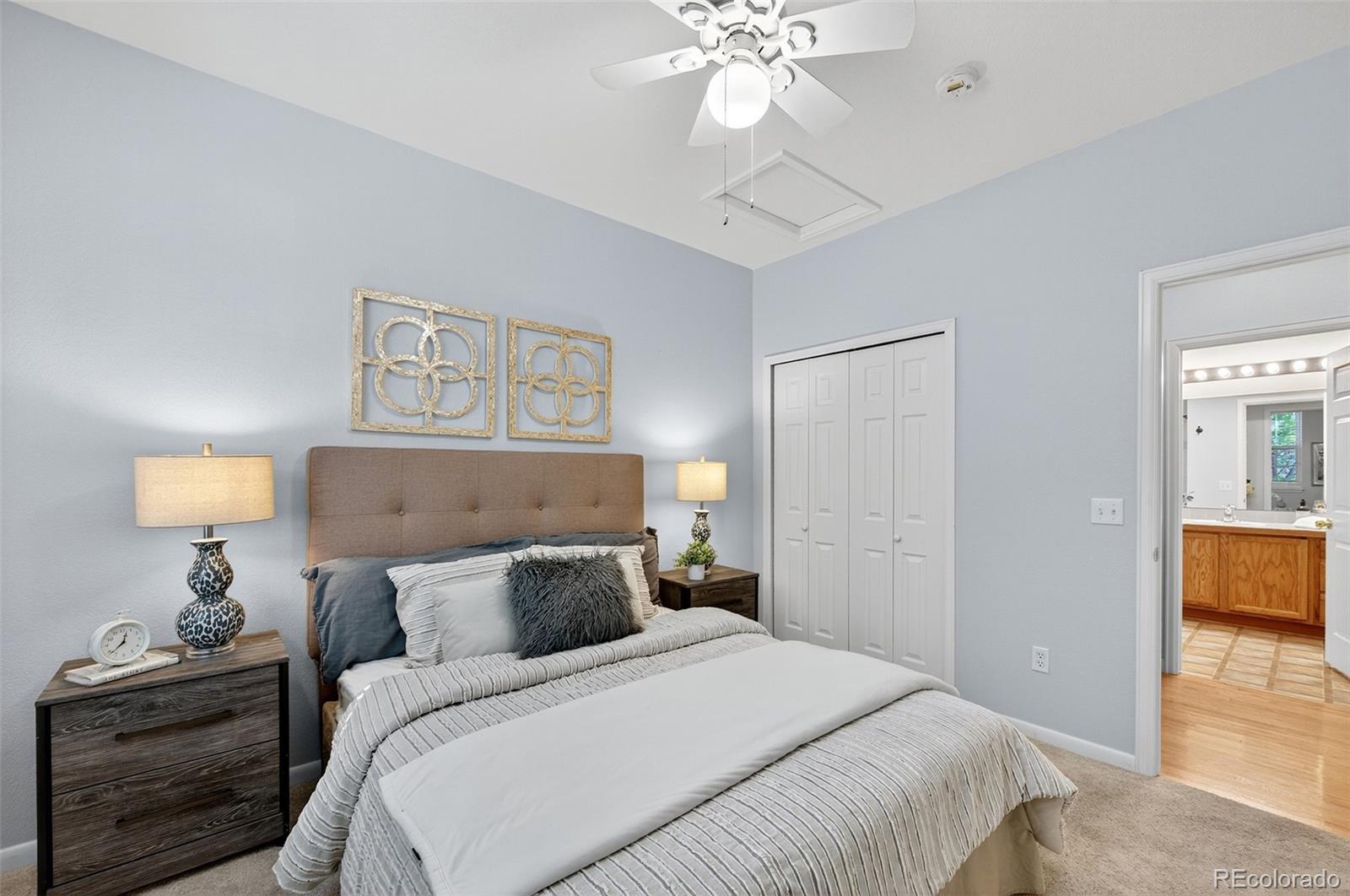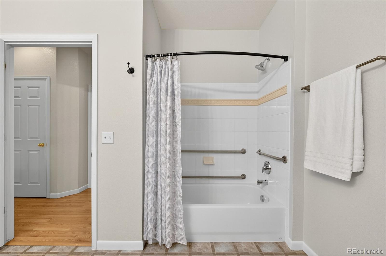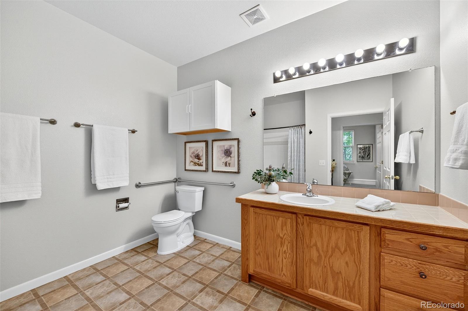 Welcome to this beautifully appointed end-unit RANCH townhome offering a combination of handicapped accessibility and low maintenance living. This home has been well taken care of and is near the Polly A Deane Reservoir. You will love the spacious open floor plan with vaulted ceilings and abundant natural light. The kitchen is open to the charming dining area The private main floor primary suite features a luxurious 5-piece bath with handicapped bars. Another large bedrooms with a full hall bath and handicapped bars is perfect for guests or an office. There is an unfinished basement with a great built-in workbench. A drill press and saw are included as well. The HOA covers exterior maintenance, snow removal, and community amenities including the nearby pool. Just steps to community paths, lake access, regional park trails, and open space. Easy commuting via I-70 and C-470. If you have been waiting for a fabulous low maintenance ranch home- this is the one!