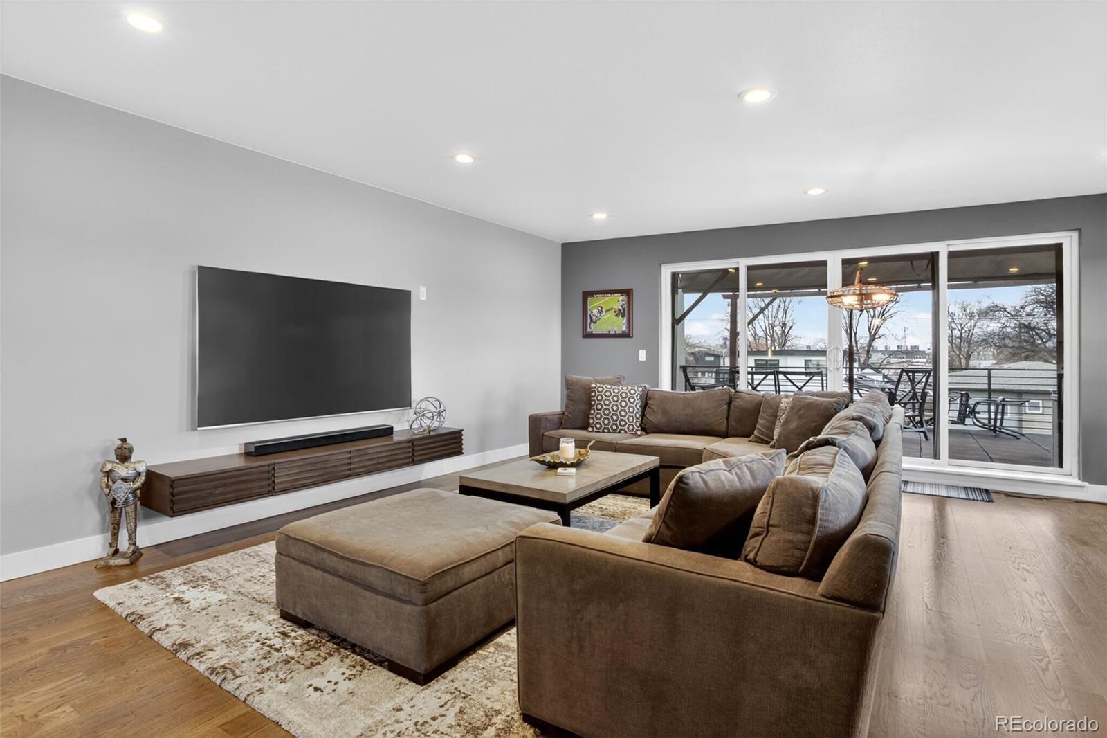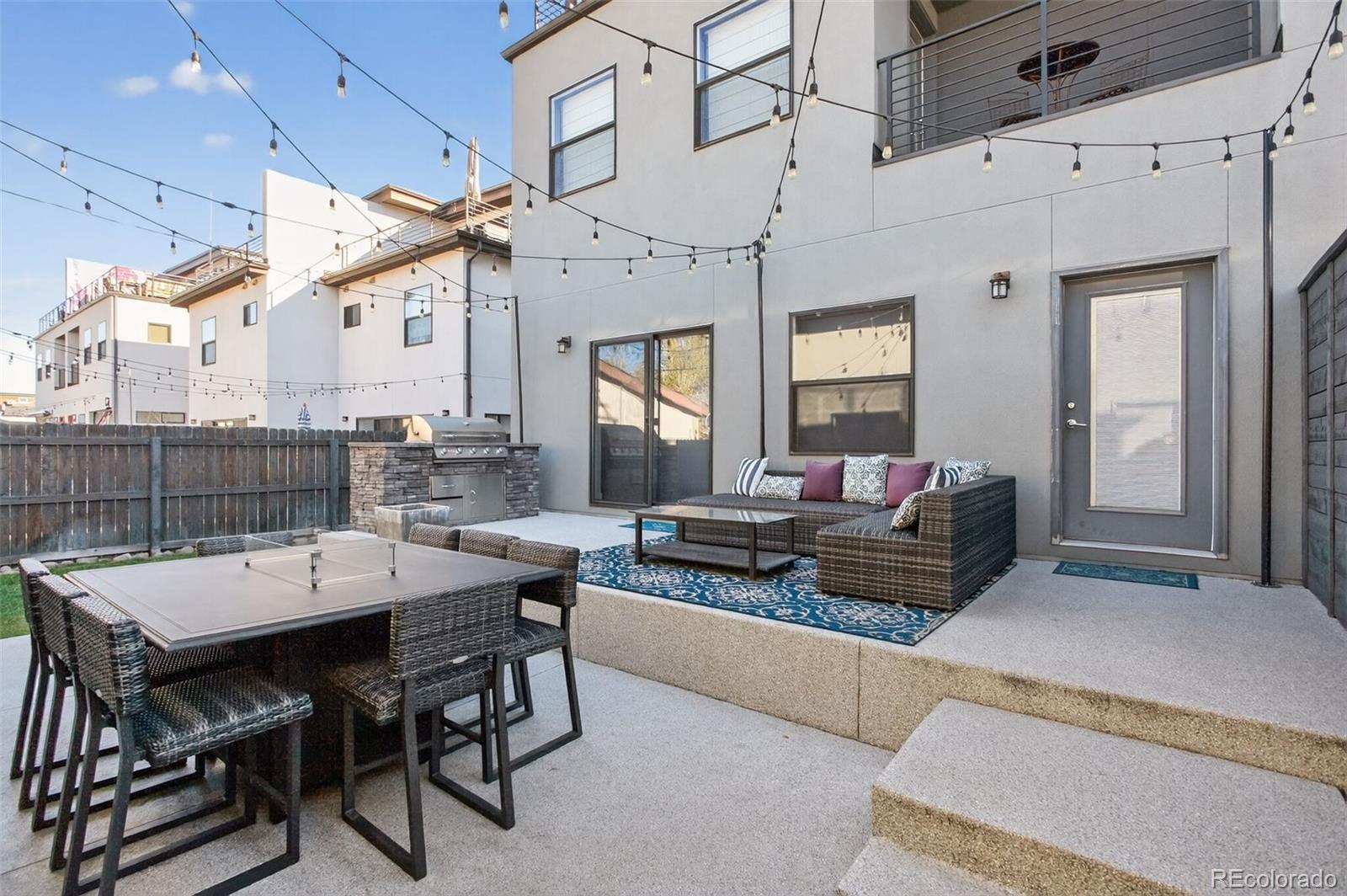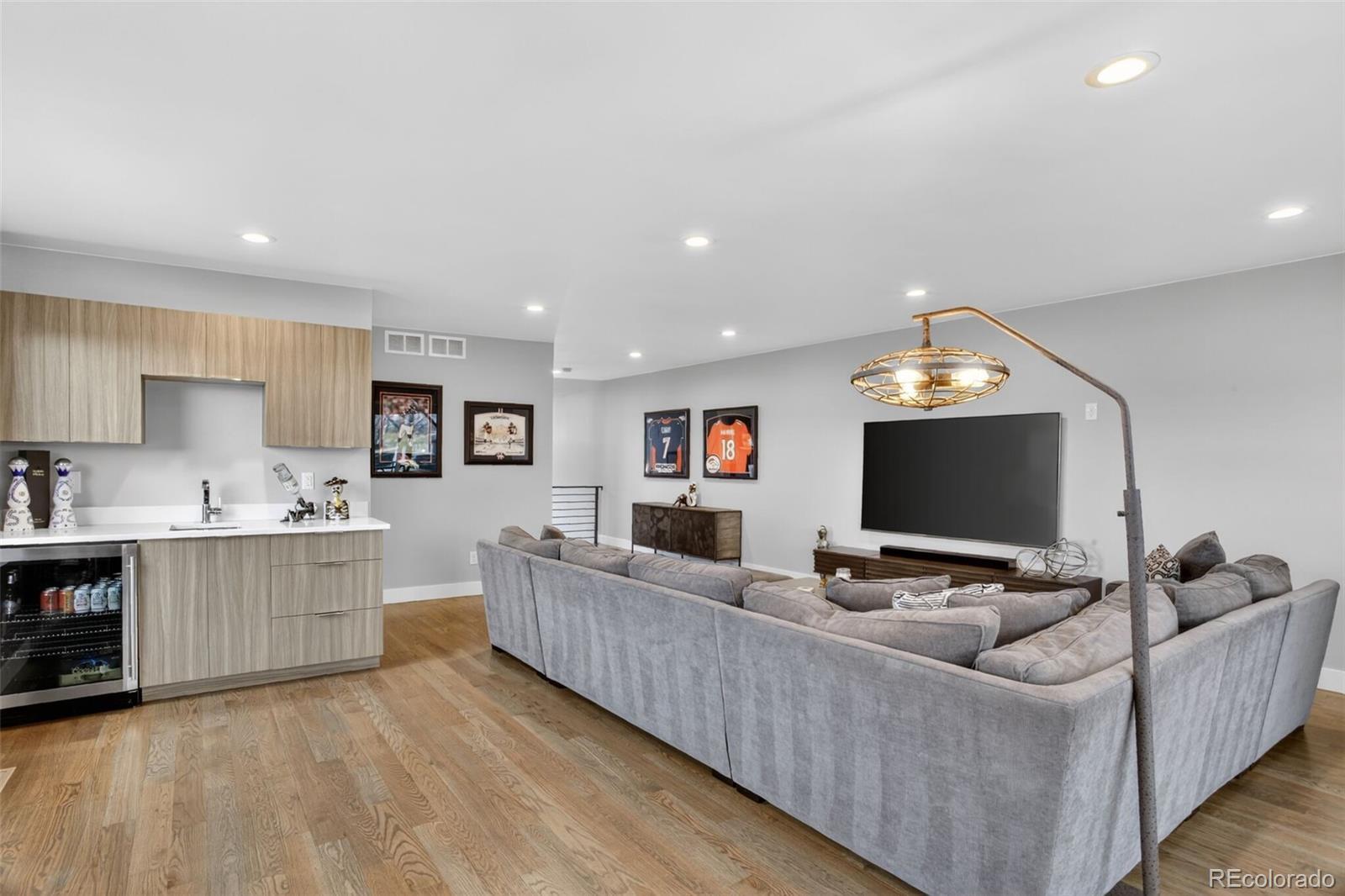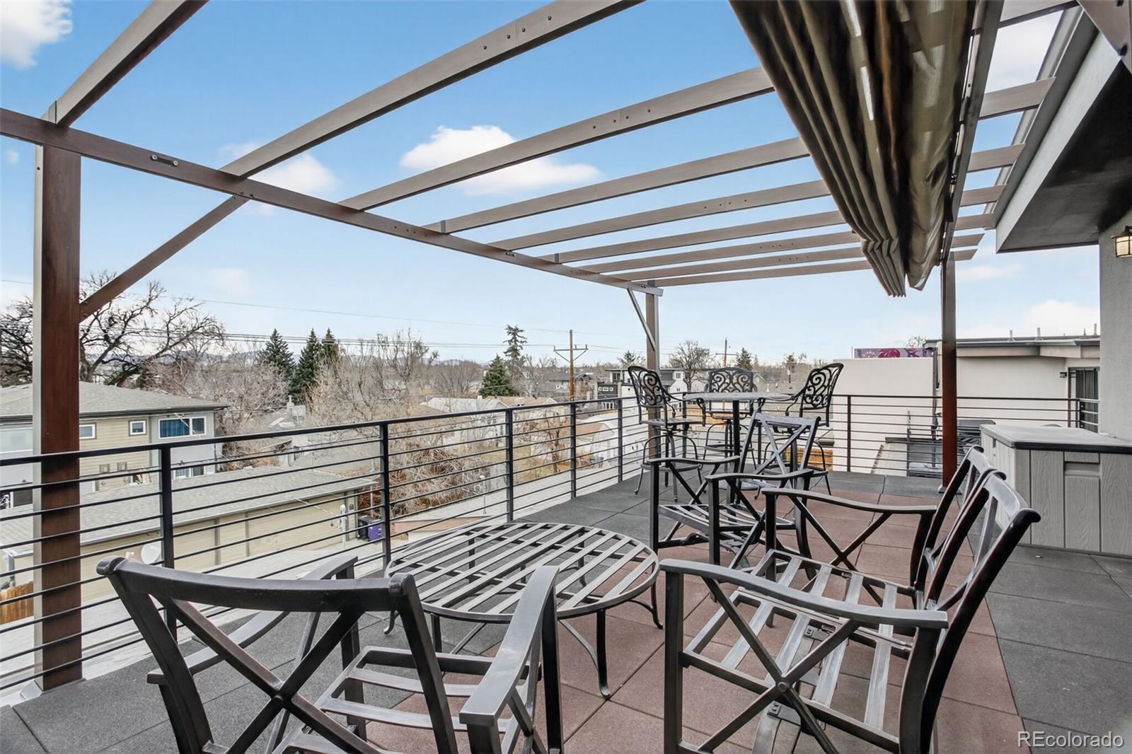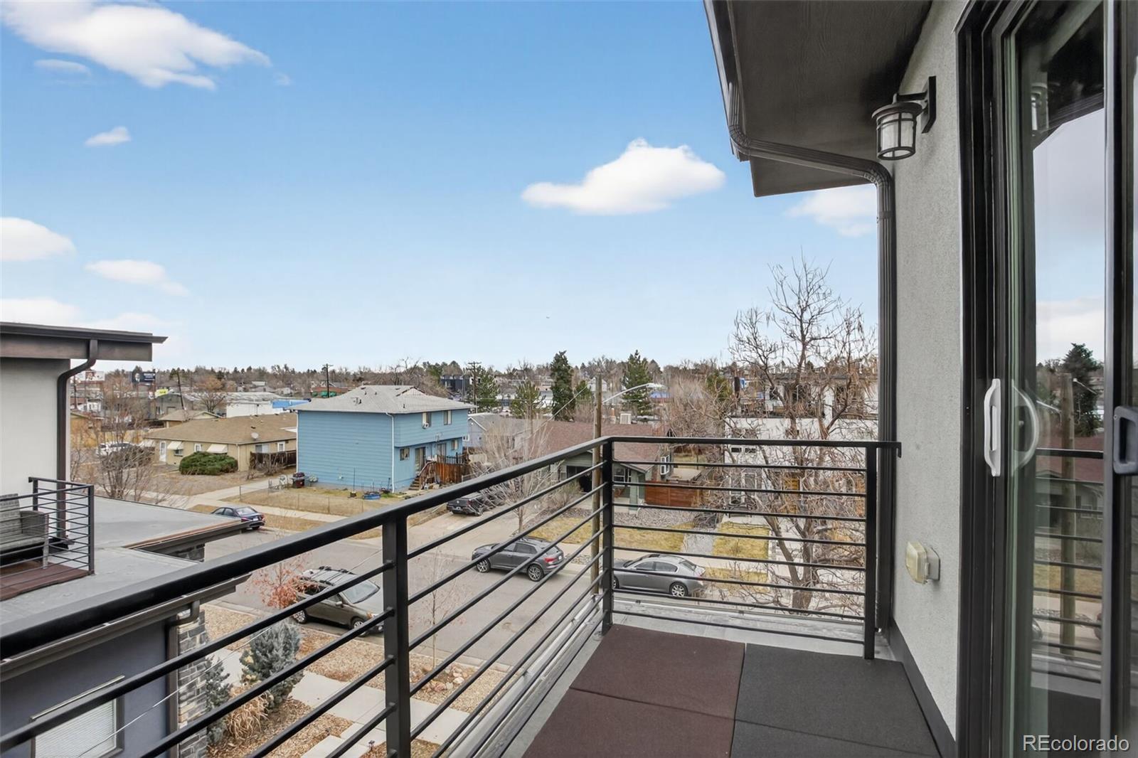 Stunningly beautiful three-story duplex with one of the largest floor plans in the area, including your very own three car garage and a fully finished basement! Richly stained hardwood floors flow seamlessly through the main level all accented by plenty of natural light streaming through various uniquely shaped windows. This open-floor concept features a contemporary kitchen with glossy flat front cabinetry, S/S appliances, a spacious quartz topped center island, complete with pendant lighting, a walk-in pantry, custom tiled backsplash and streamlined gas stove hood vent. The family room features a wall of decorative floating shelves across from a nicely textured wood encased gas fireplace and mantel area. Tucked in the corner is a powder room along with easy access to your rear patio with built-in gas BBQ. The second level features the rear primary bedroom, complete with a spa inspired five piece ensuite bathroom with a stand alone tub, spacious shower, large walk-in closet and a private rear deck. Both secondary bedrooms feature Juliet-styled balconies and their own private full bathrooms. The full-sized laundry room is also conveniently located on this level, complete with a wash sink and folding table with plenty of storage. The third level features another bedroom/office with its own balcony, a 3/4 bathroom and a large rec room with a built-in wetbar and access to your roof-top deck with spectacular mountain views. The finished basement with 9' ceilings features another large room perfect for a gym, 2nd office, or Mancave along with a 5th bedroom and bath. Countless special features are found throughout the home and outdoor deck and patio areas, bringing outdoor fun in! Easy to maintain fully fenced yard off the 3-car garage (unheard of for a duplex) with a rear service door for added security. Located within easy walking distance to local coffee shops, parks and only minutes from Downtown Denver and light rail. No added cost of an HOA-Party Wall agreement.